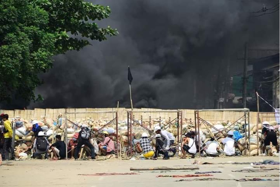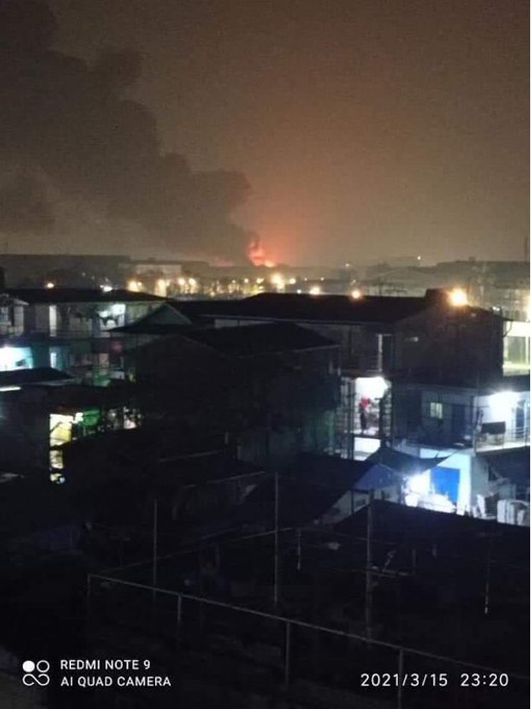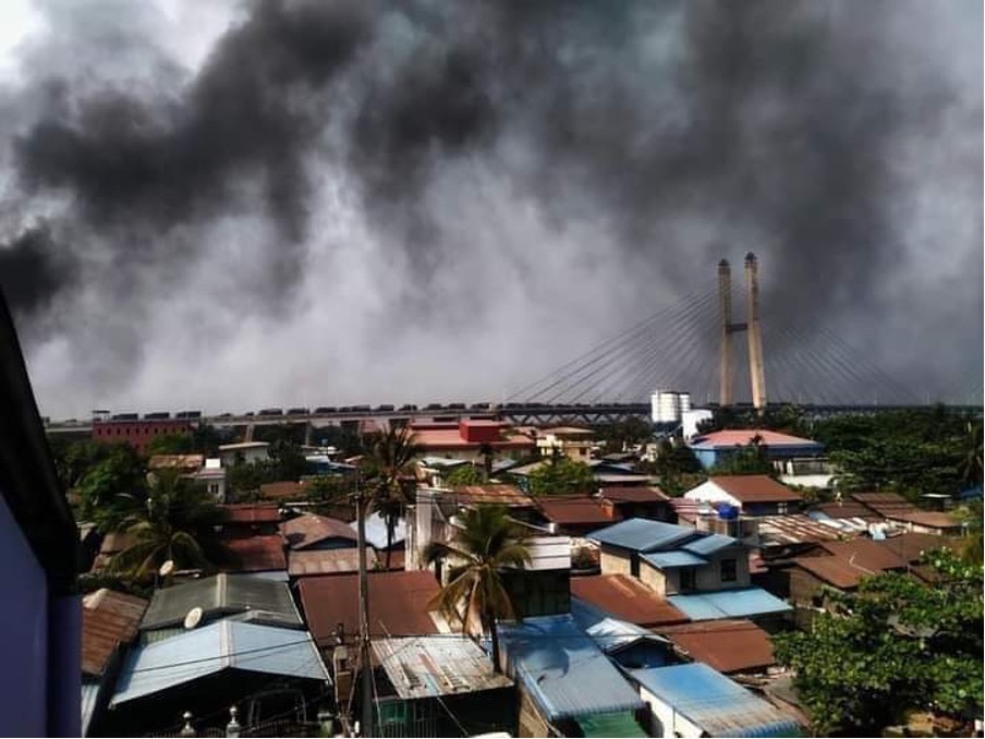 Army vehicles are crossing the bridge from Insei to Yangon Industrial zone at Hlaing Thar Yar. Fires are raging from factory blazes. There is debate about whether they were started by protesters or agents provocateur/military.