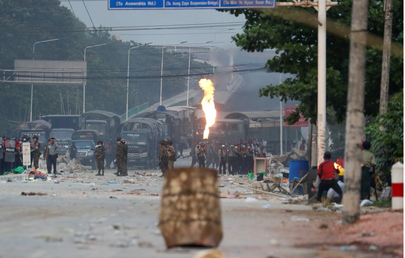 The protestors put up a token resistance against the Military to slow their entrance into Hlaing Thar Yar. They blocked the main road from the bridge.
