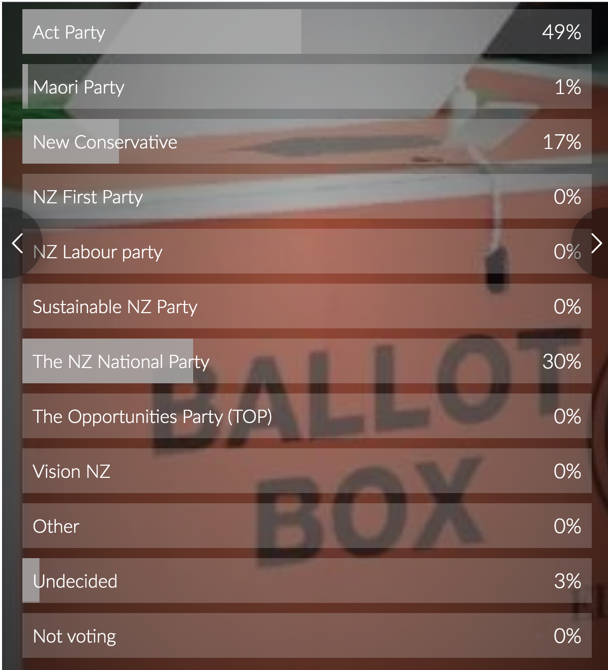 January’s poll results had the ACT Party as the clear favourite on 49% with National in second place at 30% and New Conservative in third place on 17%. The Maori party had 1% and 3% of our readers were still undecided. NZ First had no support from our readers at all in that poll.