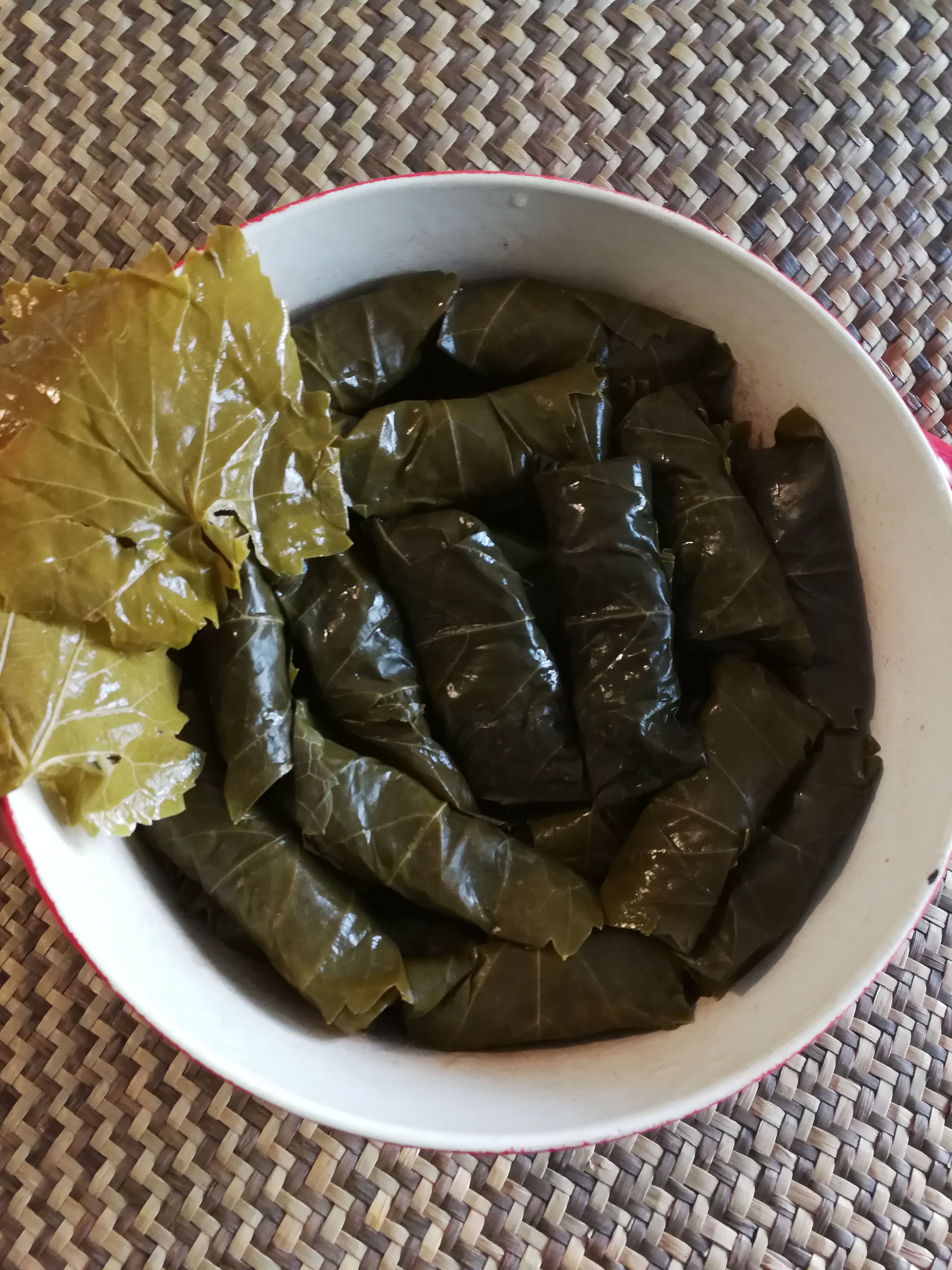 Place grape leaf on board with smooth side down. Place one heaped teaspoon of filling at the wide part of the leaf. Fold one fold from the base of the leaf towards the top of the leaf, fold in the two sides and tightly roll the remainder. Squeeze each filled leaf before place in pot to remove excess liquid and ensure the package is tight. Place the filled grape leaves starting from the outside moving in, end to tail, circle by circle. Do layers of filled grape leaves until the top of pot. Then place the remaining open grape leaves at the top, creating a layer.