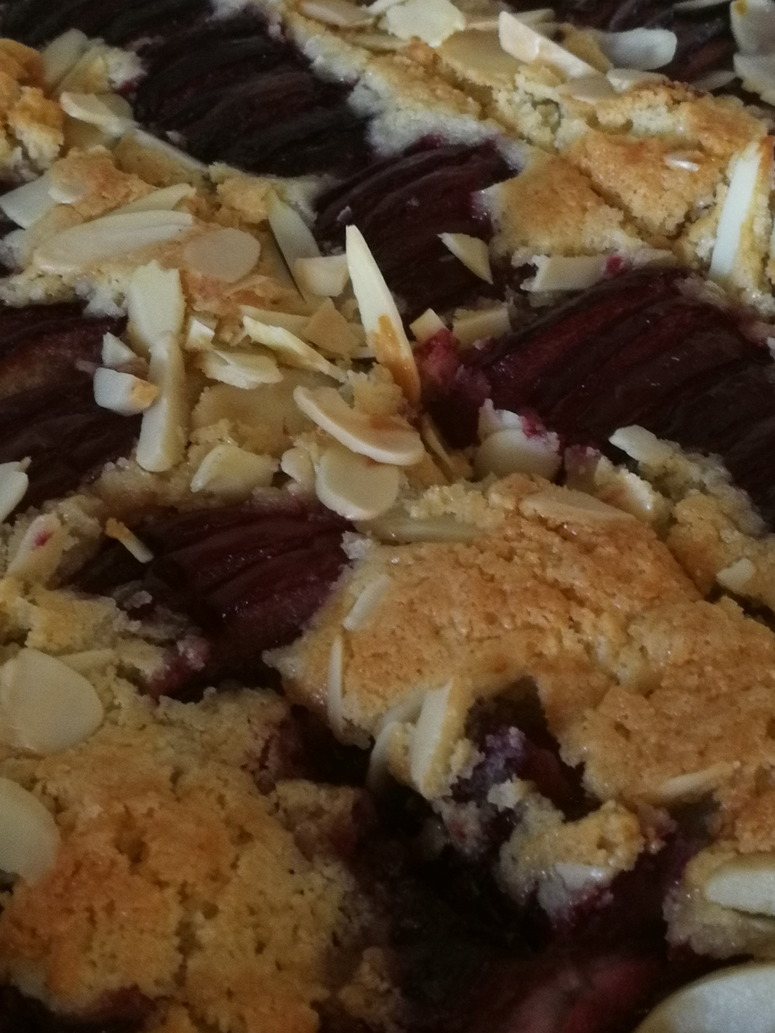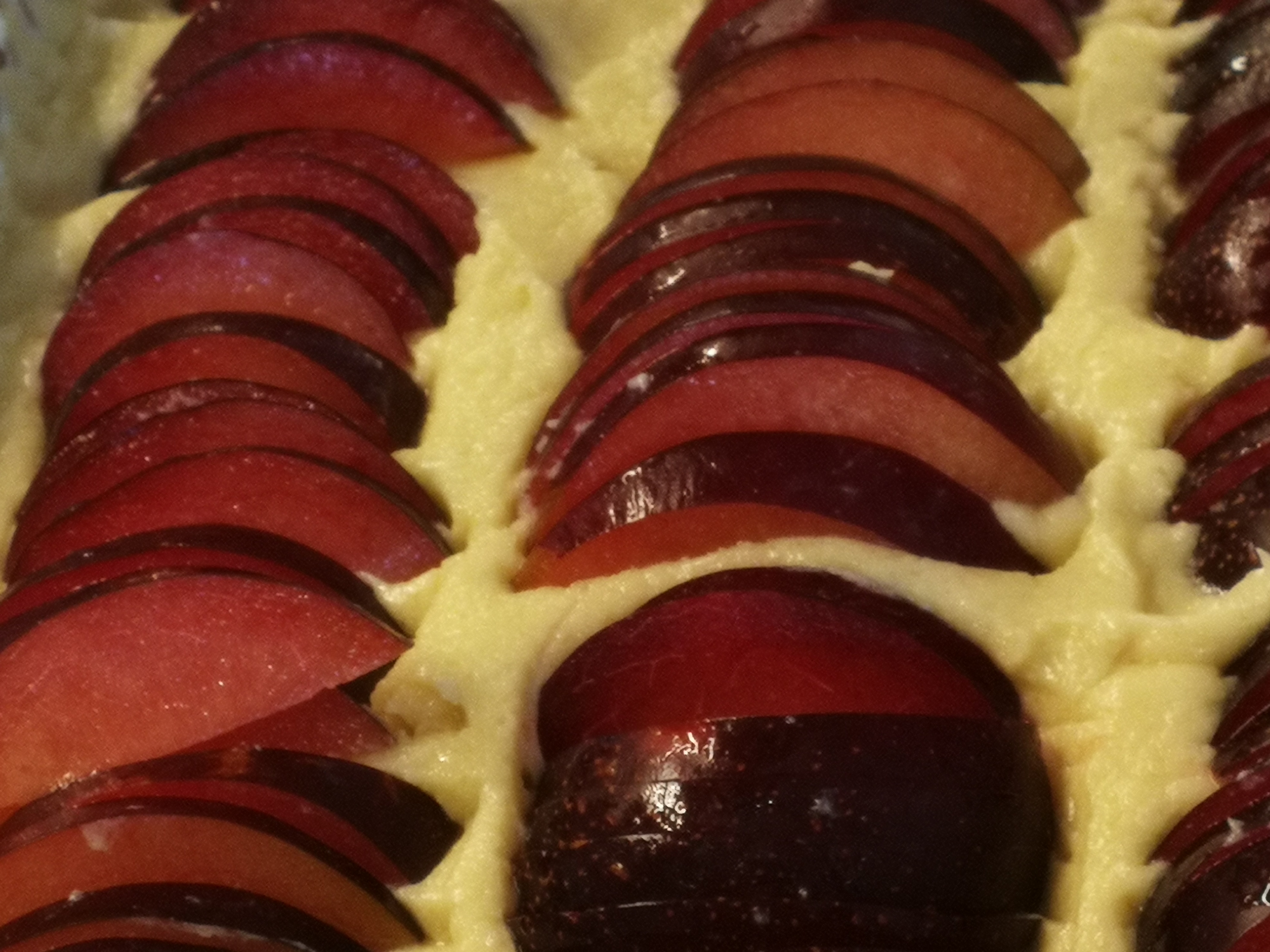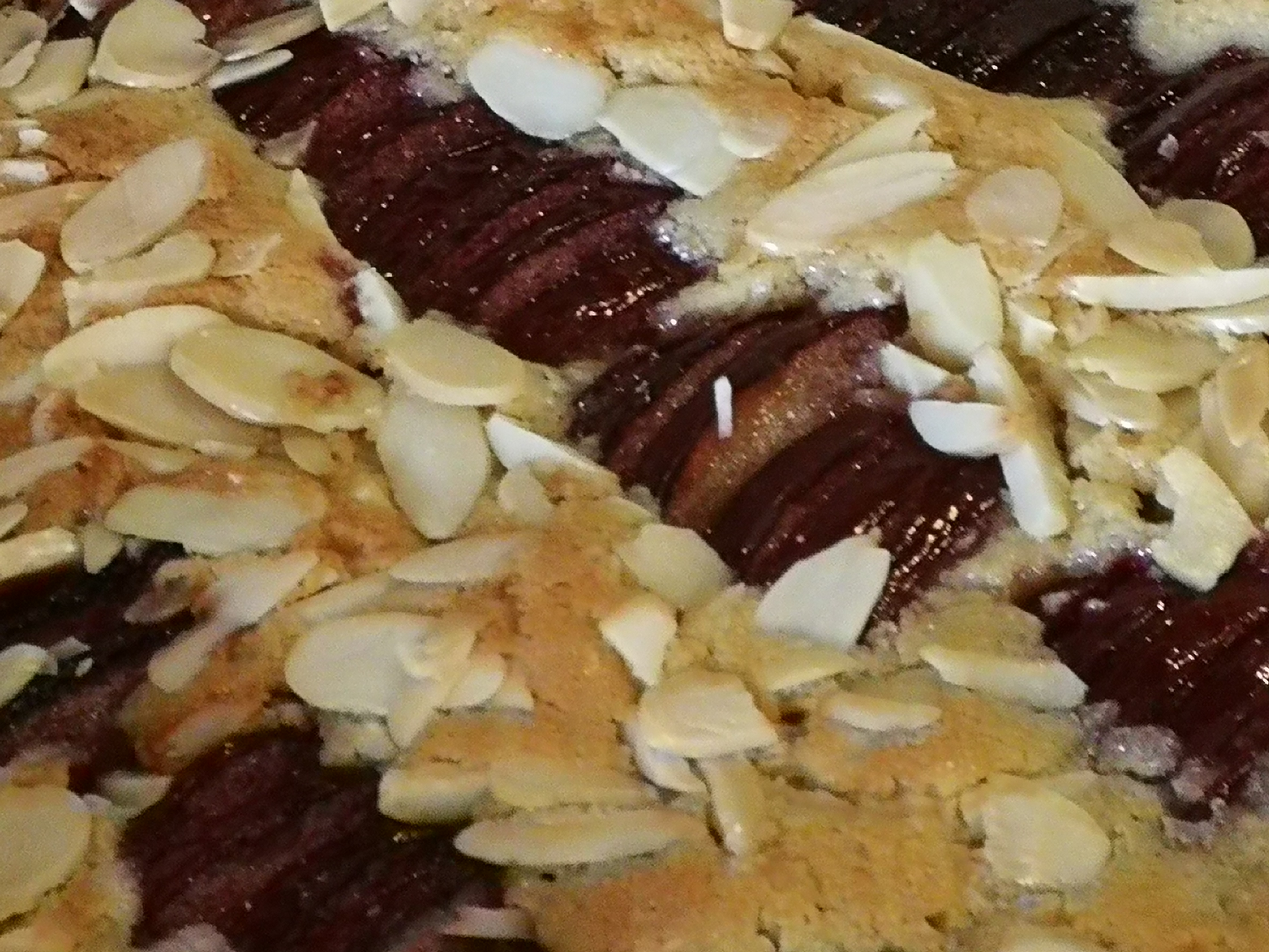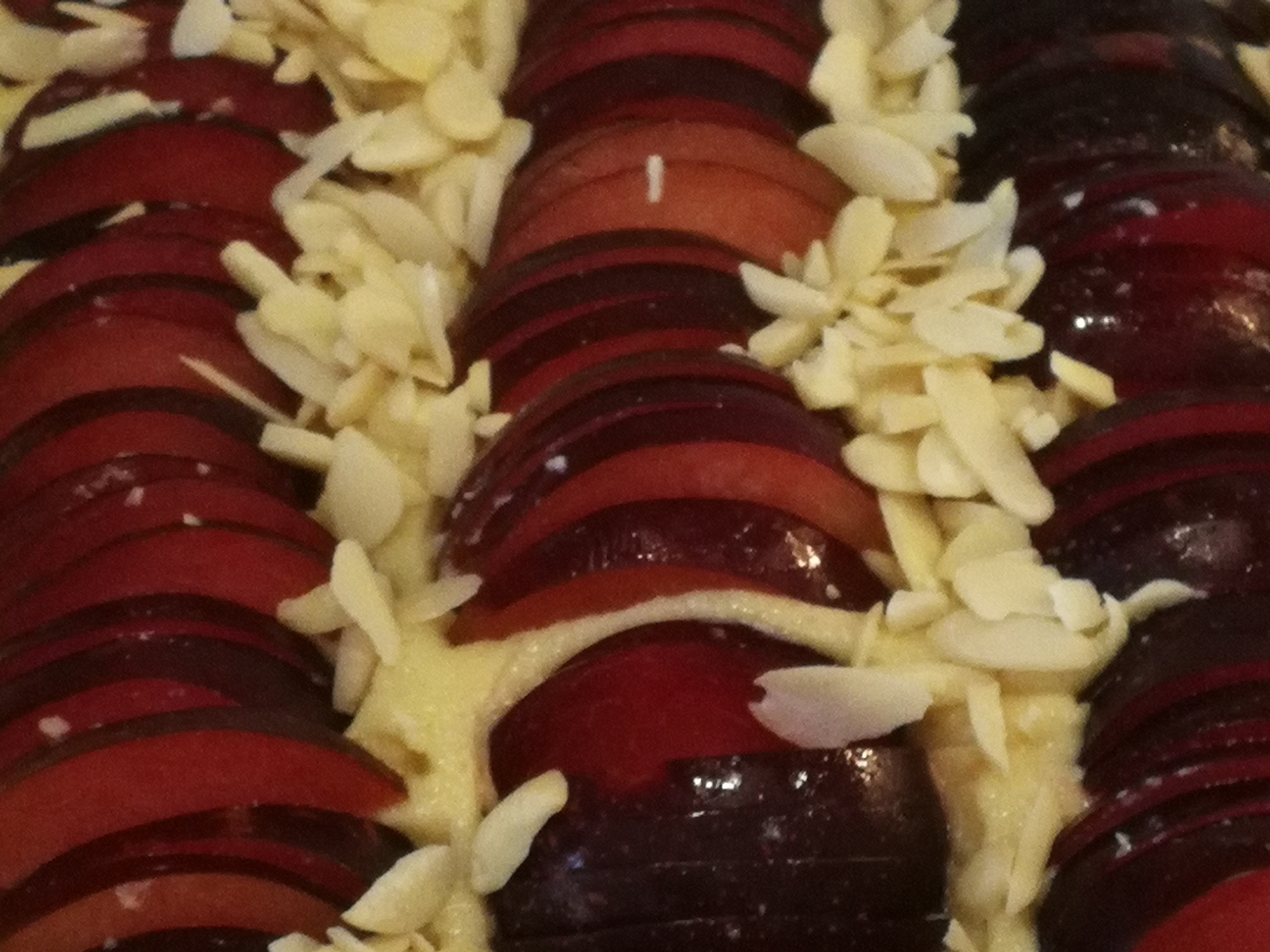 Take the fruit, wash dry and cut into 3-4 mm slices and arrange attractively, pushing gently into the mixture leaving a couple of centimetres above the mixture as the cake will rise. Once arranged sprinkle the sliced almonds over the mixture and around the fruit.