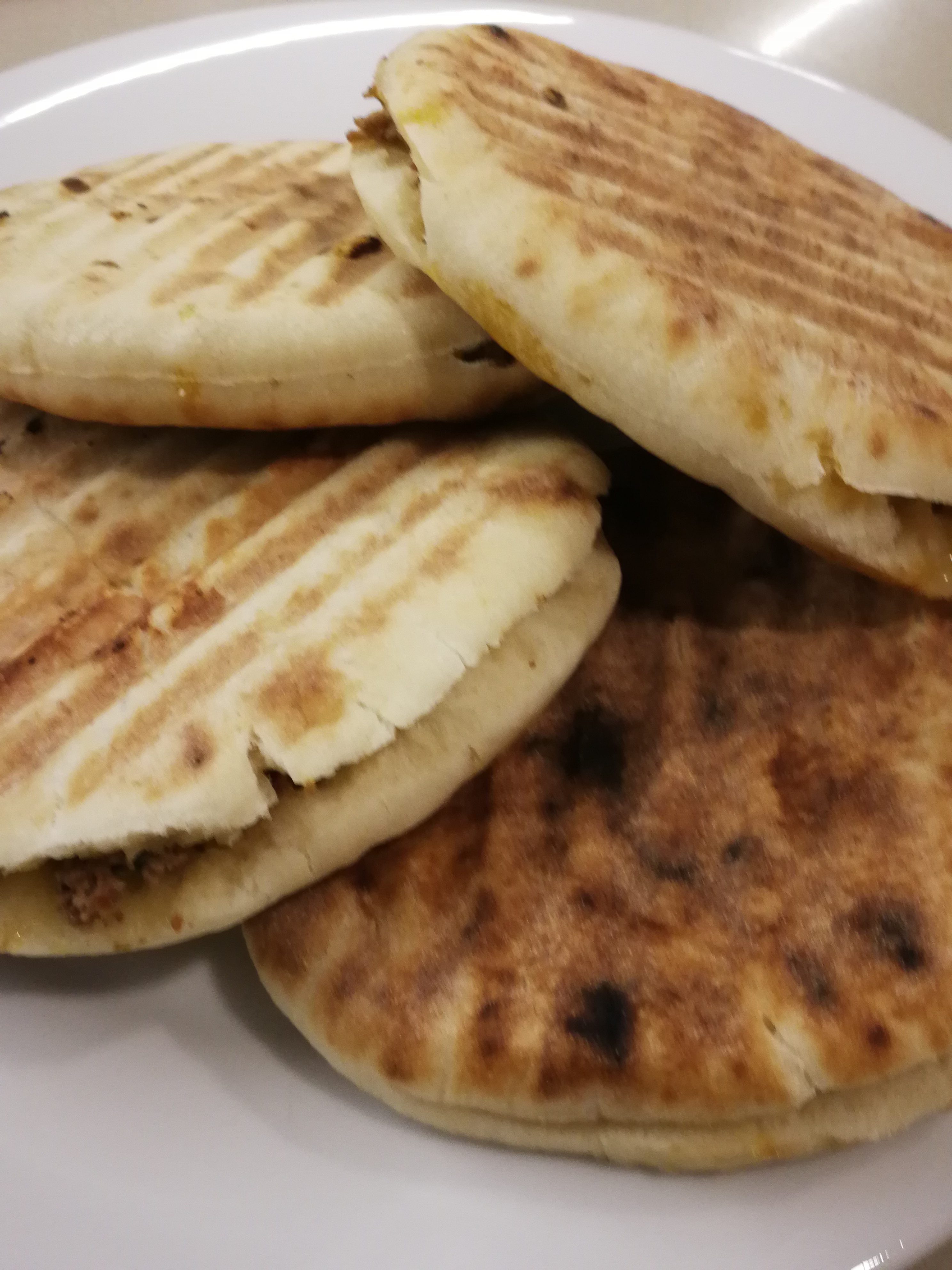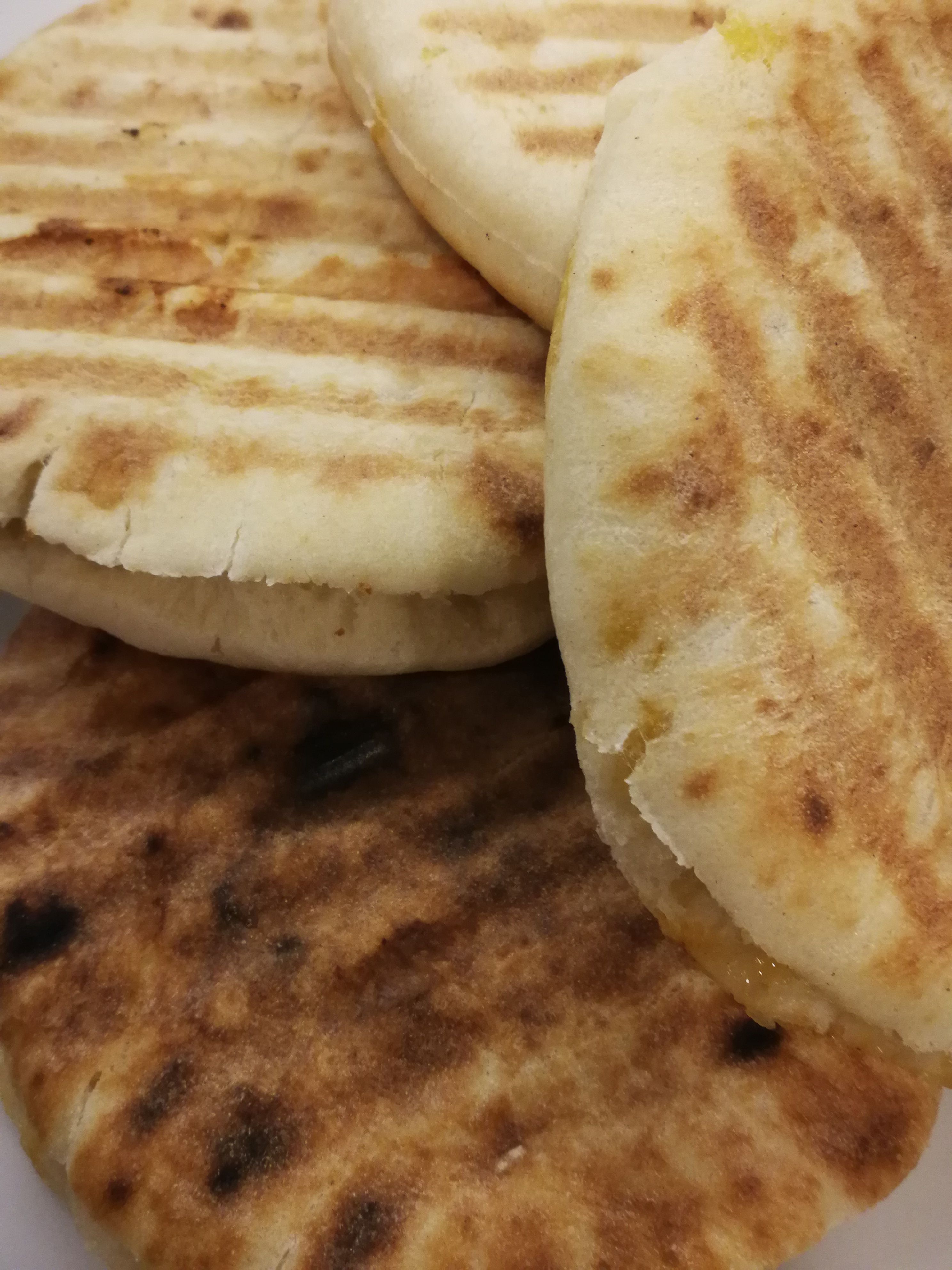 Brush lightly both sides of the pita with olive oil and either place on a grill with low heat or into a toastie maker, and cook until crispy on the outside and cooked on the inside.
