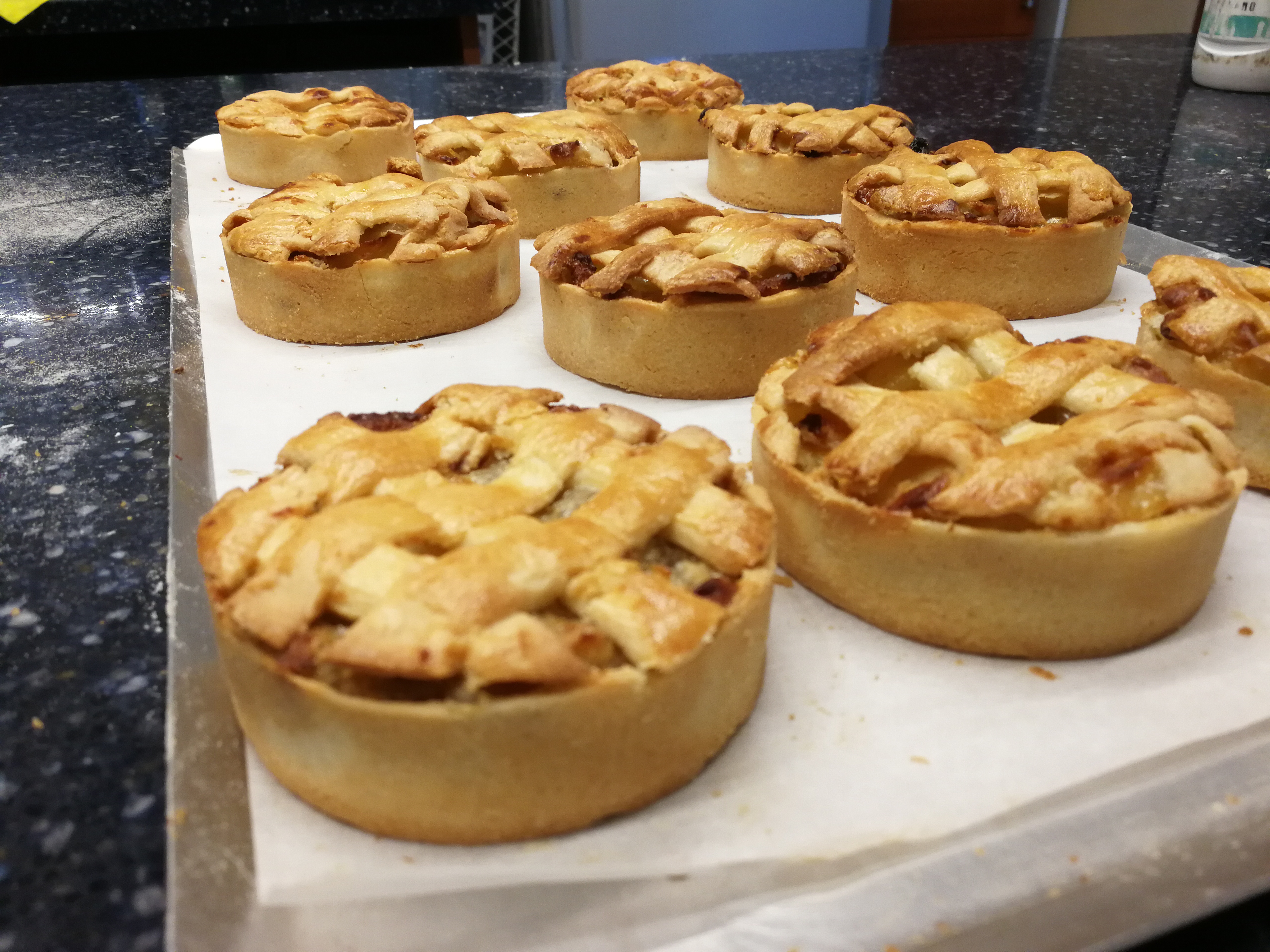 Spoon the apple filling into the pie shell of your chosen size. With what is left over of the dough cut into strips one centimetre wide to an appropriate length and place on top of the filling creating a lattice pattern of dough as in the pictures.