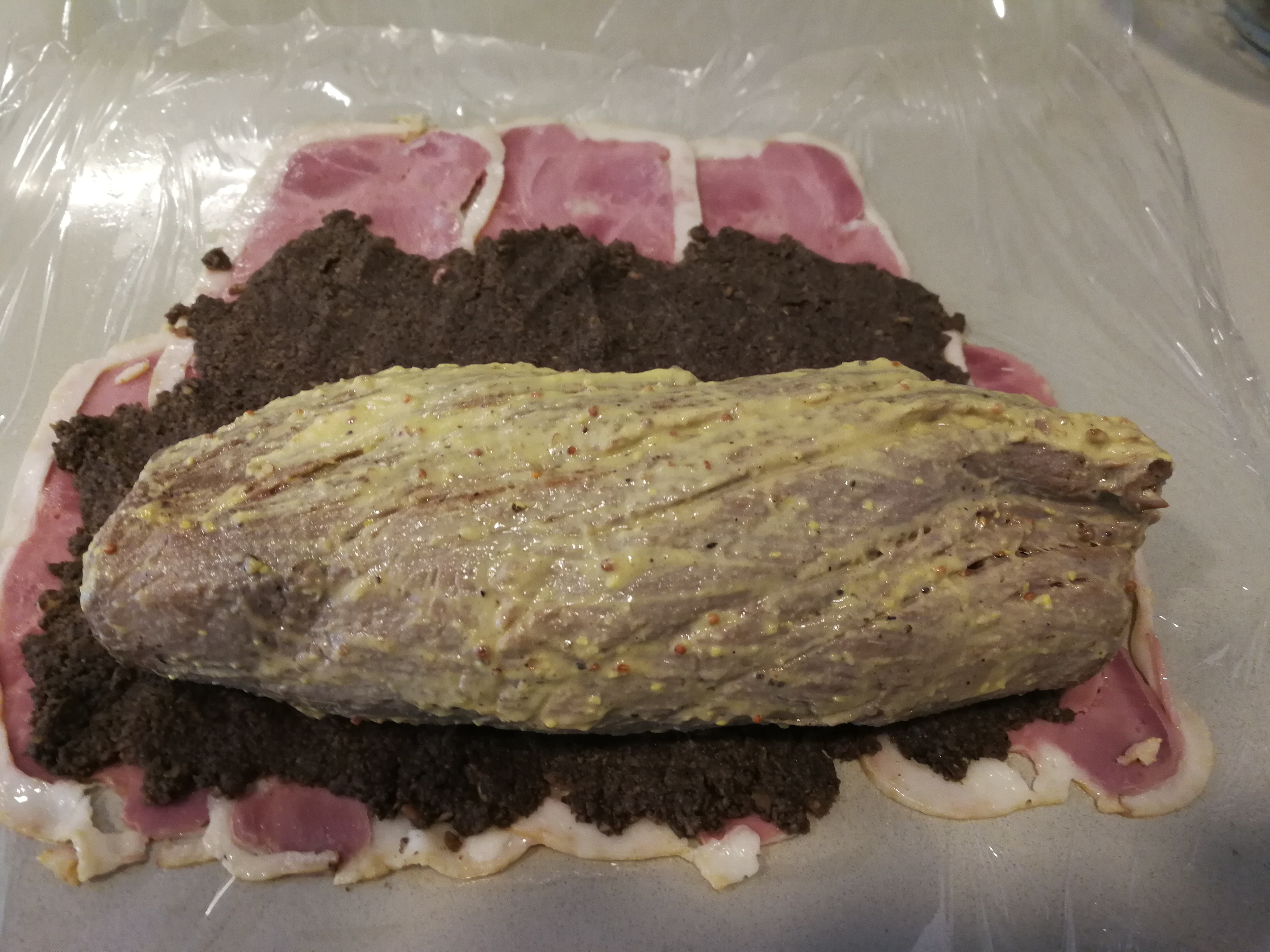 Second, take the fillet, if not trimmed and cleaned by the butcher or from the supermarket, trim off any excess fat or cut ends so that it is a tube of same approximate thickness. You don’t need expensive fresh fillet for this; you can buy frozen, which is usually half the price, and defrost in fridge from the day before. Put coarse salt and cracked pepper all over the fillet and put it into a very hot pan with olive oil to close and brown the meat on all sides including the ends. Remove from pan, lavishly rub English mustard all over the portion of meat and set aside.