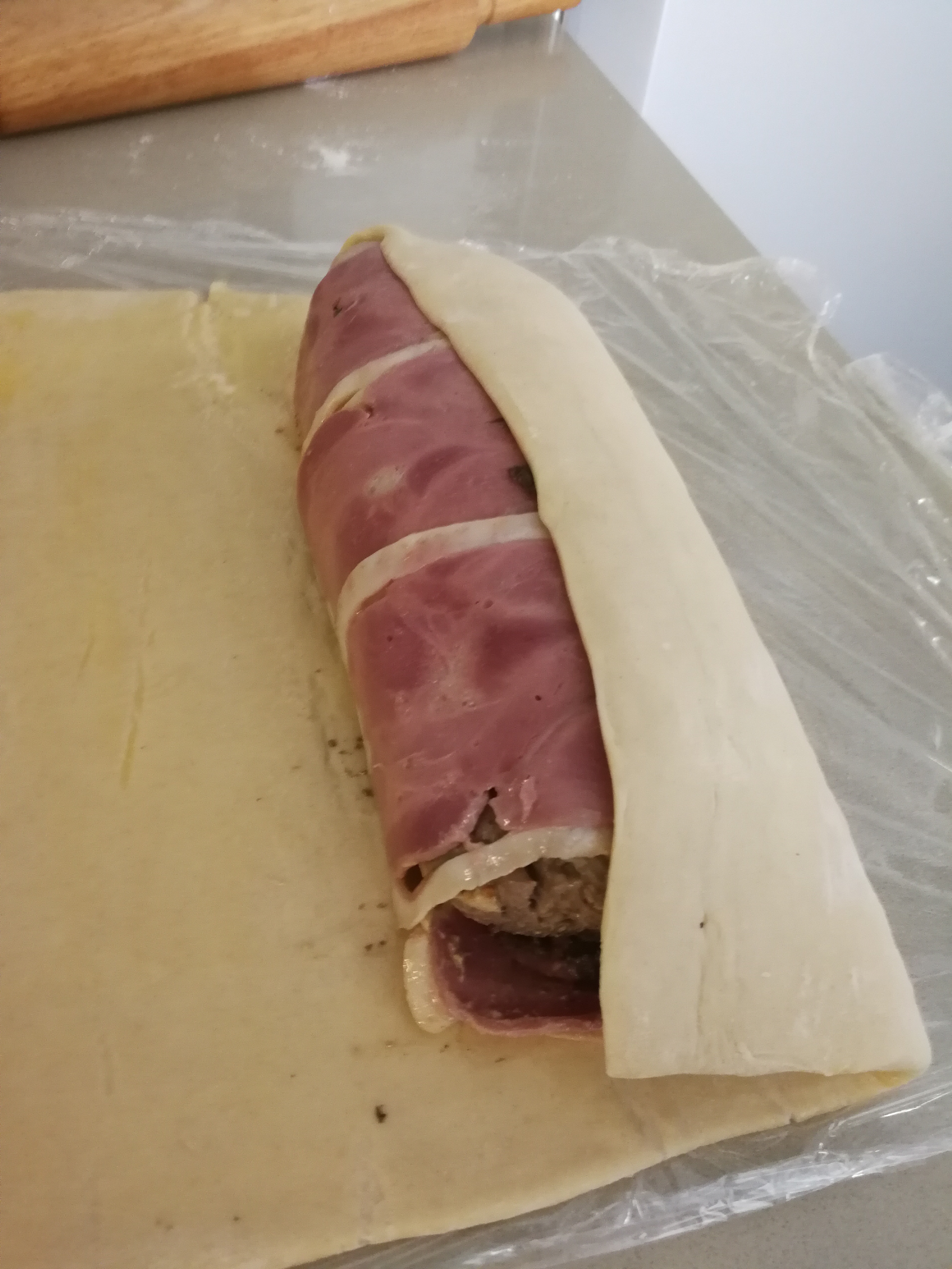 Third, place the prosciutto or smoked duck on a large square of cling wrap in a large rectangular shape, spread the duxelles over the prosciutto, then place the fillet on the duxelles on the edge closest to you, and roll up using the cling wrap to keep everything tight and together. Close tight at both ends and tighten to create a large sausage. Twist the two ends of cling wrap in opposite directions to tighten the bundle.