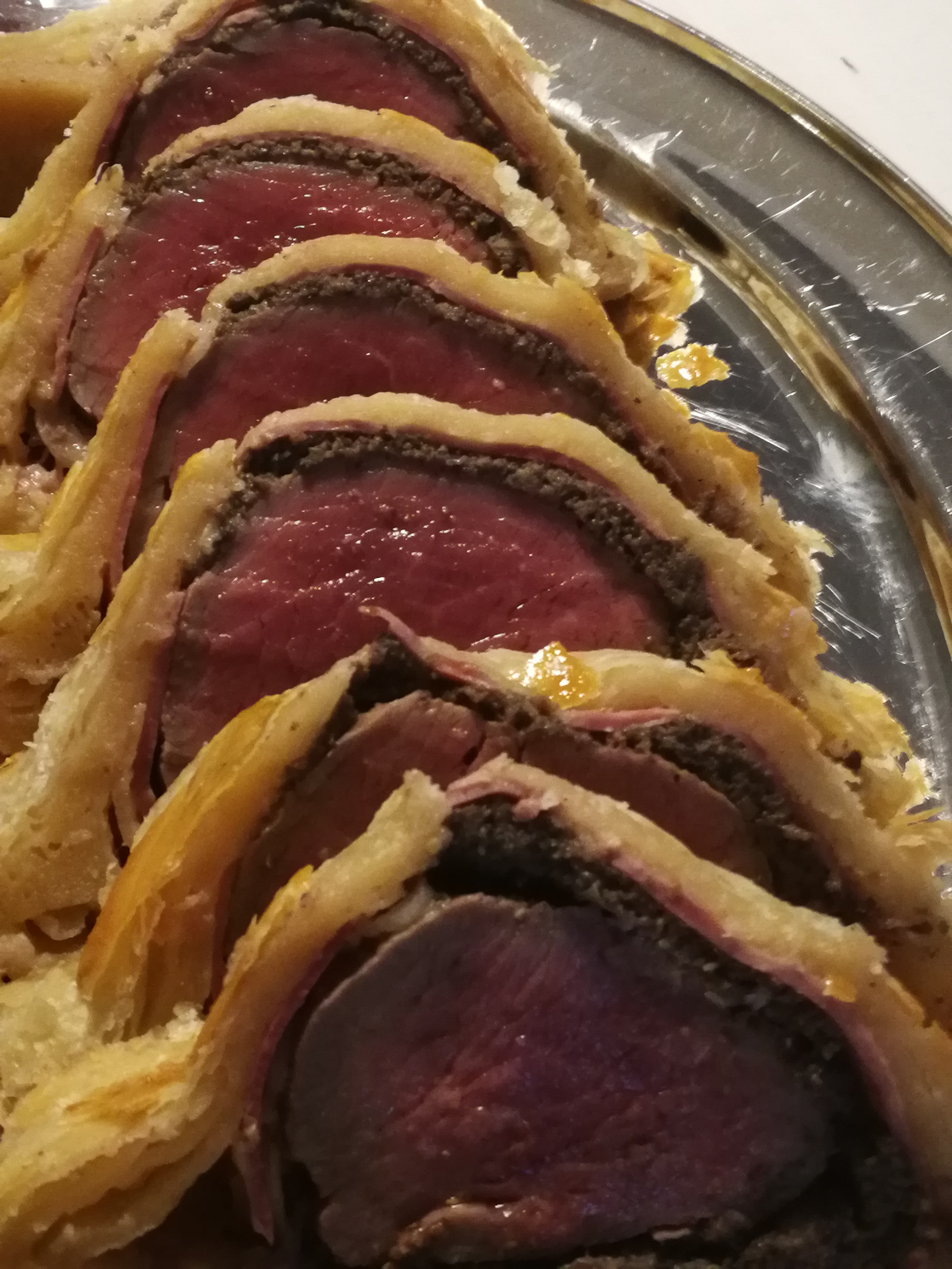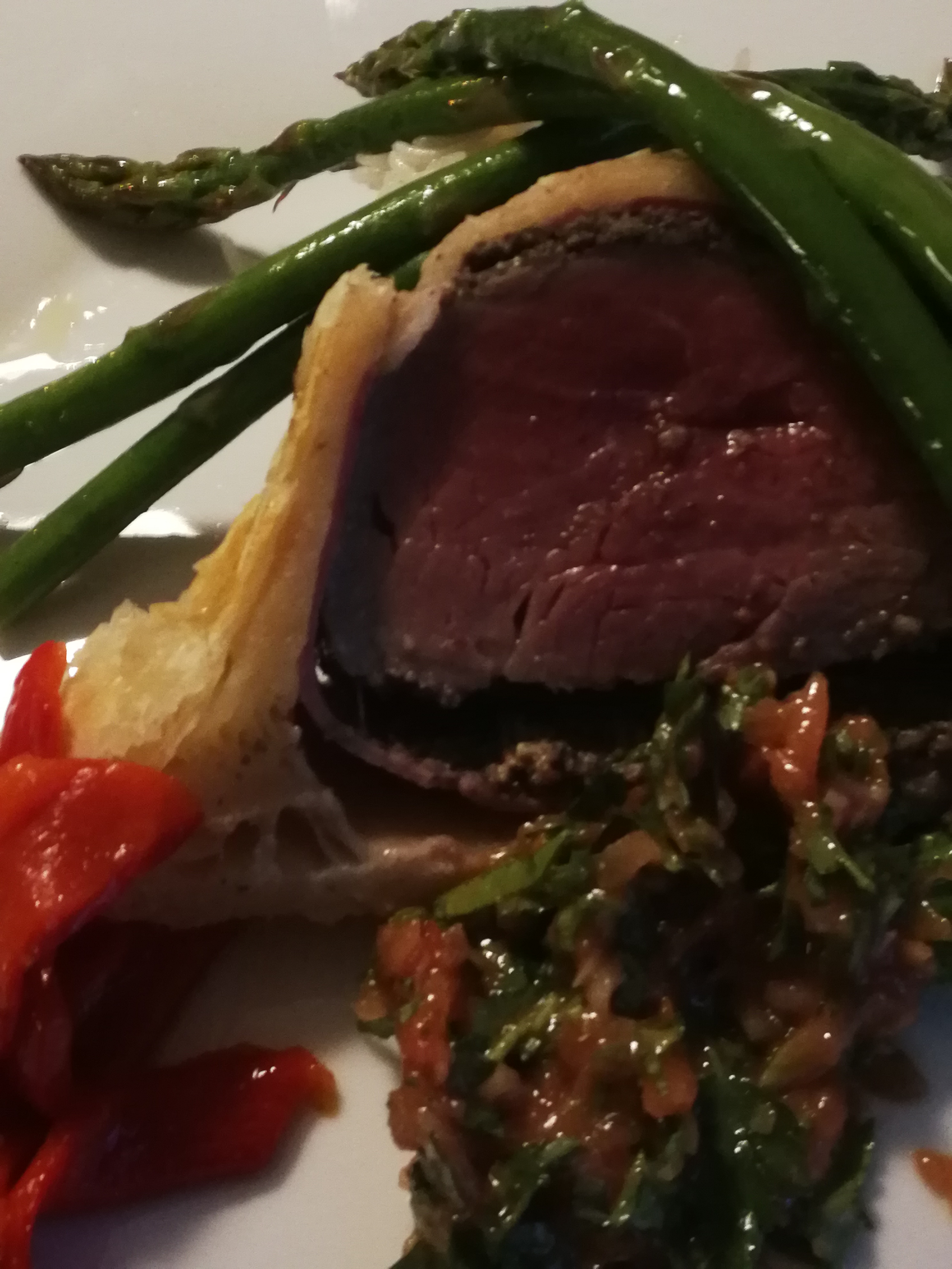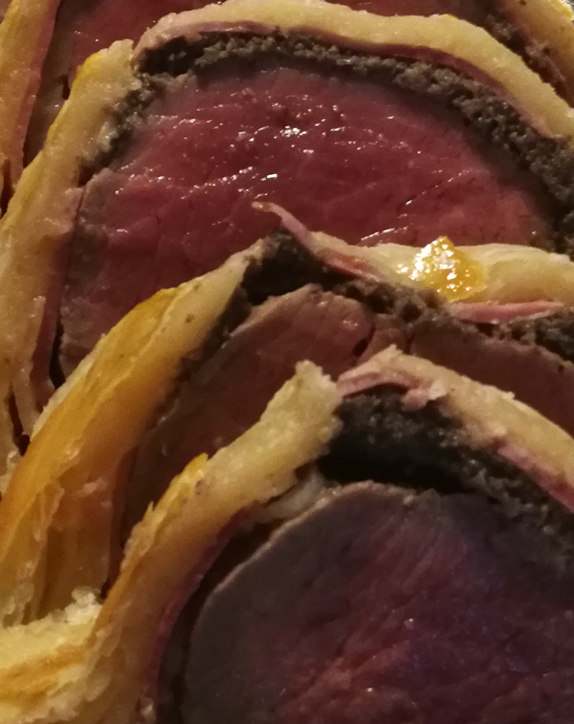 To accentuate the flavours and really make a layered and intense tasting experience the tenderloin of beef is wrapped in a layer of prosciutto and duxelles (finely chopped mushrooms fried off to remove all liquid) before being encased in the mille feuille. Being a Heb. I exchange the prosciutto for thin slices of smoked duck breast, retaining that cured smokey hint and not taking away from the overall flavour.