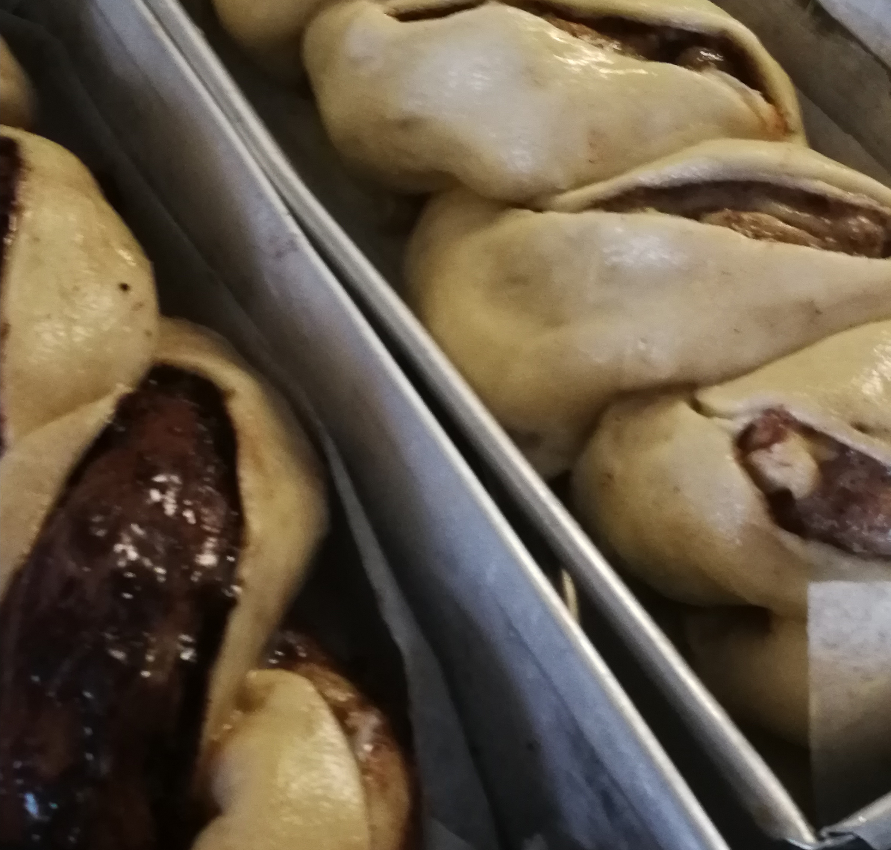 Starting at each end of the dough, roll towards the centre finishing with two similar sausages of filled dough, still connected. Gently with a knife cut between the two rolls and then cut along the the top of the roll about a centimetre into the dough.