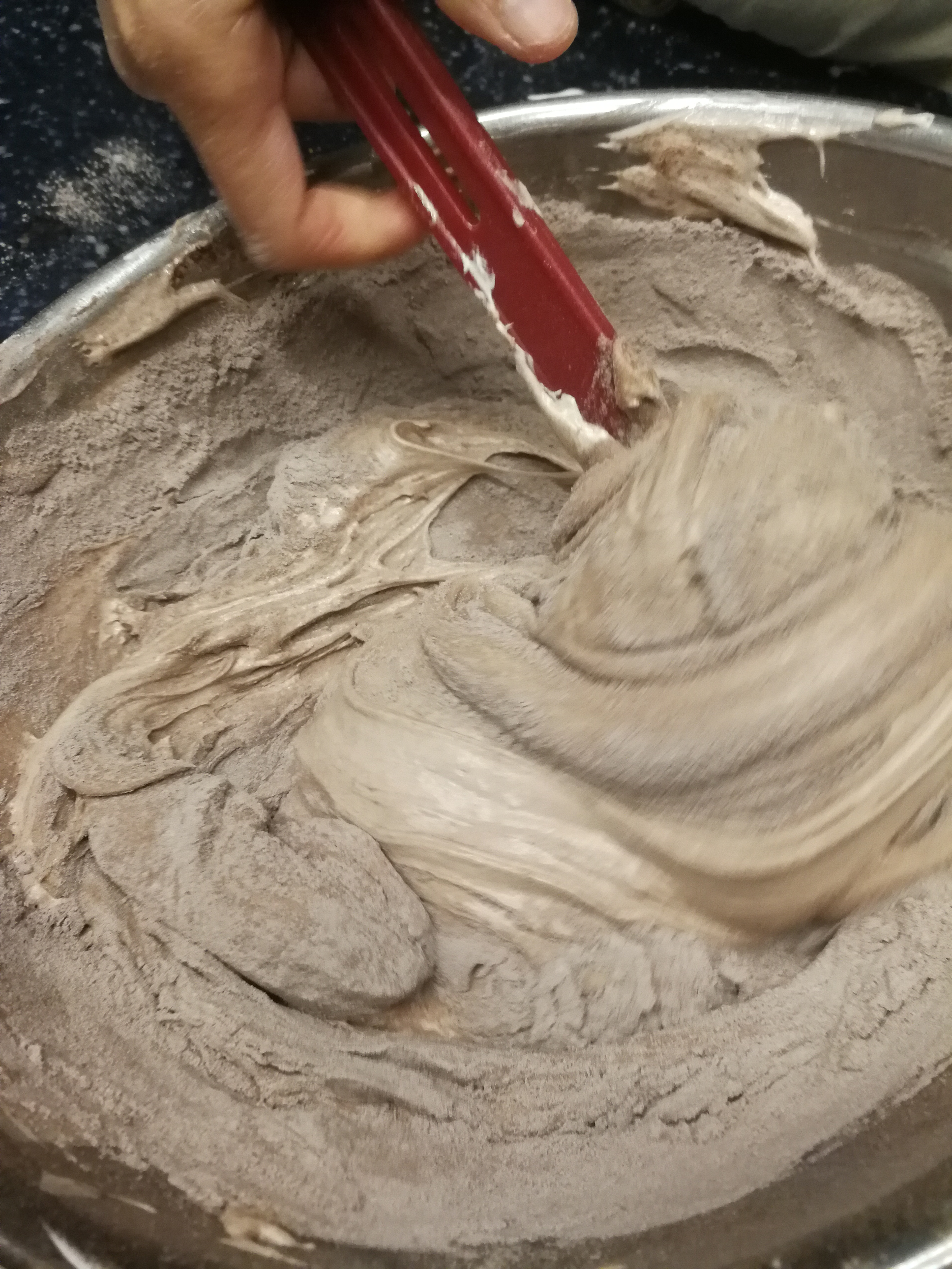 Part three: Mix the flour, cornstarch and cocoa together and then gently mix it into the combined mixture of egg whites and yolks.
