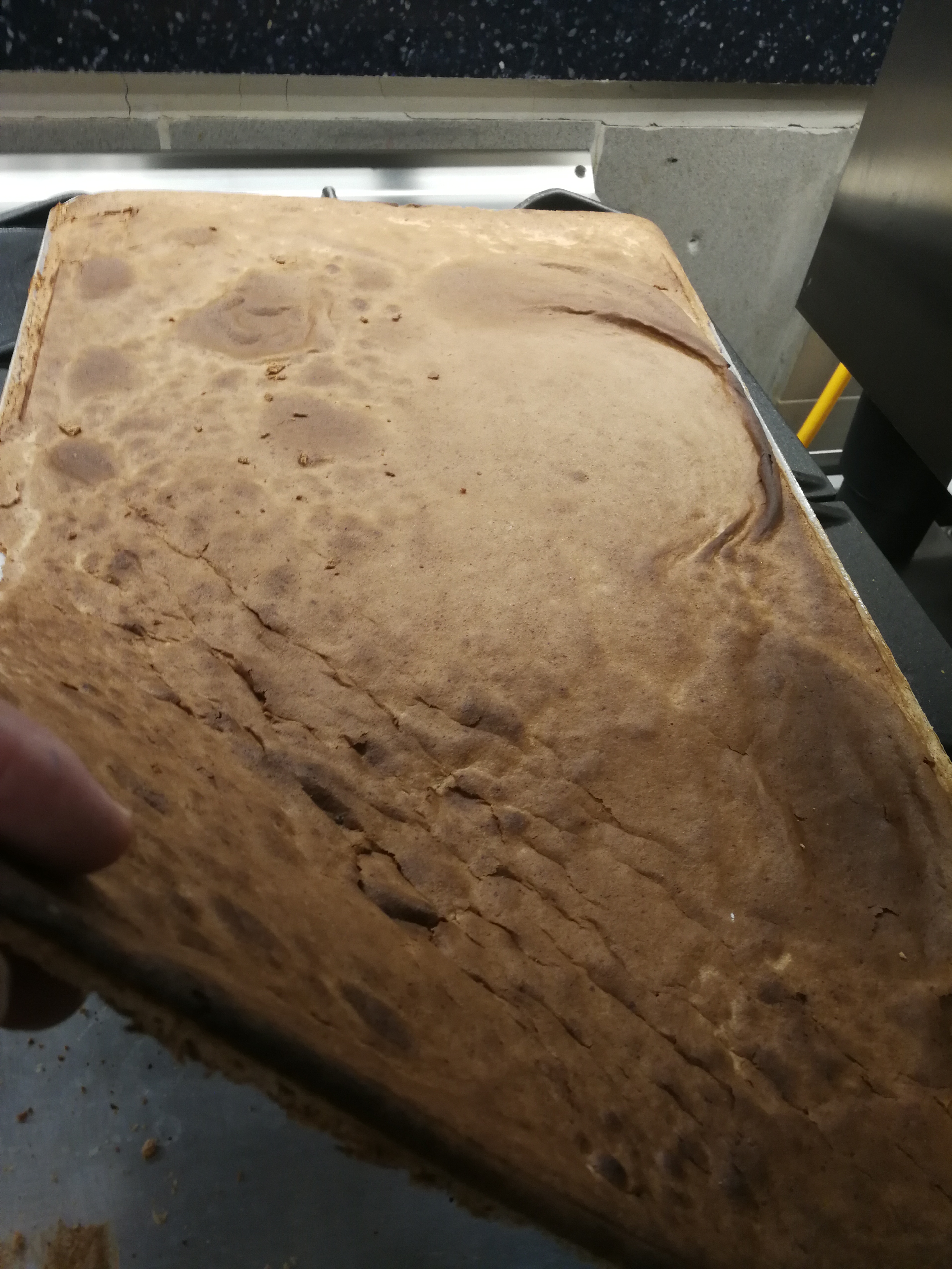 Take several oven trays, put a spot of the torte mixture in each corner and press the baking paper down on the spots, this will ensure the baking paper doesn’t move when levelling the mixture. Pour equal amounts of the mixture onto each tray. Using a metal spatula spread it evenly; it should be about 1 cm thick.