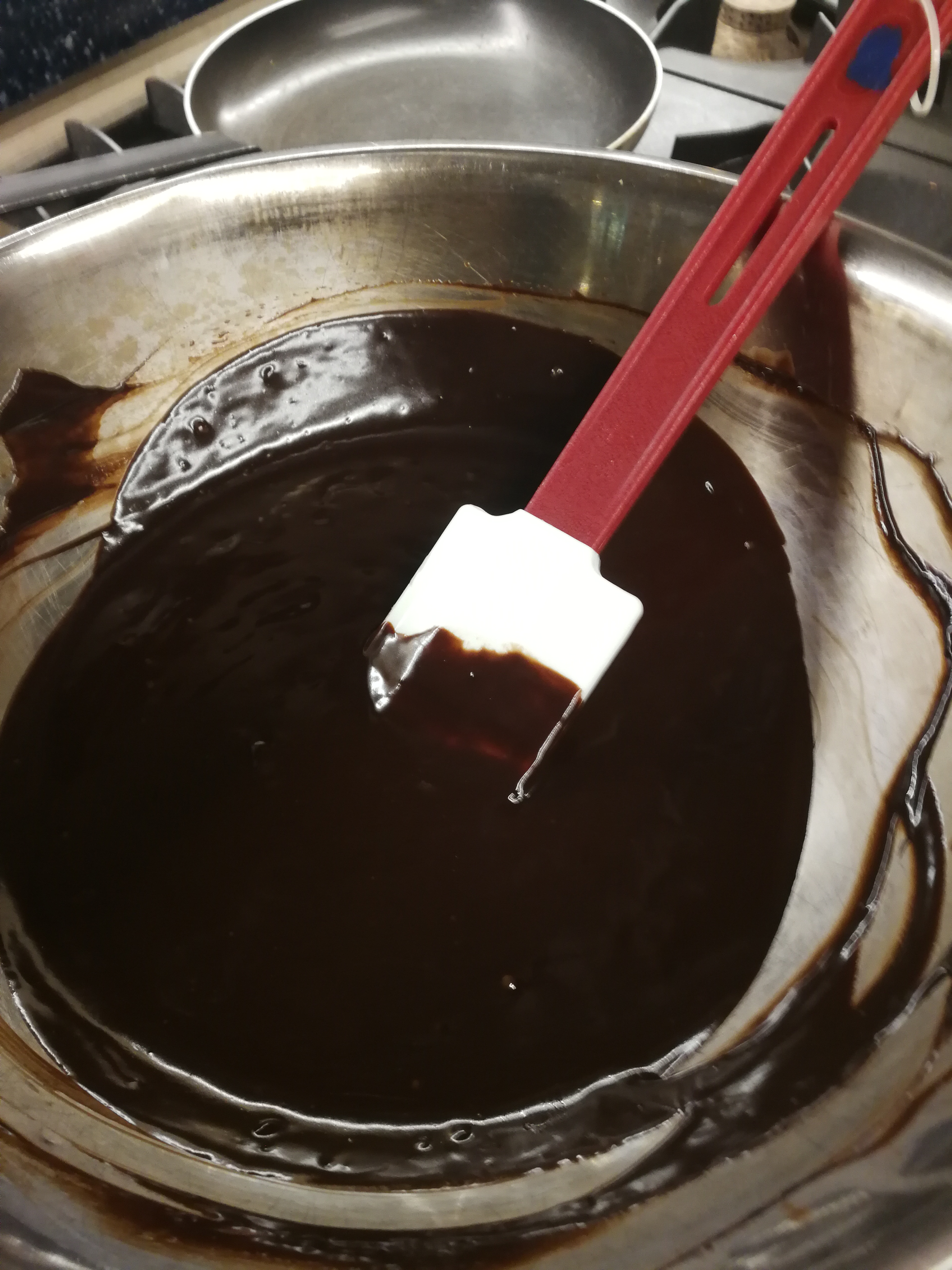 Put remaining ganache in a bowl on bain-marie and ensure it is thoroughly melted, turn gas off leaving the ganache mixture in the bowl on the steaming bain-marie.