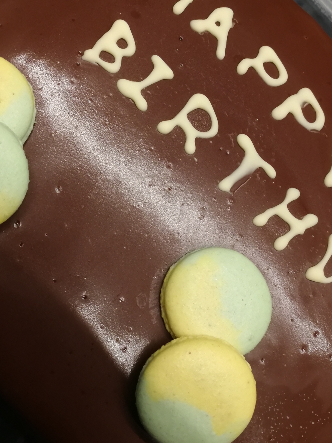 Remove the layered torte from the freezer once frozen, remove the baking paper from the top, cut edges of torte so they are even and square, place the torte on a rack over a tray with a sheet of baking paper in the tray to collect run off liquid chocolate, pour the hot liquid ganache into a pouring jug and pour over the torte quickly. Pour over the middle and then around the edges, ensure all the exposed torte is covered. Because the torte is frozen the ganache will harden quite quickly.