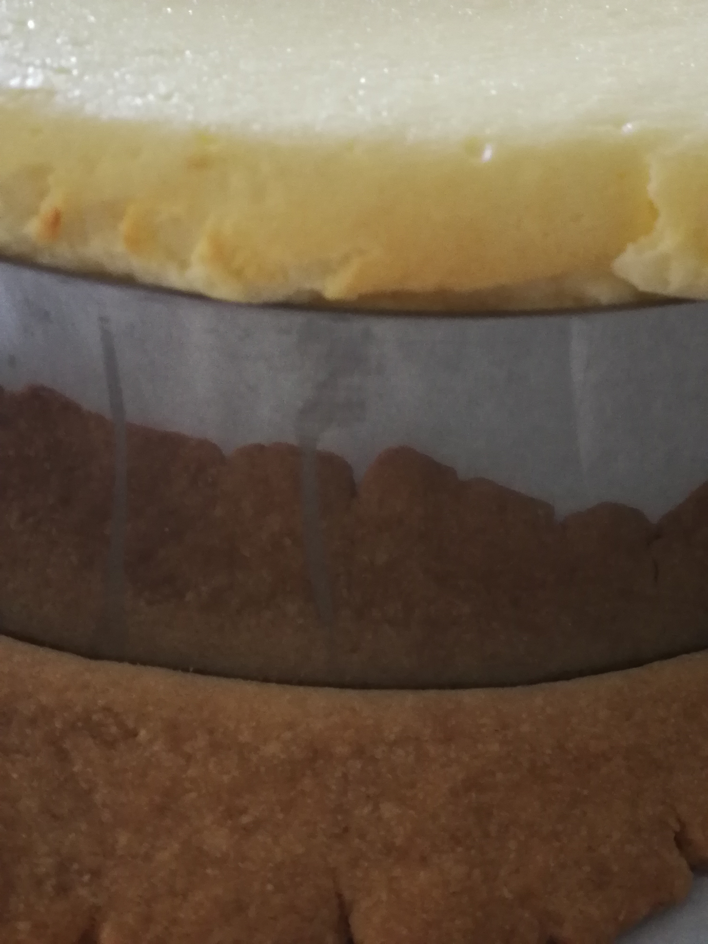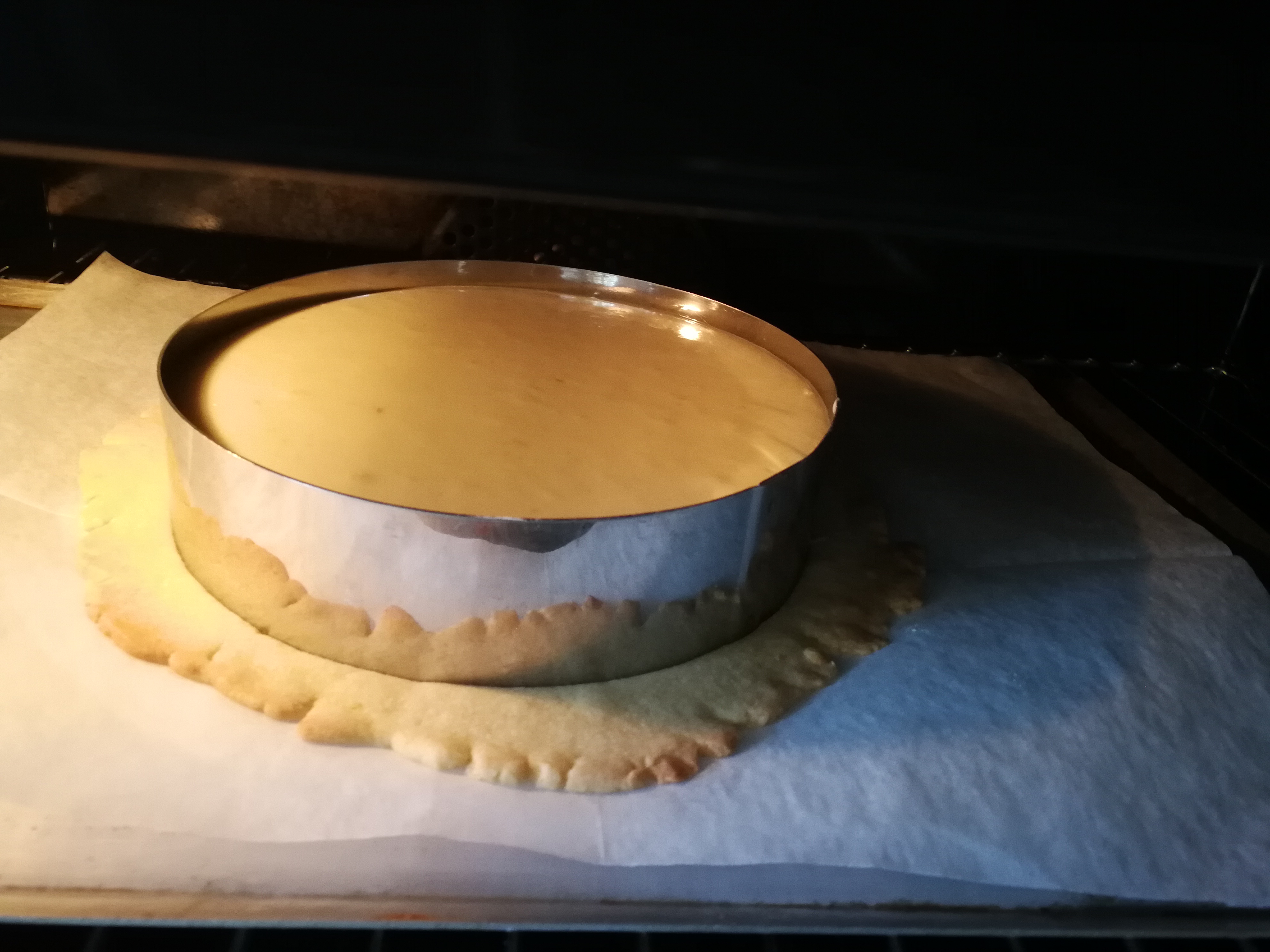 The cheesecake can be made in any form desired. First place baking paper on the baking tray or in cake tin, roll out and place down the short pastry base, put in fridge.
