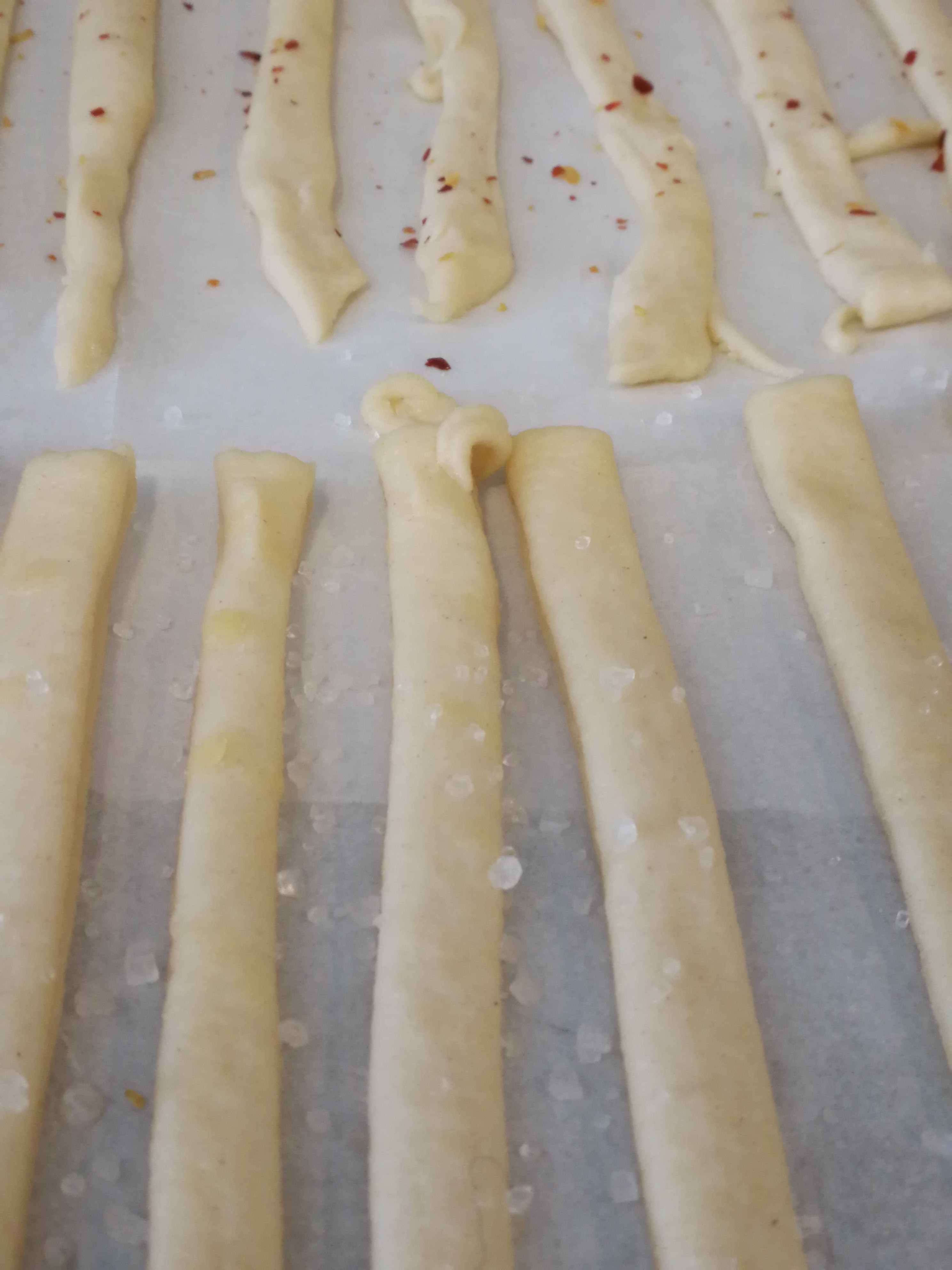Once risen, roll out into a large rectangular shape to thickness of about 5 millimetres. Ensuring surface is well dusted with flour, using a pizza wheel (cutter), cut into grissini size sticks. Brush with water, sprinkle with your choice of topping, place on baking paper on an oven tray and leave to rise for an hour.