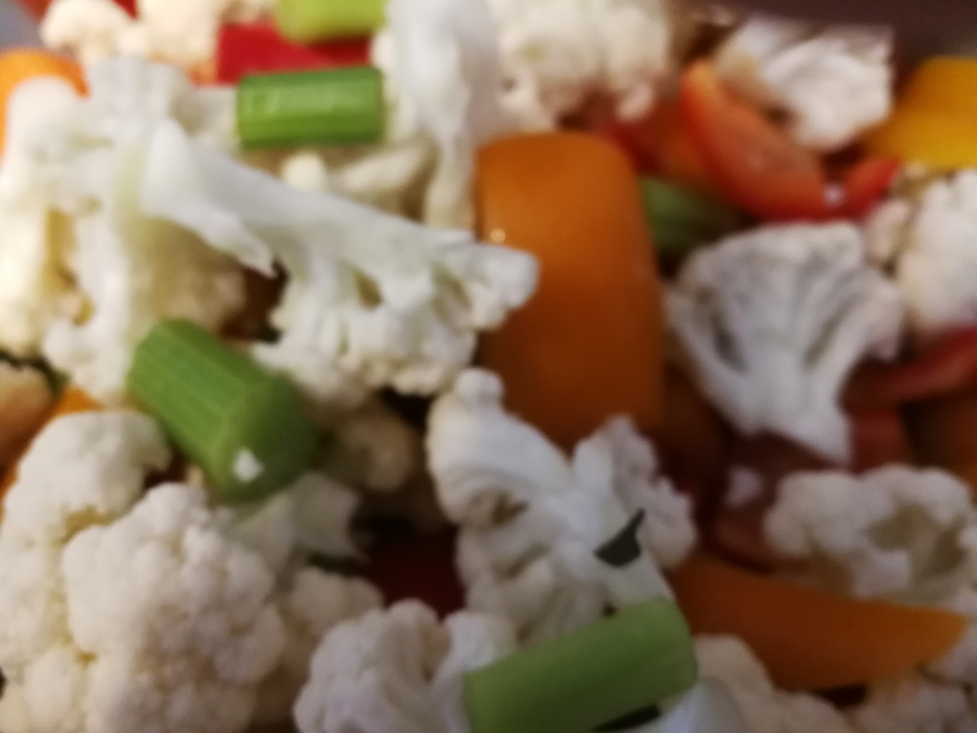 Cauliflower wash and separate into small bouquets, place separately in a colander and sprinkle some coarse salt over it to coax out and kill any slugs or bugs that may be hiding within. After ten minutes, dust off salt and add to the rest.