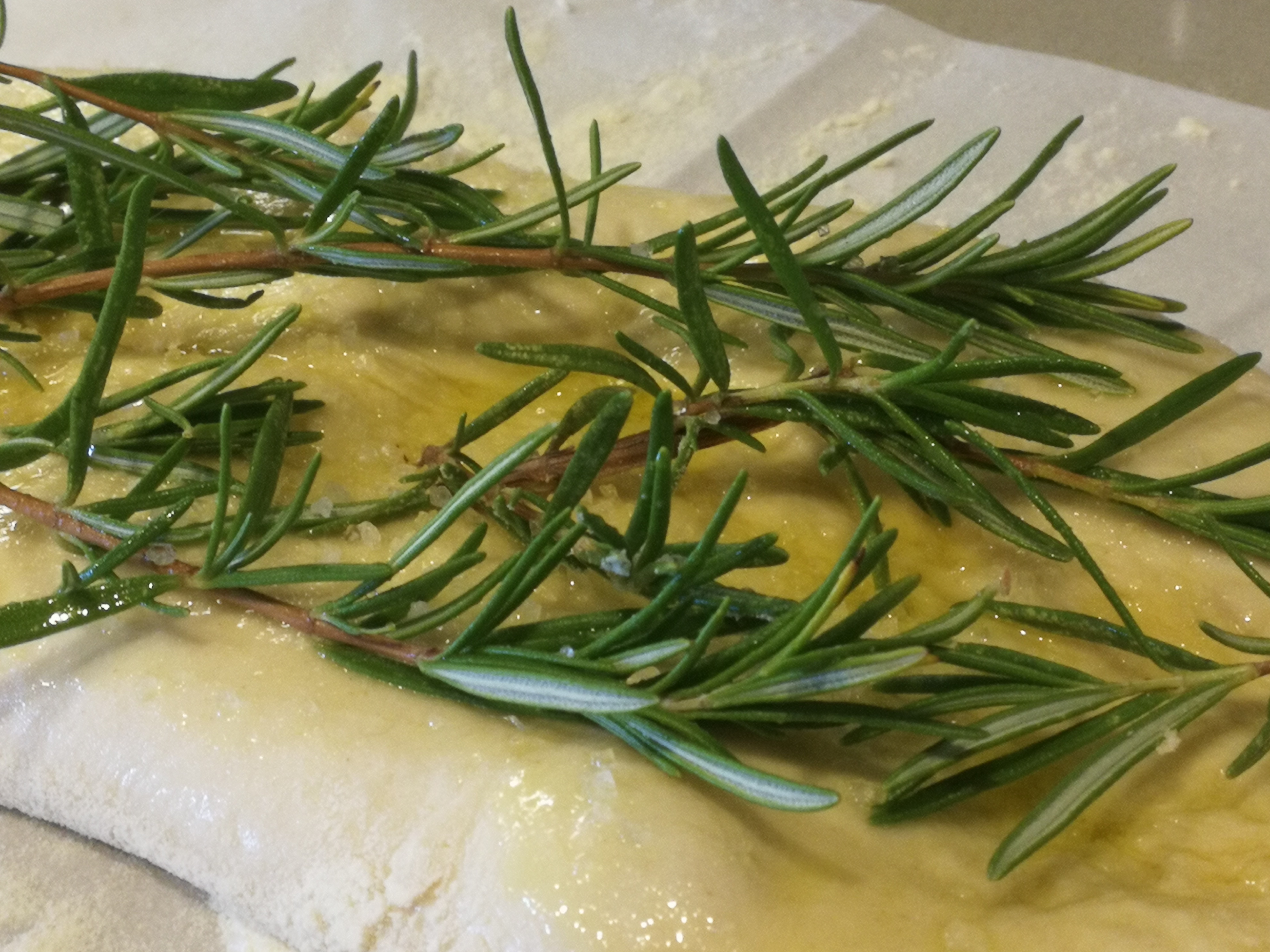 Separate into two or three equal portions and repeat the folding and the turning of the portions in a circular motion, then place on flour dusted baking paper on a tray to rise. For outstanding Focaccia place in the fridge to rise slowly overnight (means doing the day before). When risen remove and shape by taking a ball and with your fist starting at one end and moving to the other. Creating an oval loaf shape. Oil slightly and place Rosemary sprigs on Focaccia, sprinkle sea salt and place in oven on a tray preferably on a Pizza stone at preheated 220 C for 10 minutes. Remove tray and leave Focaccia on Stone directly for another 5-7 minutes.