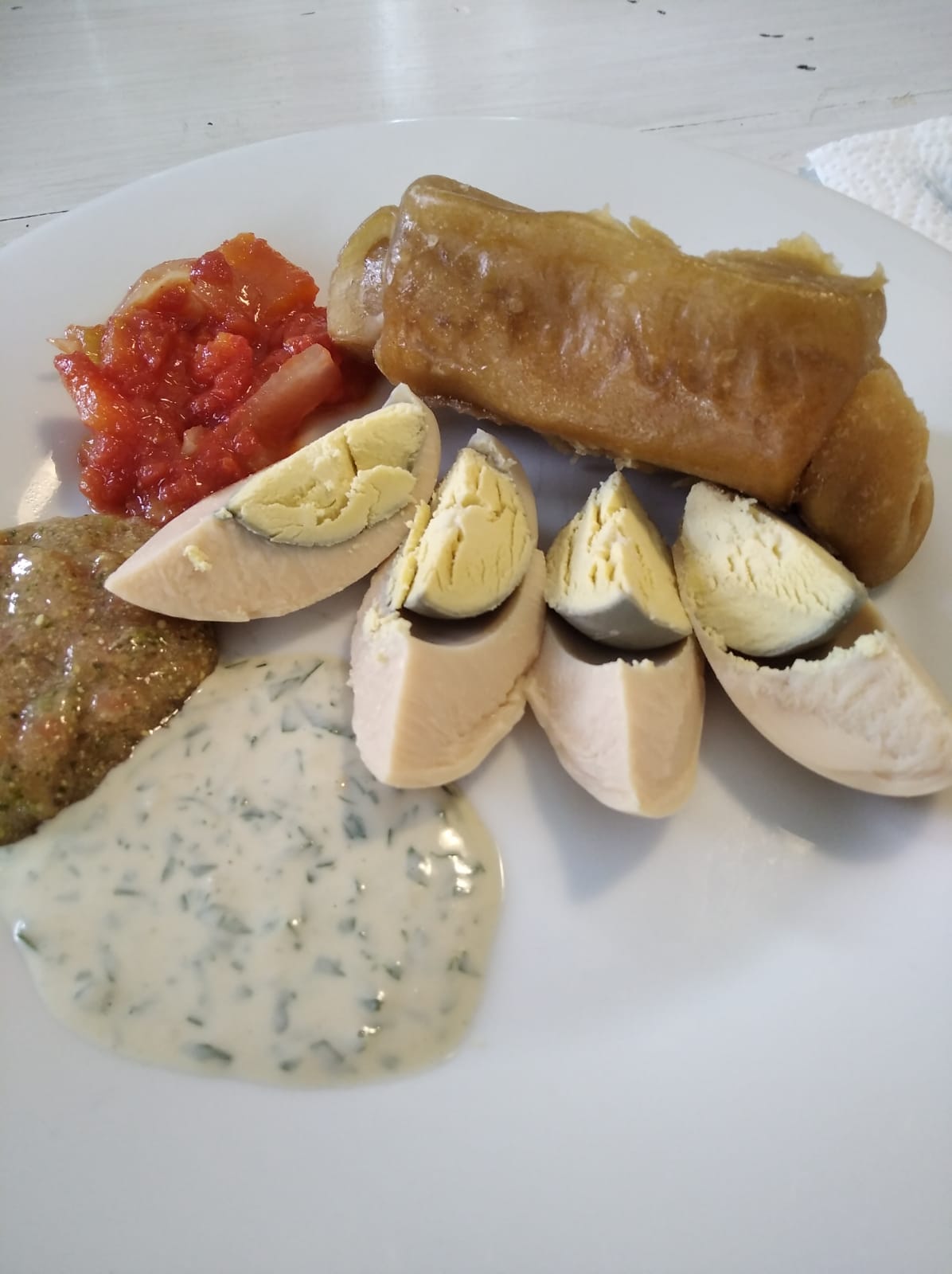 A breakfast or brunch with jachnun and helba is usually accompanied by hard boiled eggs and is good for a real fress (Yiddish for gluttony).