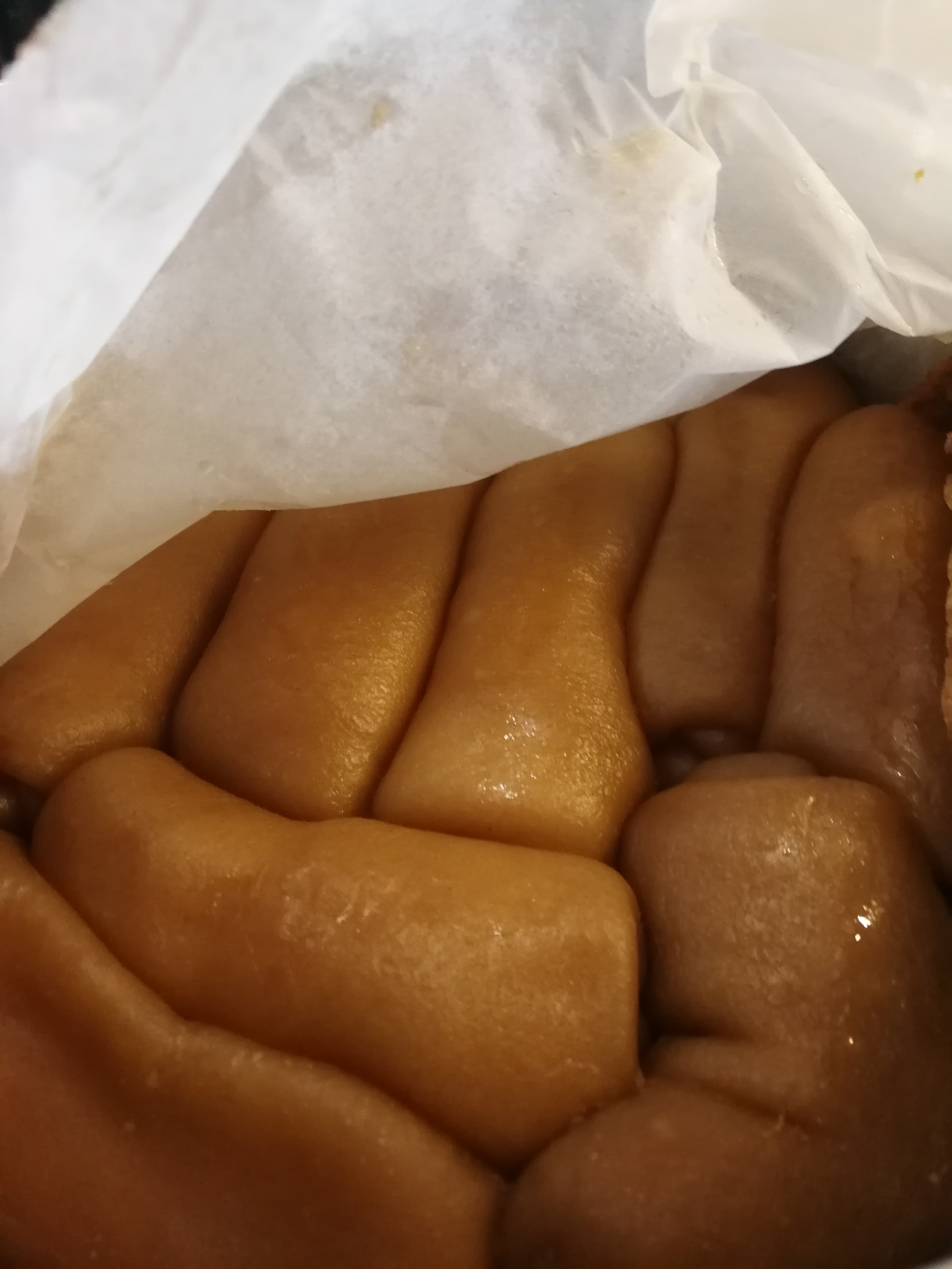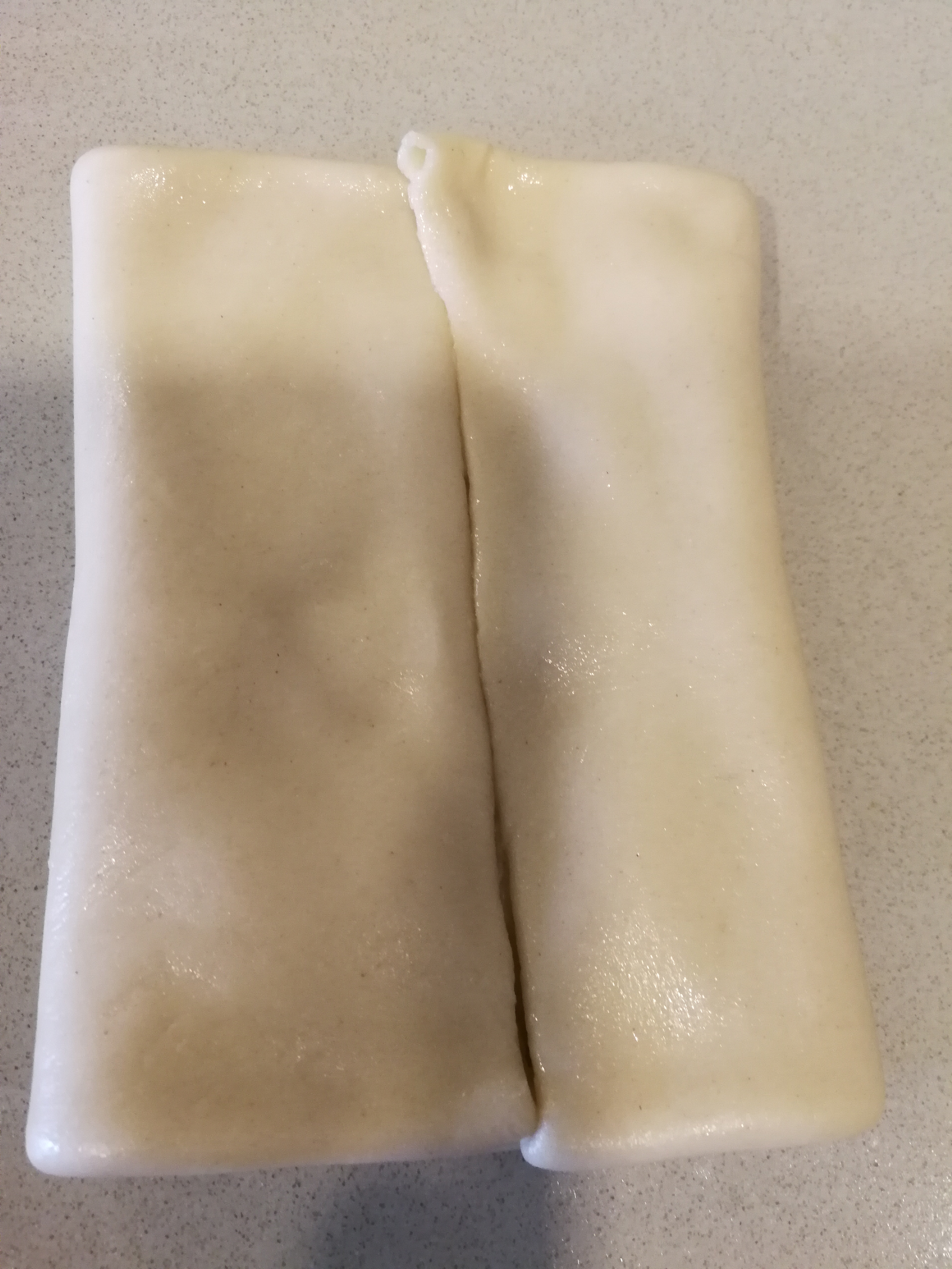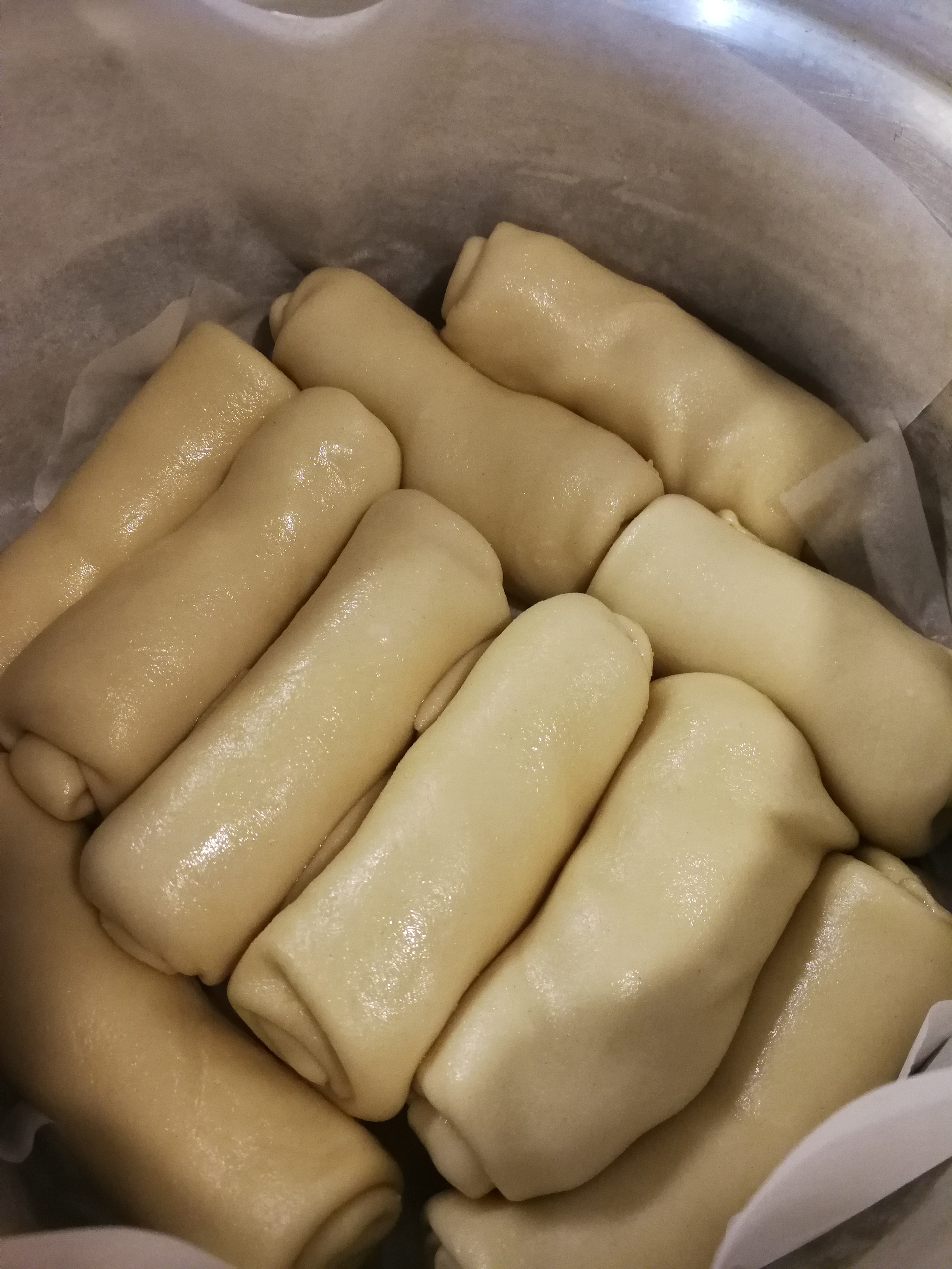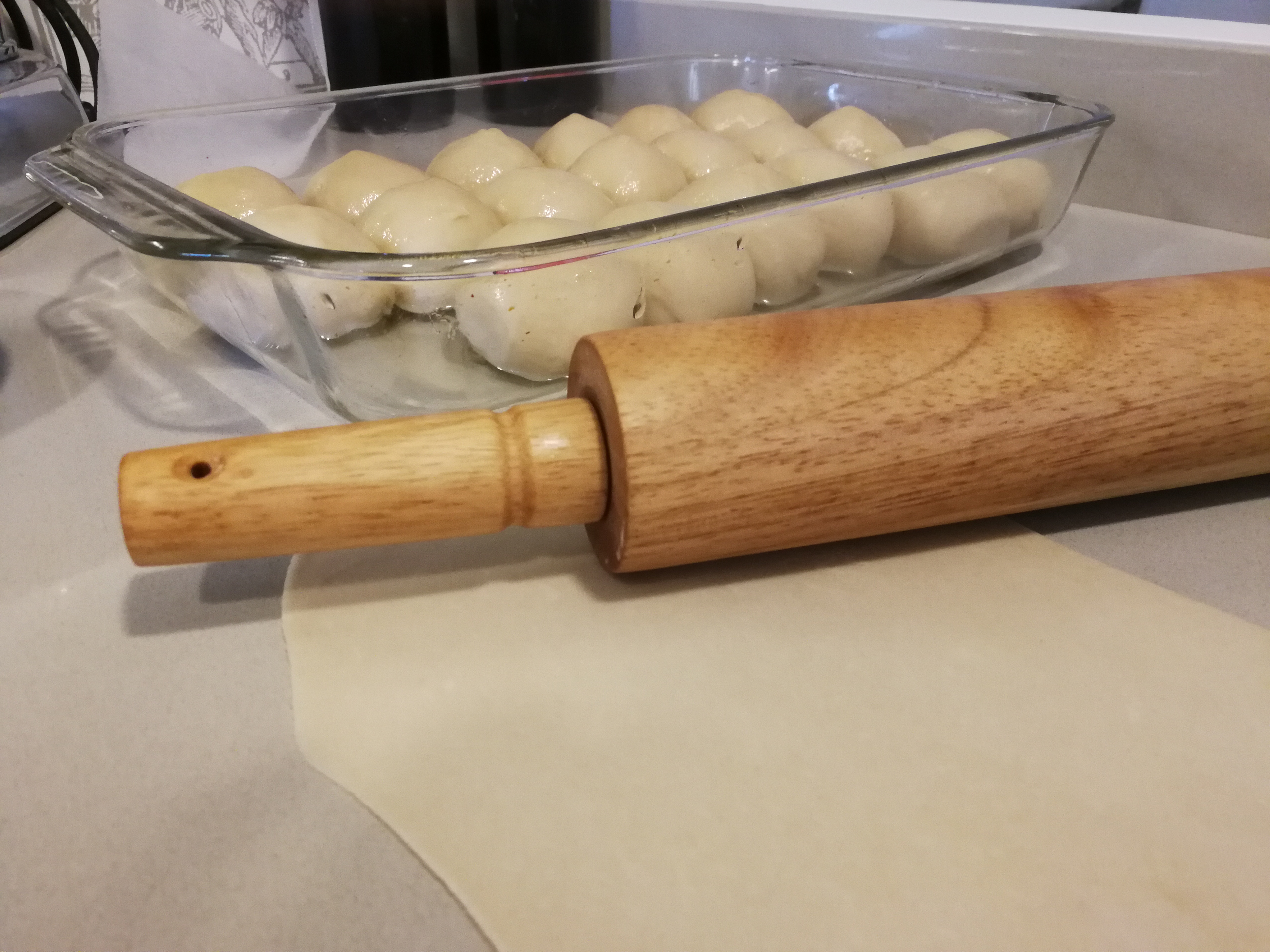 Using a rolling pin take the first ball, open up to a rectangular shape a few millimetres thick and using a spatula spread evenly the softened butter over the entire surface, then fold the two sides in to the middle of the sheet and then spread another layer of butter onto the folded in sides, then fold in the ends so all the butter is captured within the dough. Then stretch and roll up tightly ensuring the dough remains thin throughout the process. Roll each piece in the oil of the tray before placing in pot. Repeat this with remaining nineteen balls filling up the pot layer by layer. Making sure to place a circle of baking paper between each layer so they don’t stick together.