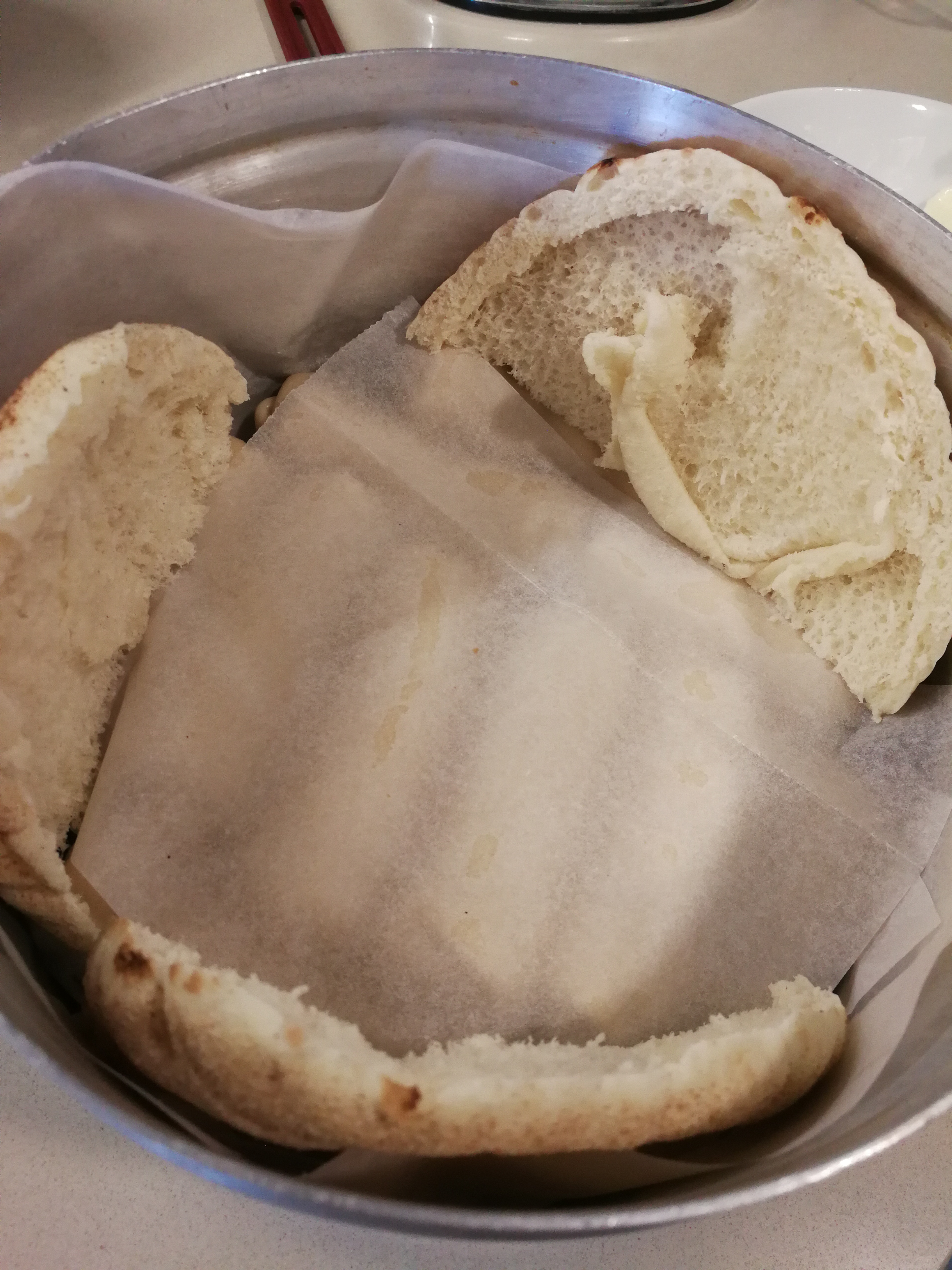 Line bottom of pot with baking paper, cut pita into two circles and place on bottom of pot on the baking paper. This is to absorb excess oil and fat from the baking process. After the bottom is sealed, the sides also have to be lined with baking paper and pita.