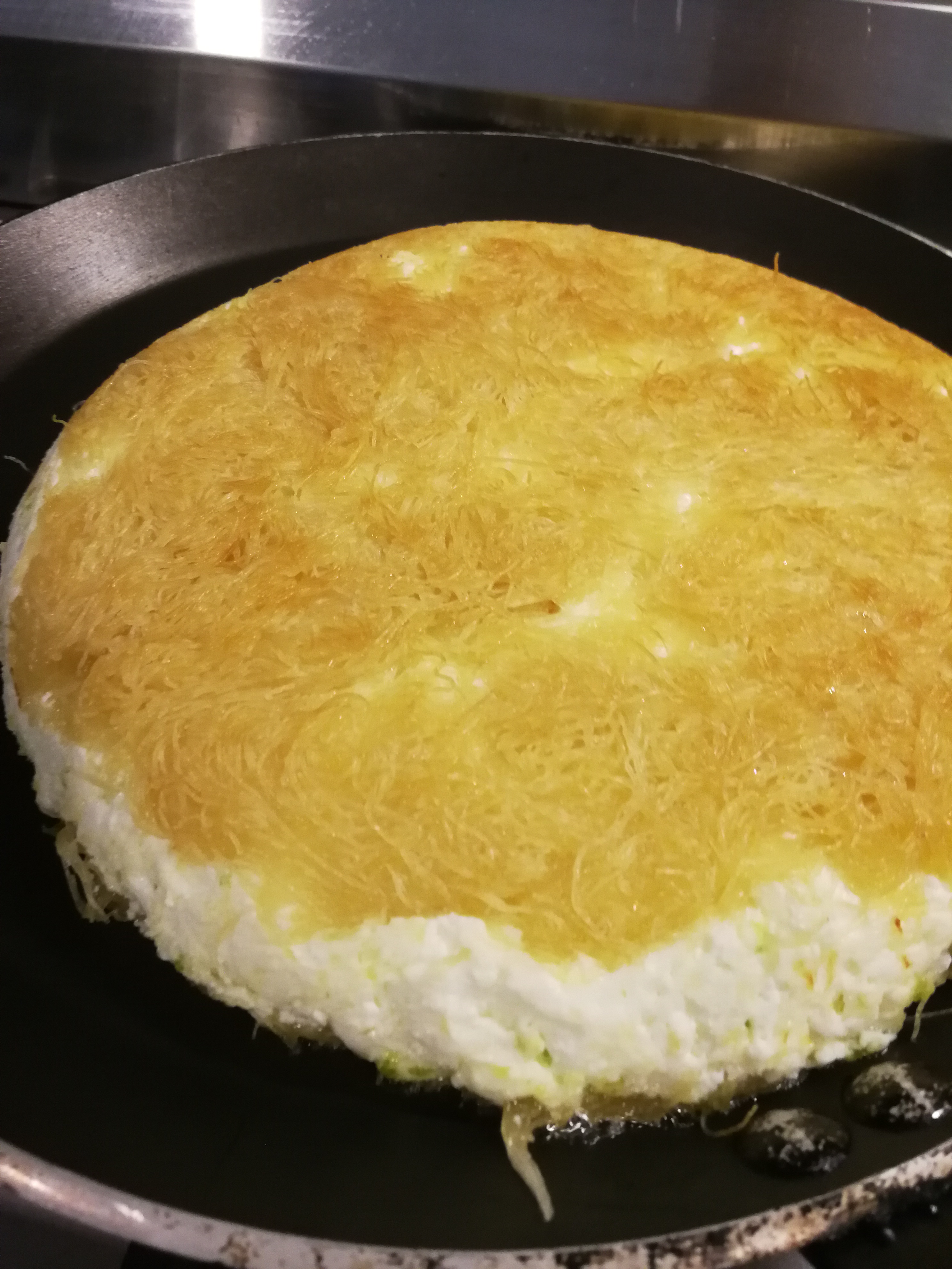 Put the frypan with the Knafeh on the gas top on a medium to low heat, until slightly browned and crispy but not burnt, turn over and do the other side using a second preheated frypan for flipping, have your sugar syrup handy and drizzle over the top, sprinkle the pistachio before serving. Best served warm. Simple, but a real treat.