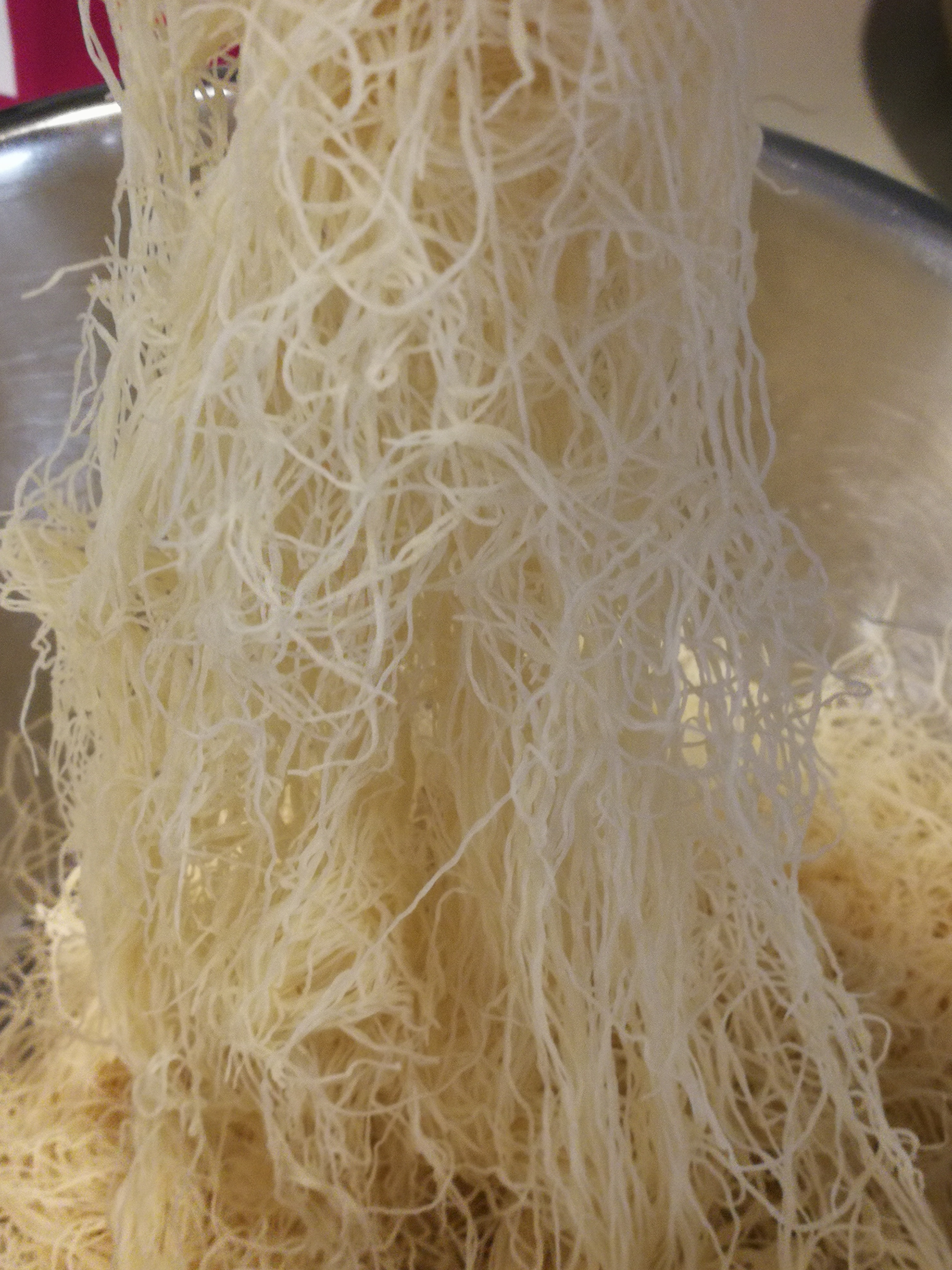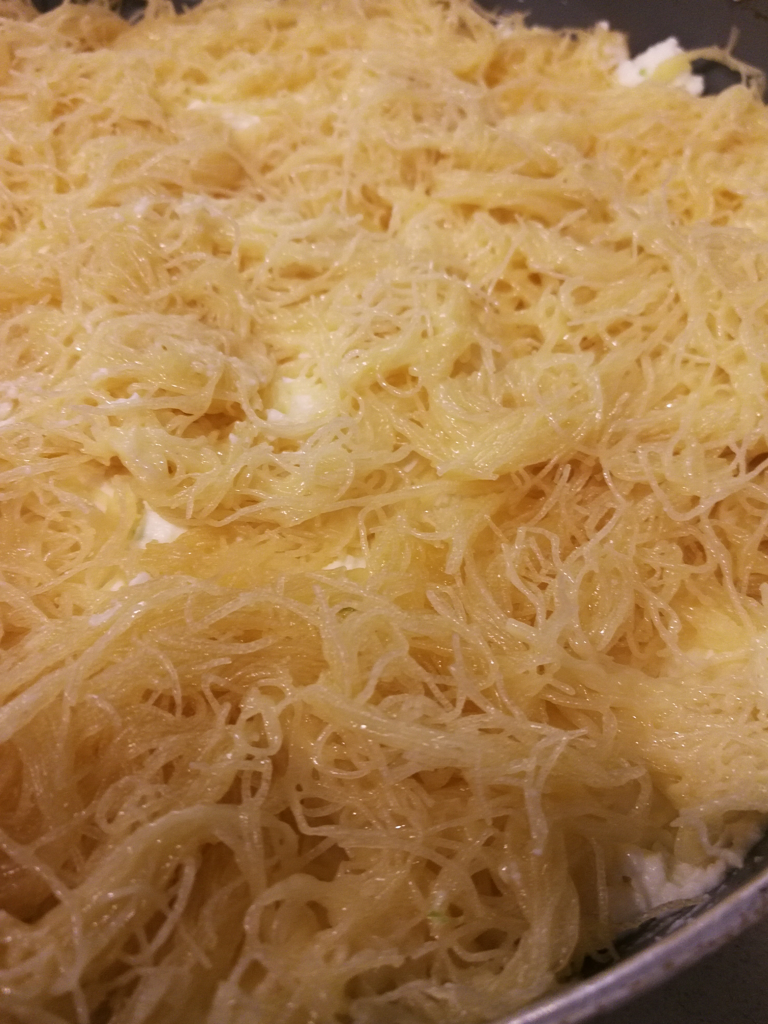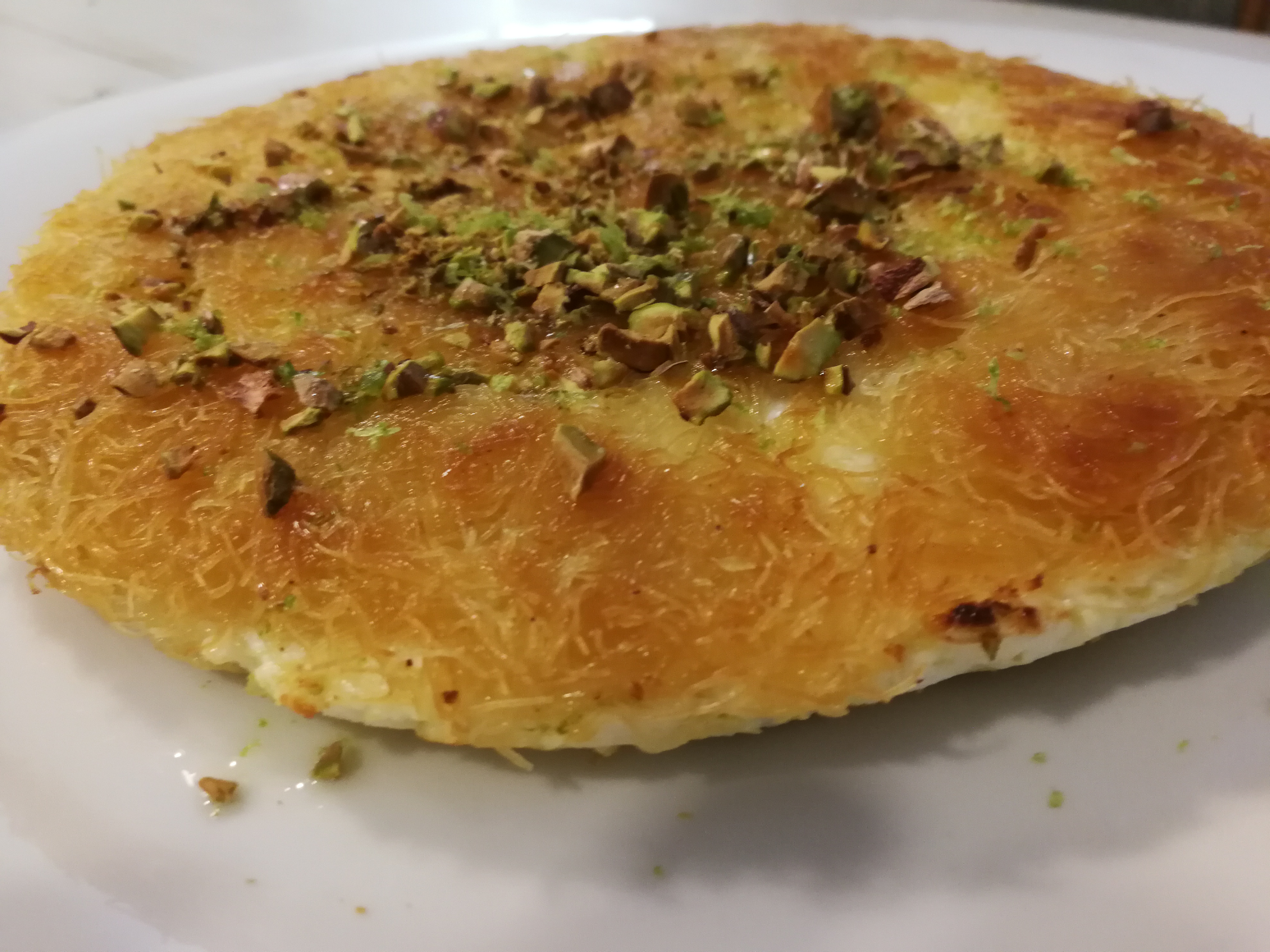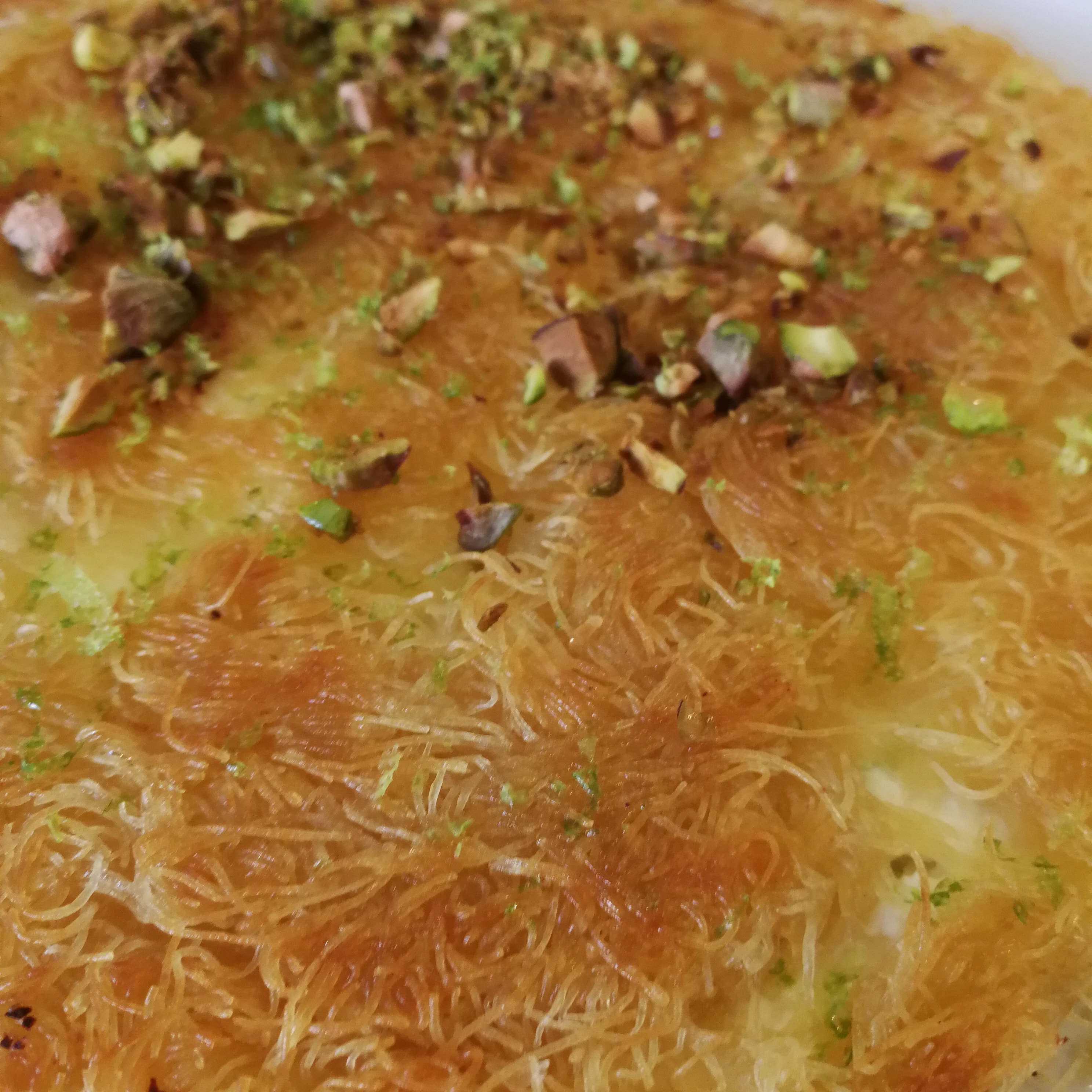 Further most commercial and Restaurant Knafeh has the Kadaif coloured orange with food colouring to act as a contrast to the green of the Pistachio topping. I prefer O natural over food colourants.