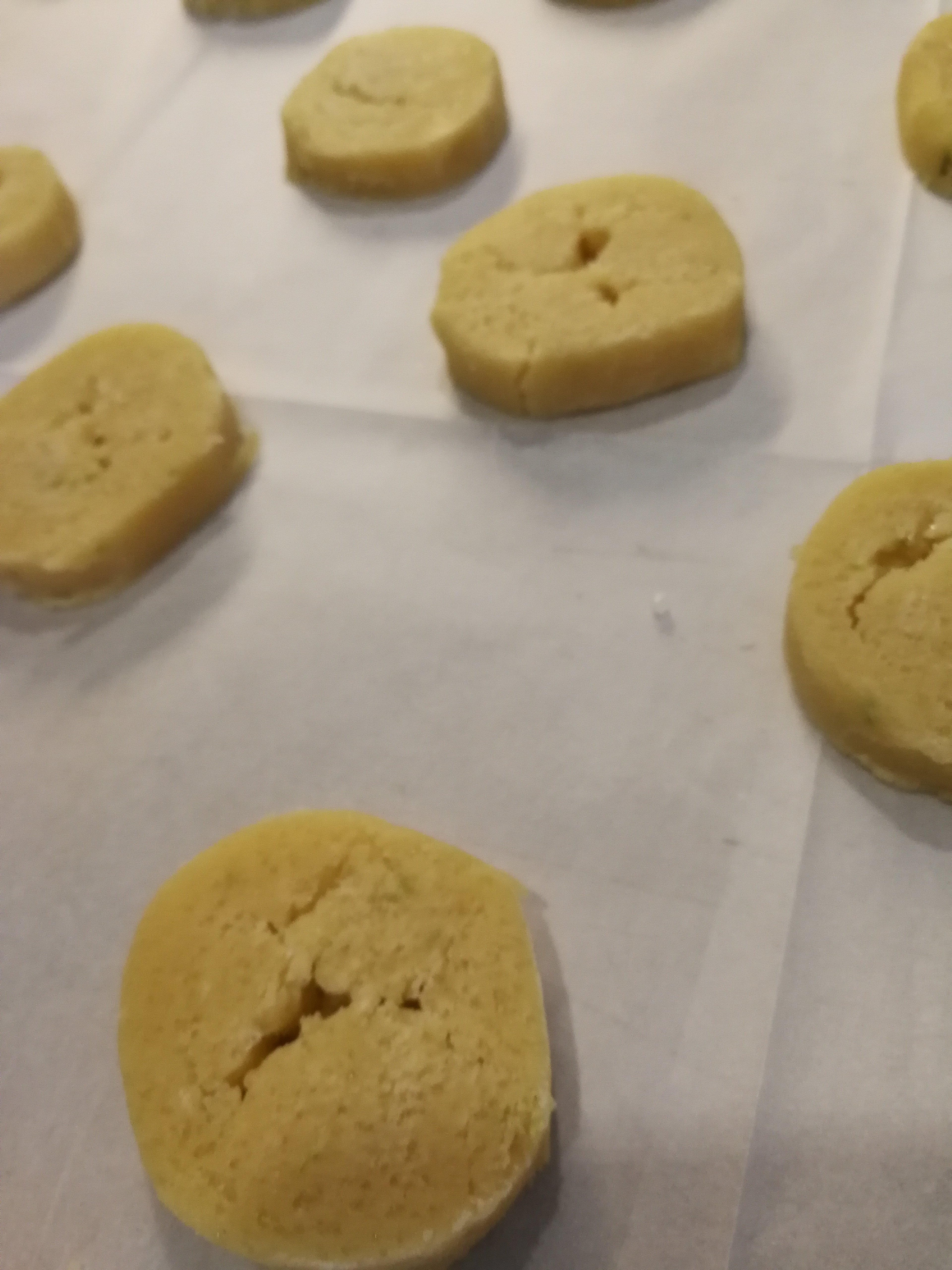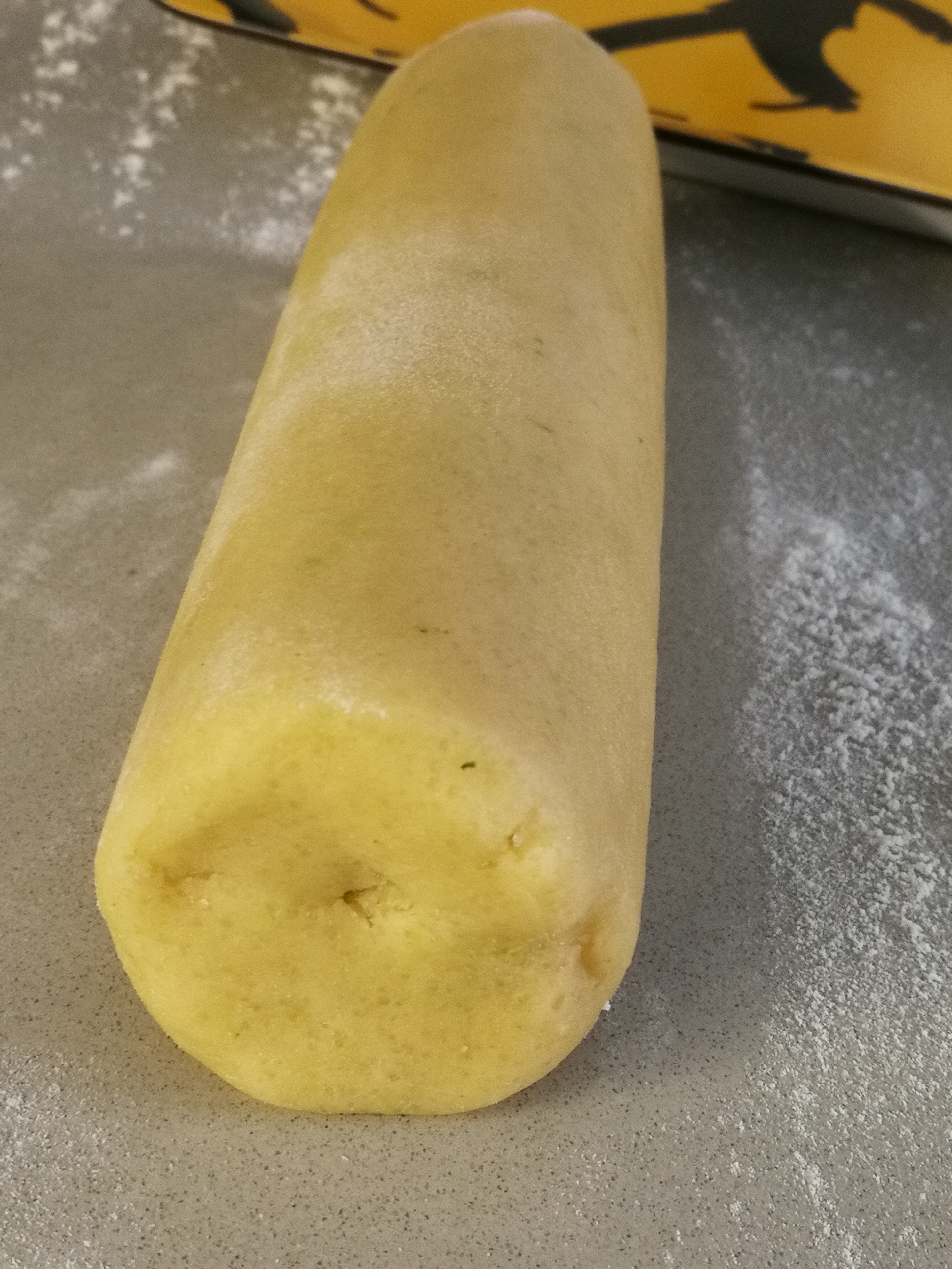 Remove from fridge halve, lightly dust the counter top in flour and your hands and gently roll out into a tube about 5 cm thick. To get the perfectly round tube use a thin baking tray to roll it out, remember to always dust the roll with flour to ensure it doesn’t stick to anything. Once thickness and roundness is obtained place on tray in Freezer leave until frozen. When you wish to make your biscuits remove from the freezer and let thaw for 5 minutes, cut 3/4 centre meter slices place on baking paper with enough space between biscuits as these will expand. Bake for 12-14 minutes at 180 C, leave to cool completely in place on the tray before packing in a sealable box.