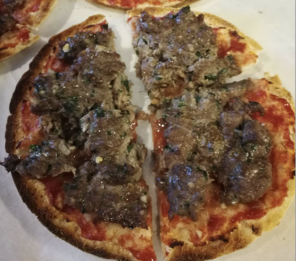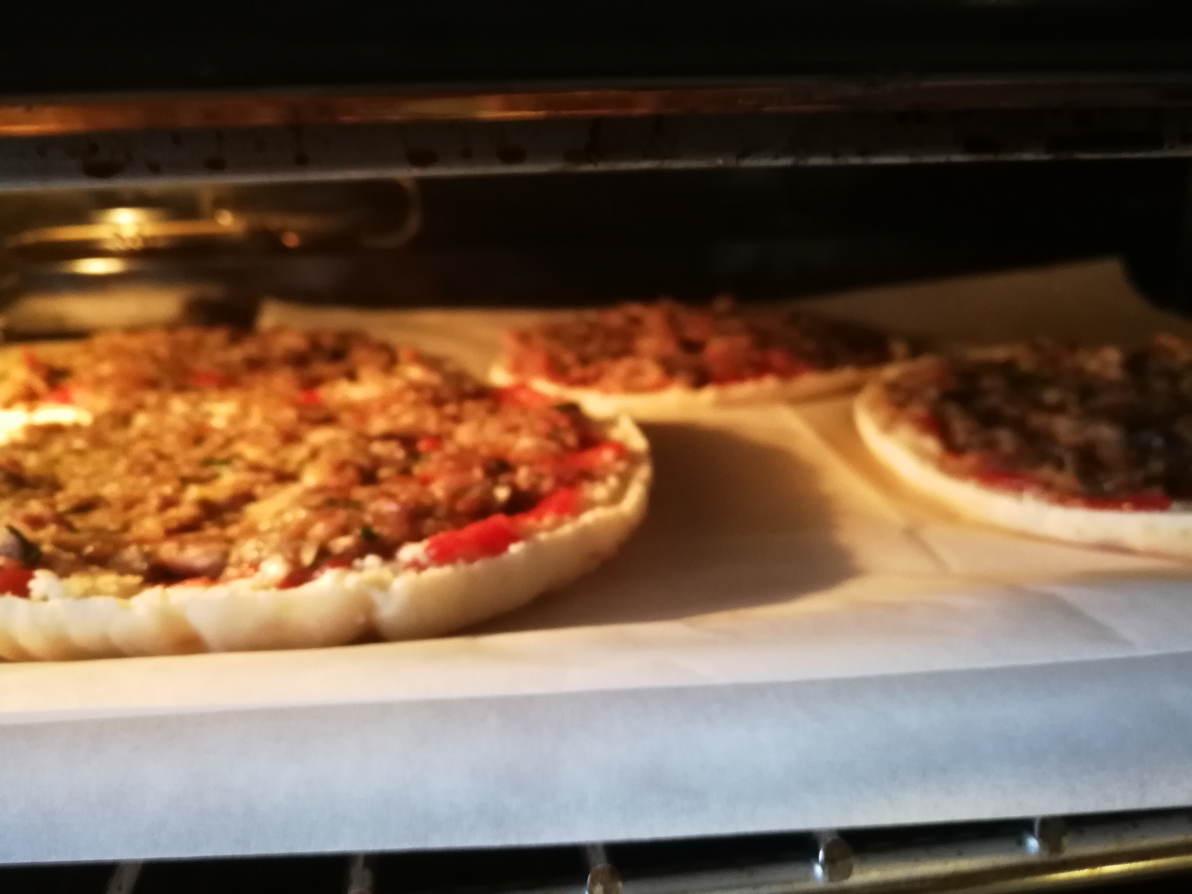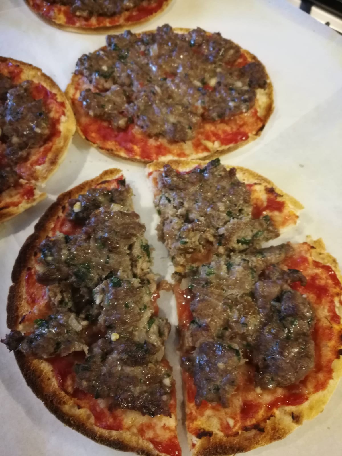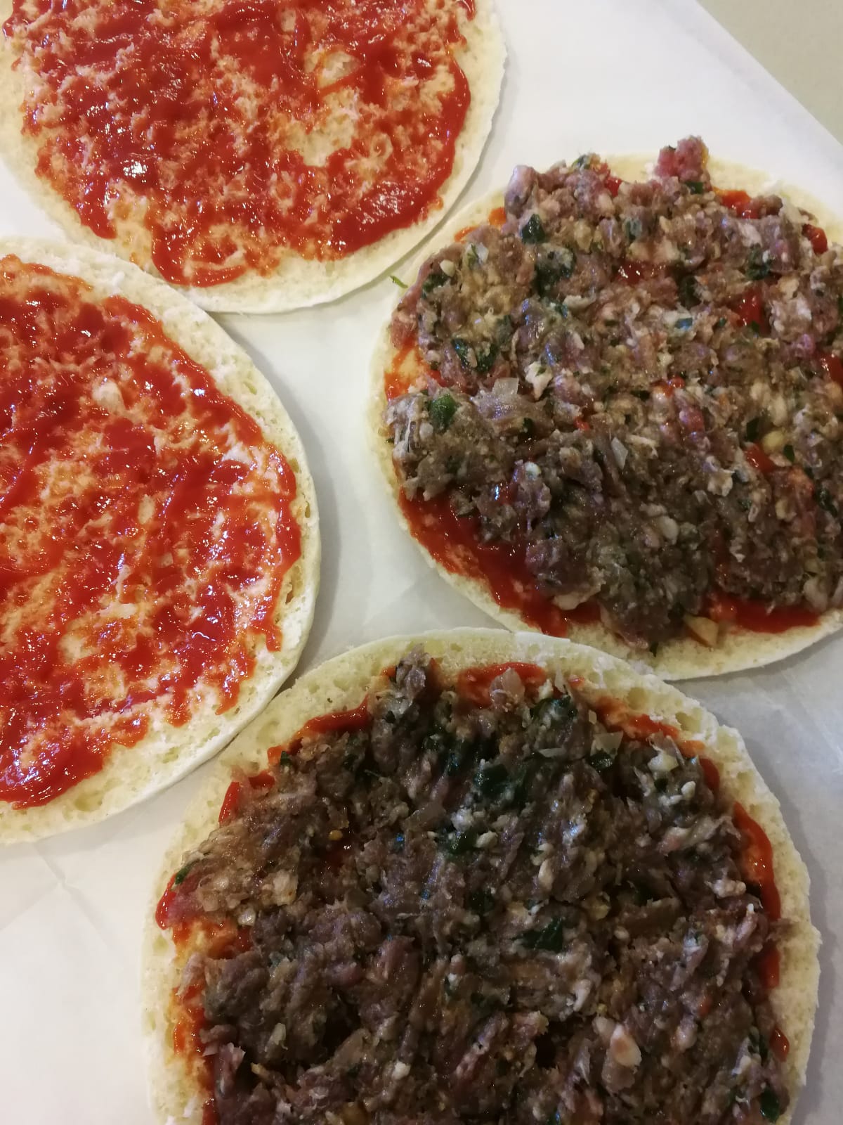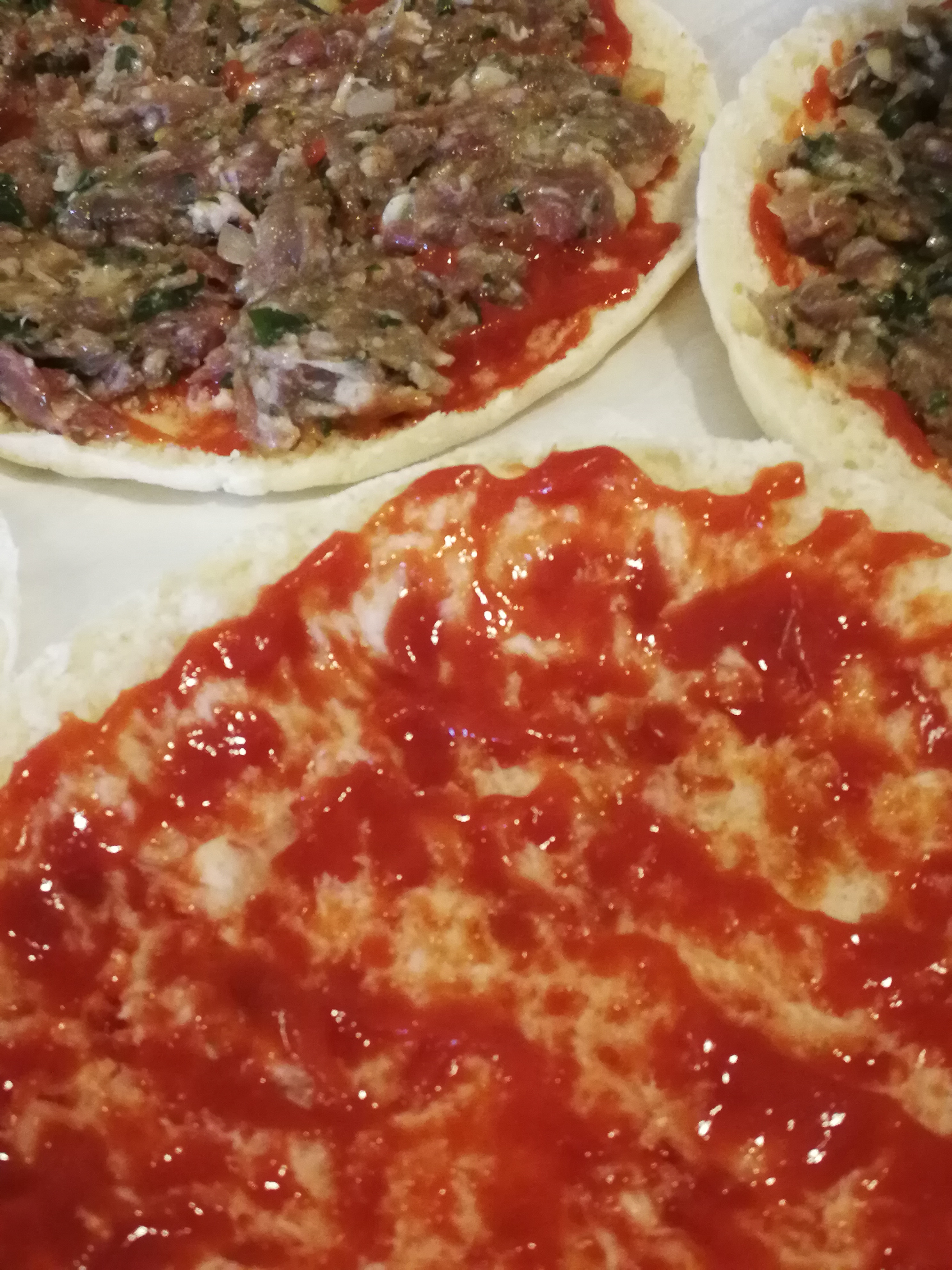 As time has passed the dish has transformed itself to become seasoned minced meat on a tomato sauce base on half a piece of pita bread. This is probably because pita bread is so cheap up here and can be easily purchased fresh at all times of the day. As we are all participants in that instant world, it’s just not worth your while to make and bake the original dough recipe. I have never eaten nor seen the original dish, but today it’s pretty much tomato sauce and seasoned mince on half a bought pita.