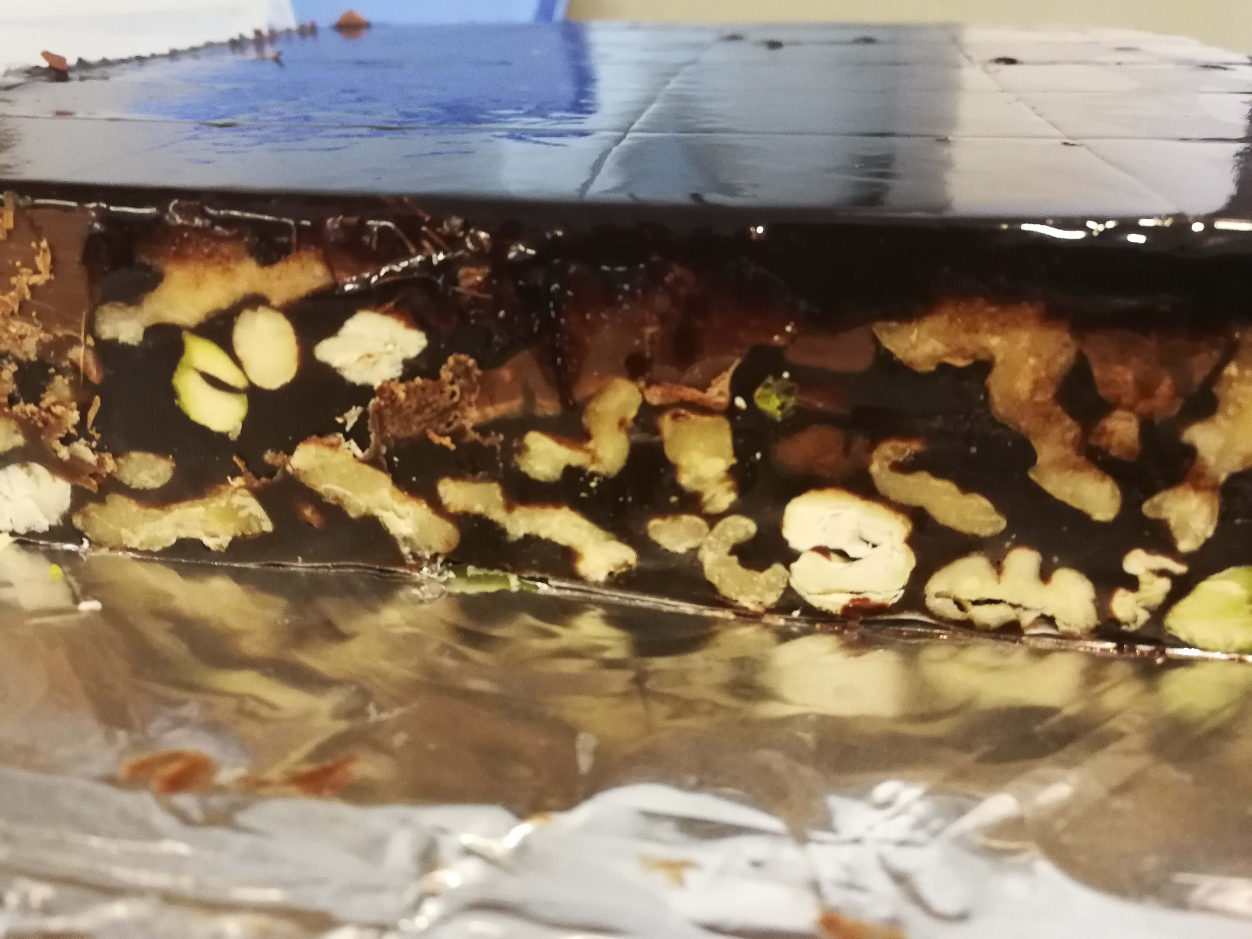 Place ingredients “A” – butter (or margarine), honey, sugar, sifted cocoa powder – in a pot. On medium-low heat bring to a boil, remove from heat and mix in hazelnut butter. In an aluminium oven tray, line bottom with baking paper and tip the mixed nuts in, making them level. Pour mixture “A” on top of the nuts, place baking paper on top and compact down while ensuring it remains level. Remove baking paper.