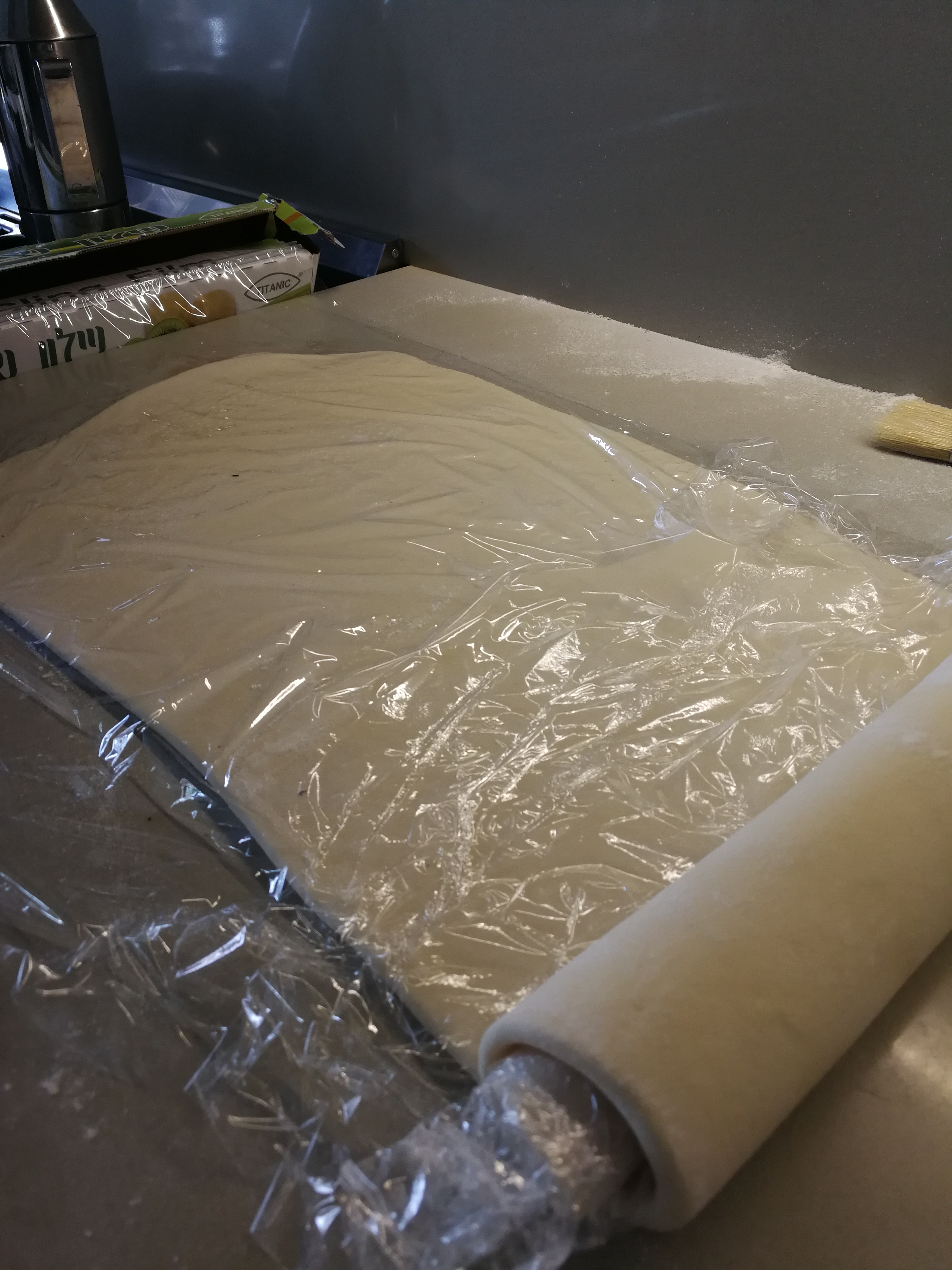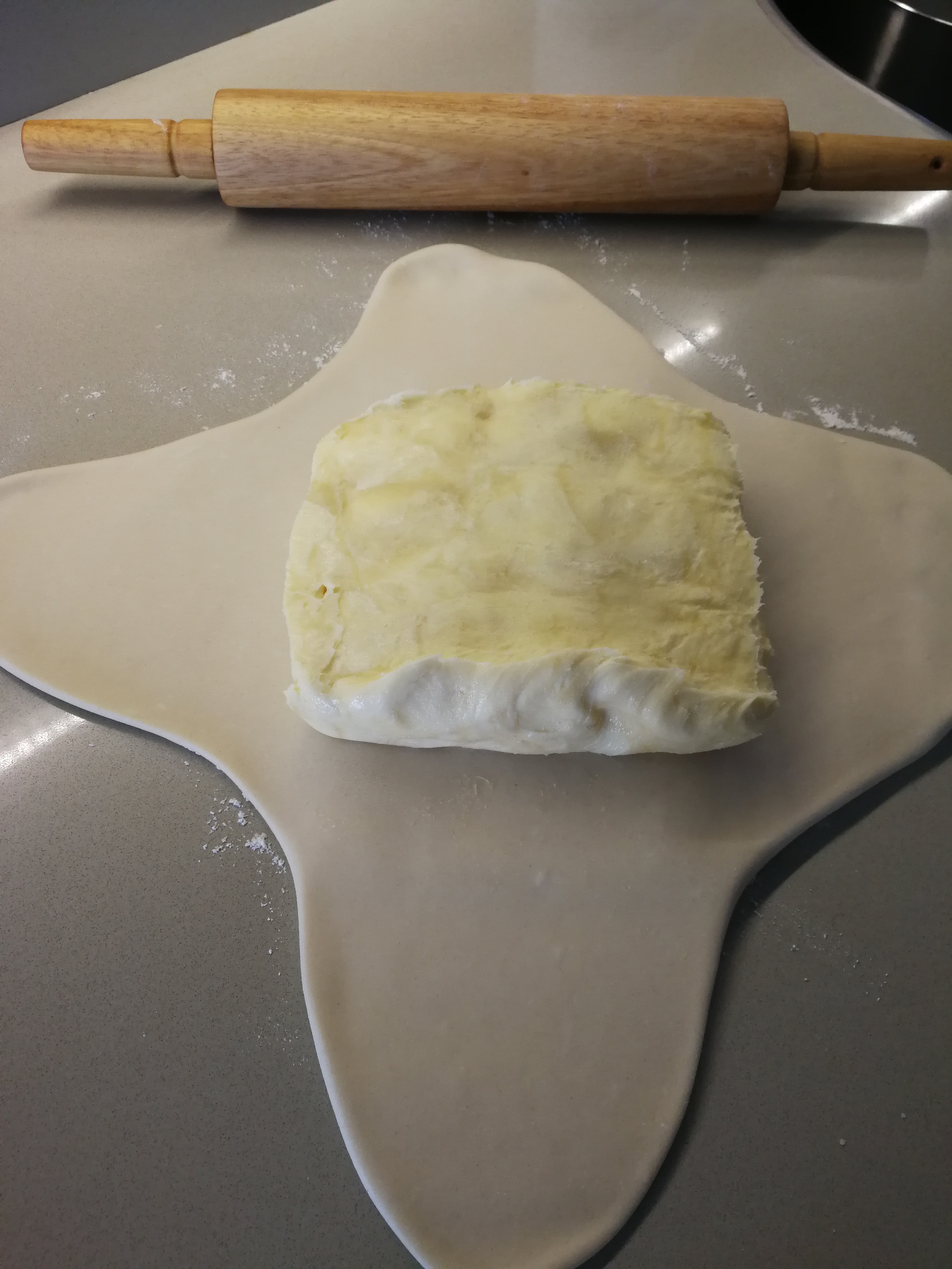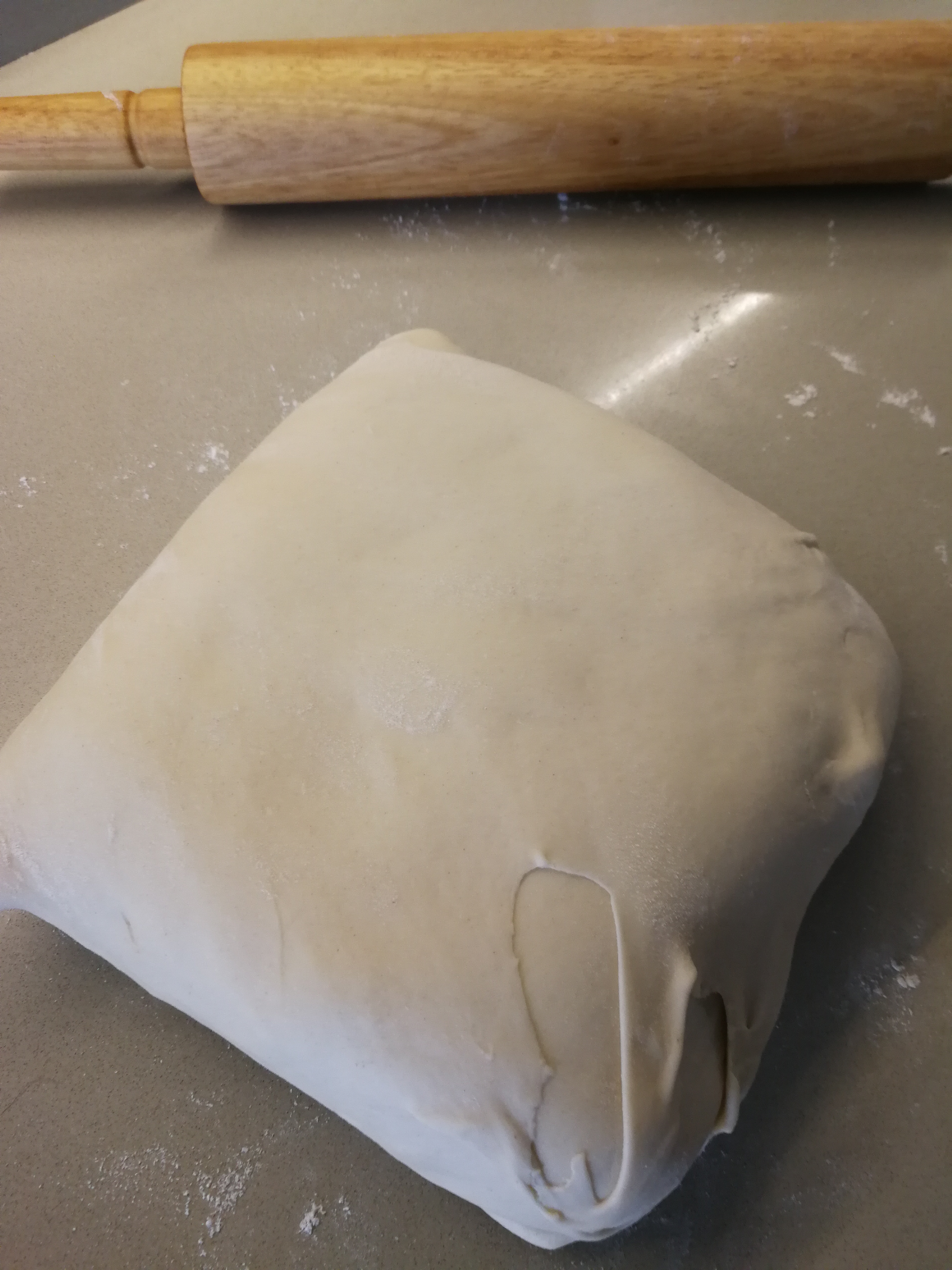 2/. After removing from fridge the second fold is of three. Roll out the dough ensuring there is plenty of flour messing up everything. Again using a brush dust all flour off and fold the dough to one third and the other end over it for three folds, wrap and return to fridge for ½ hour.