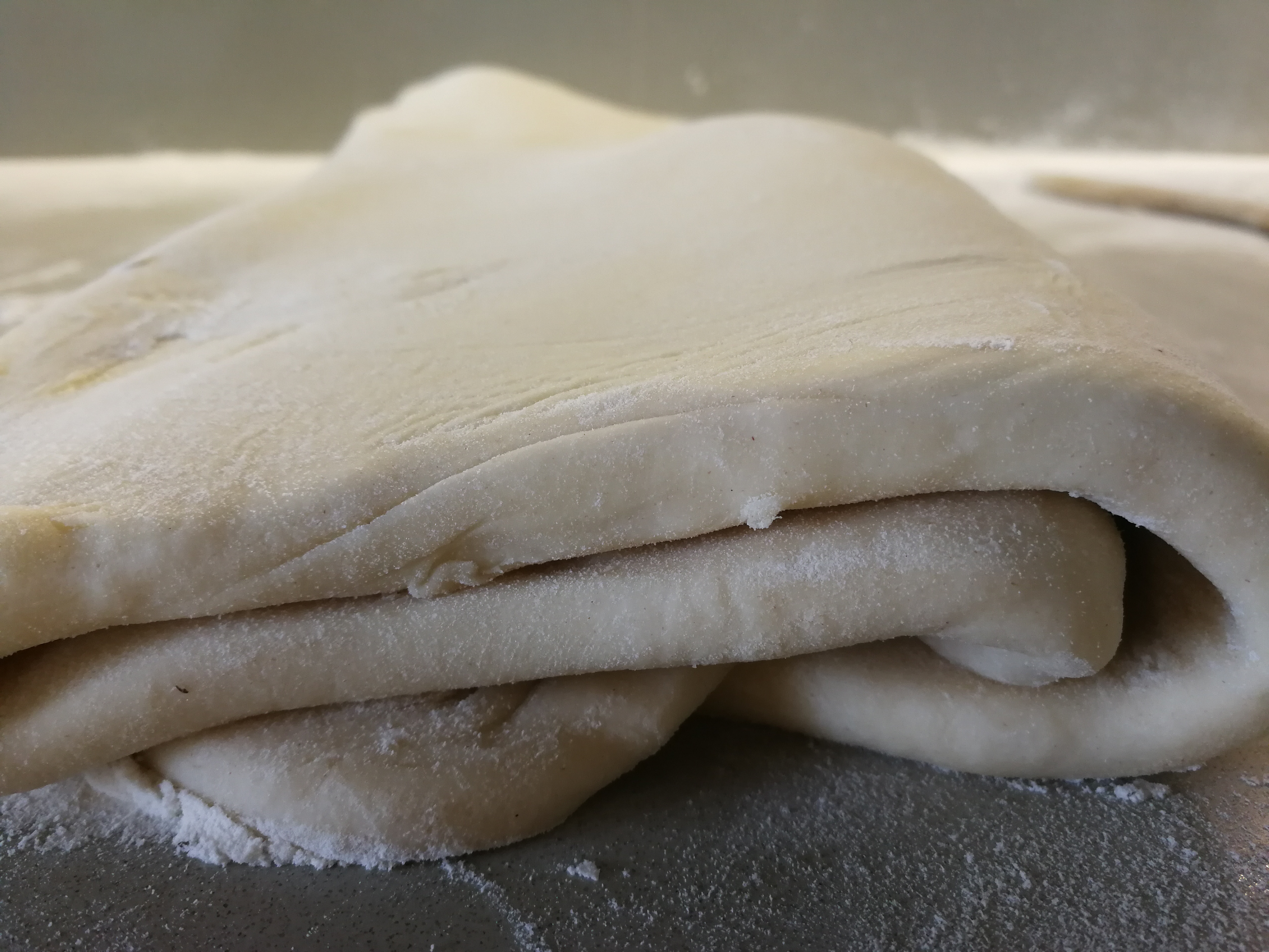 Now we are going to do a 4 x 3 x 4 x 3 fold which should leave close to 150 separate pages or leaves of dough within the mix. The original French recipe had another four folds in addition to the four of this recipe which would have provided for well over a thousand leaves of pastry, but no need to overdo it.