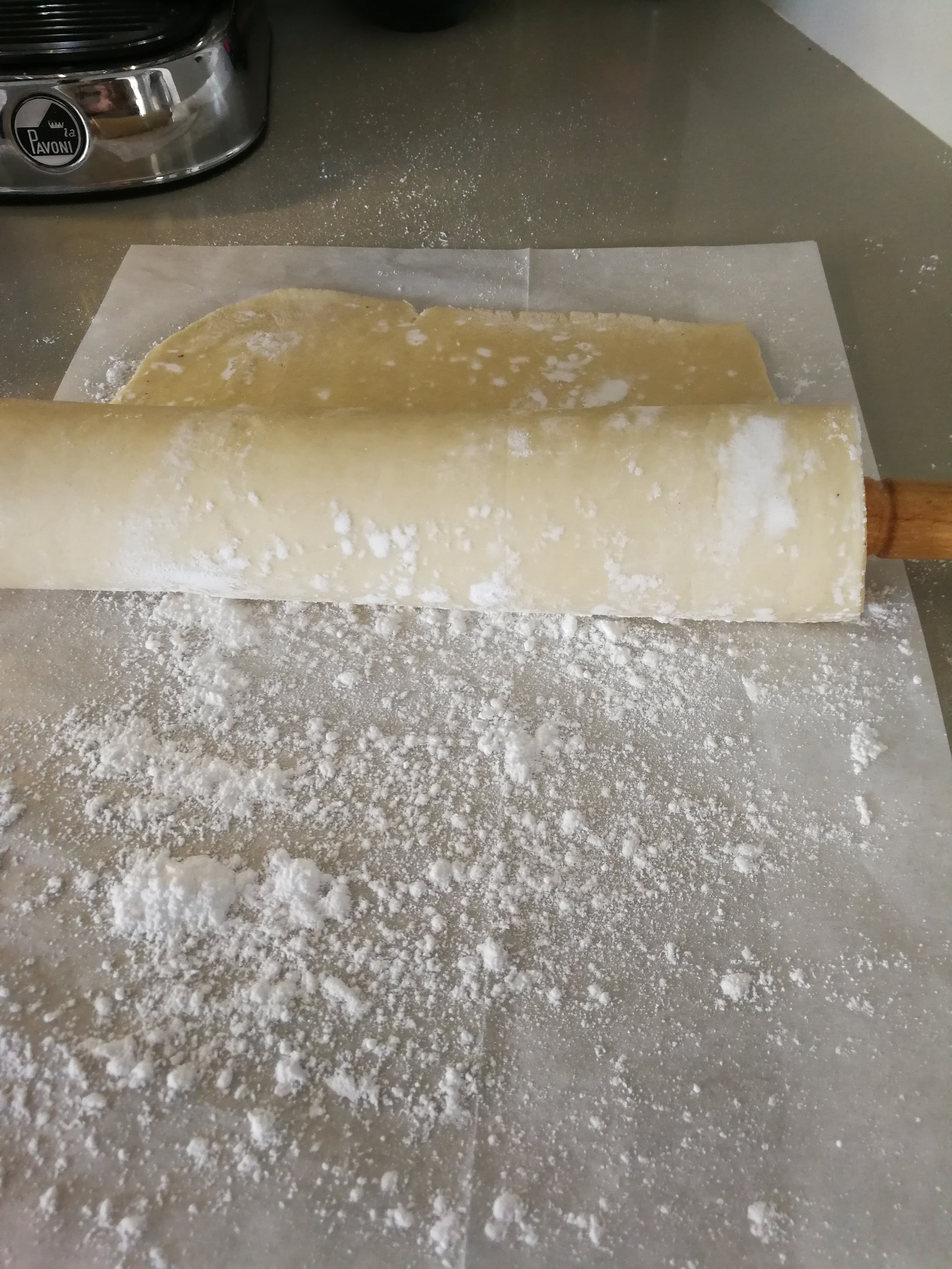 Then we unroll and cut off about 30 centimetres in length from the rolled up mille feuille dough from the fridge and place on a baking sheet. Instead of flour to prevent the dough sticking while rolling it out we use confectioner’s sugar or sugar powder, sprinkling liberally both underneath and on top of the dough.