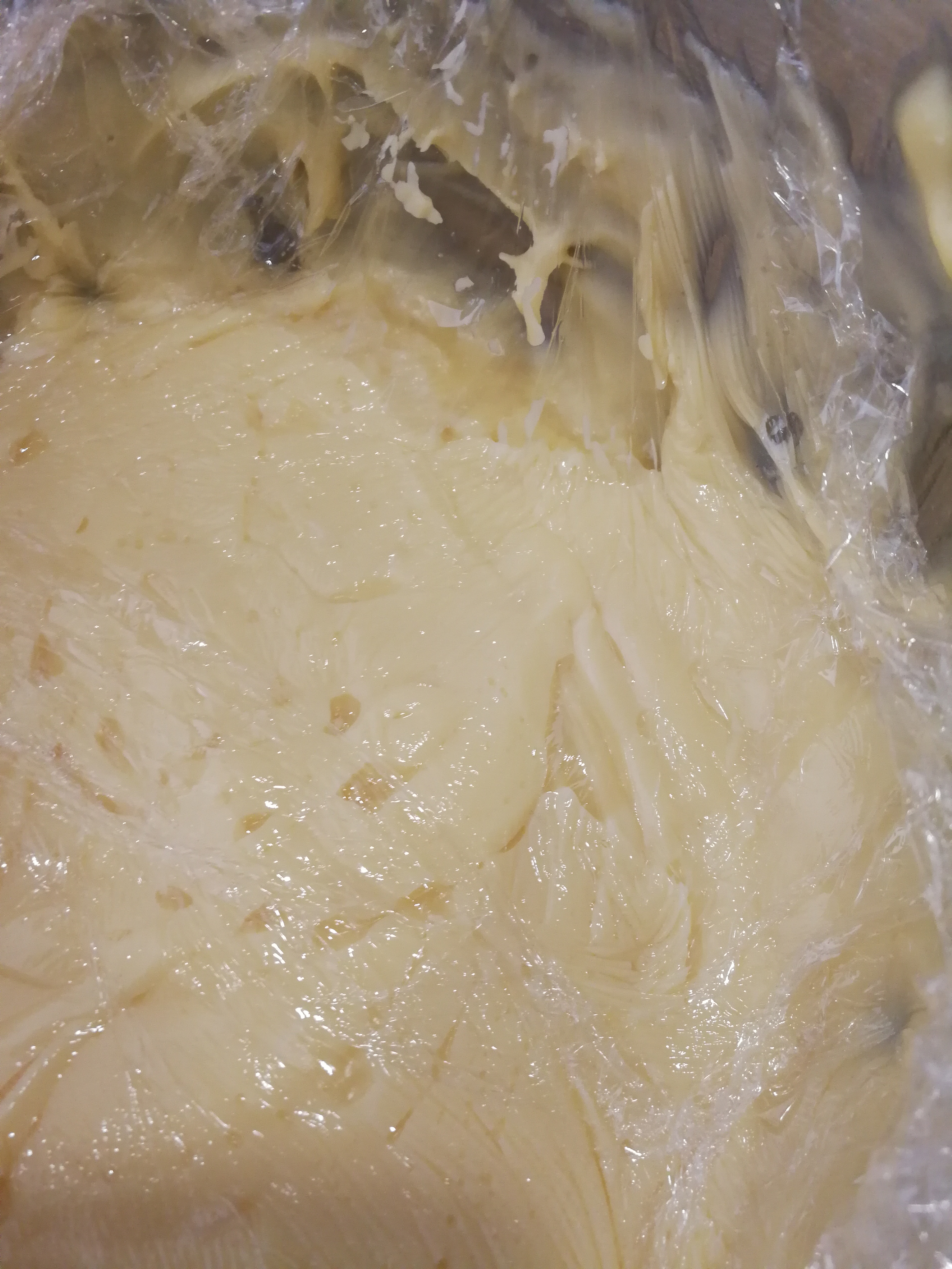 Remove from the heat, add the butter, mix it in and then create a skin using Glad wrap. Cover with Glad Wrap ensuring the Glad Wrap is one with the mixture. This prevents a hard skin from forming which would result in the loss of a significant amount of the mixture. Set aside to cool/place in the fridge.