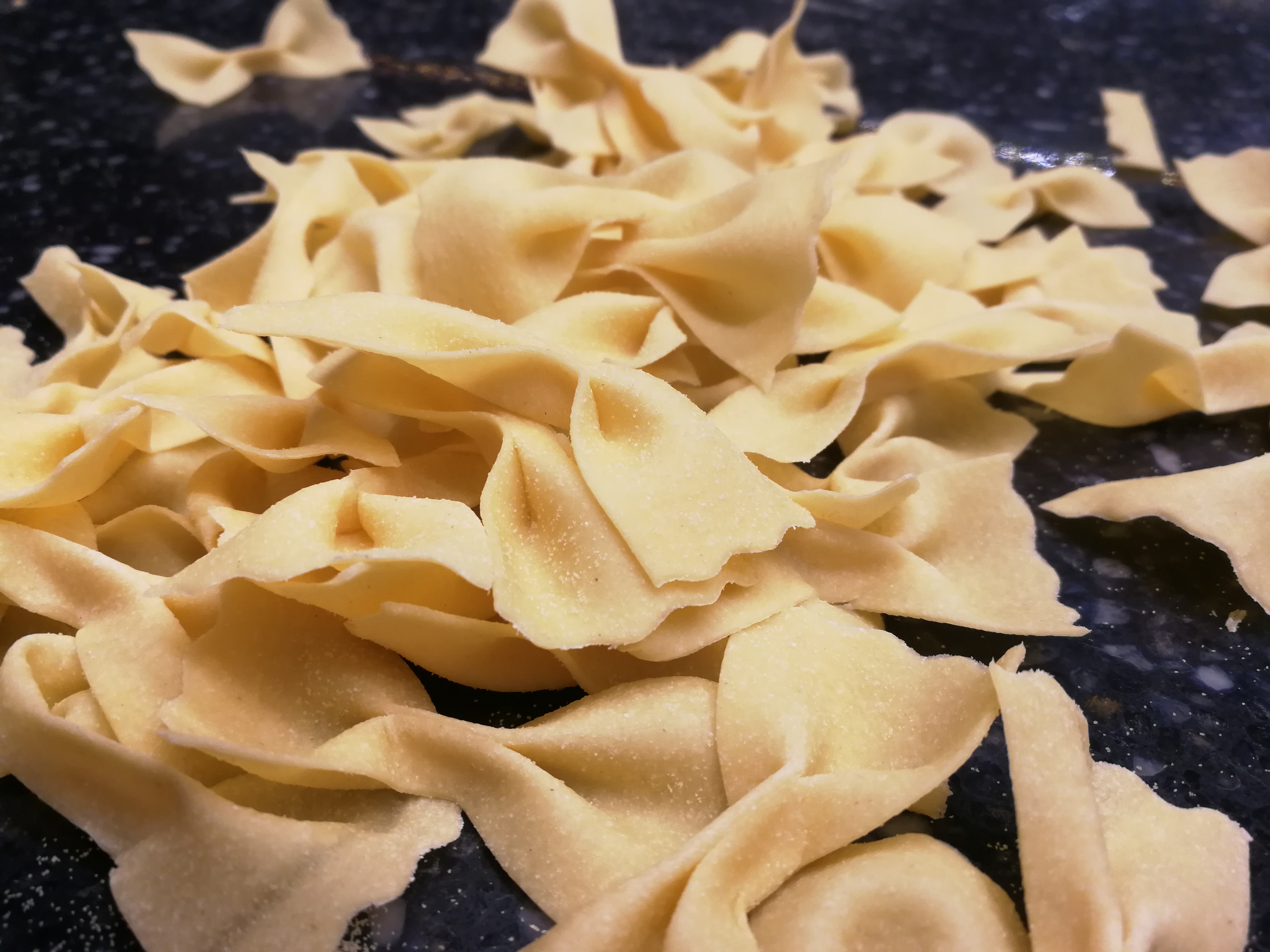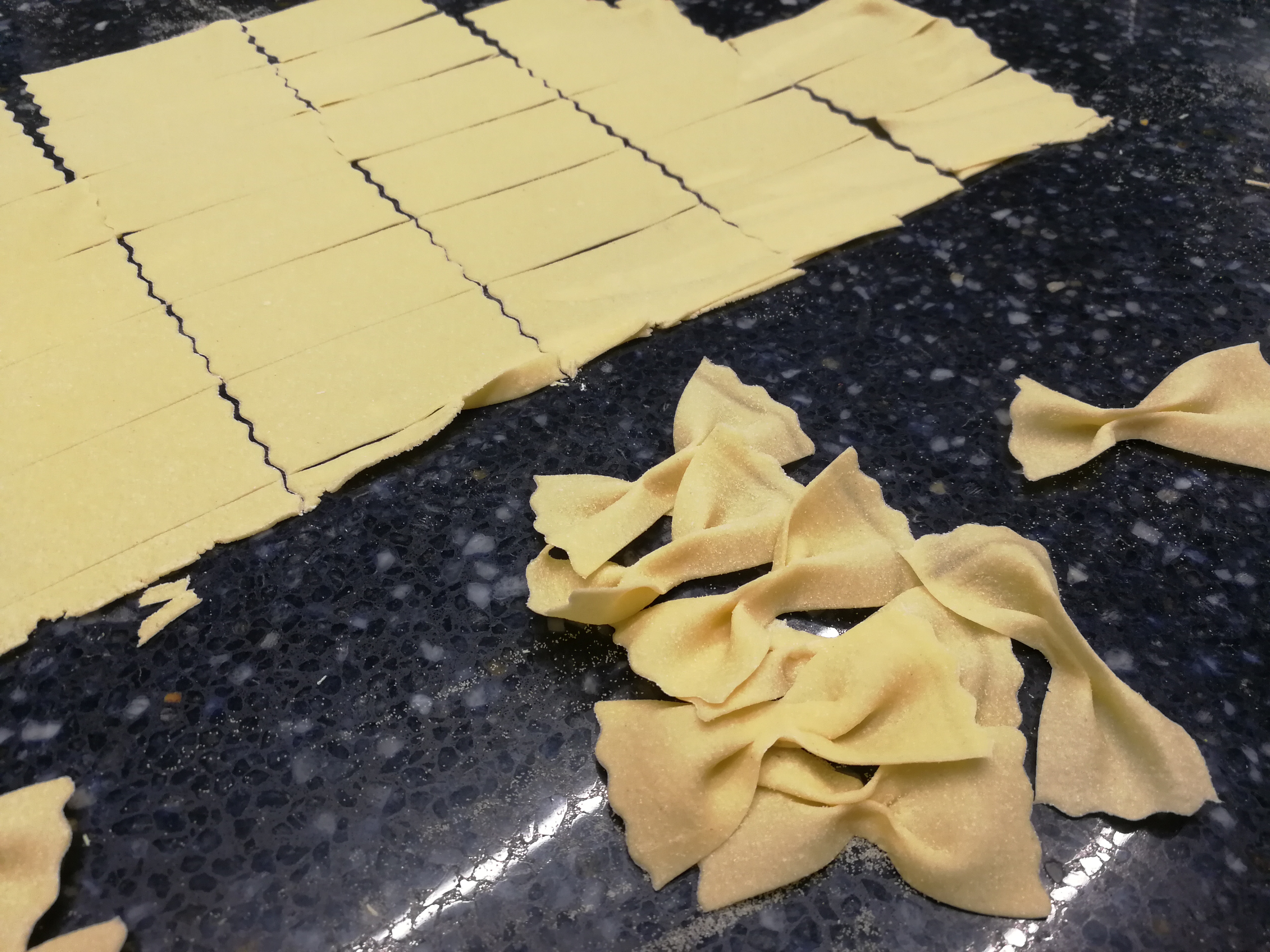 Boil a pot of water. Add salt once boiled for the penne or farfalle pasta (both of which you can purchase dry at the supermarket; it ain’t worth the time and effort to try and make these fresh).