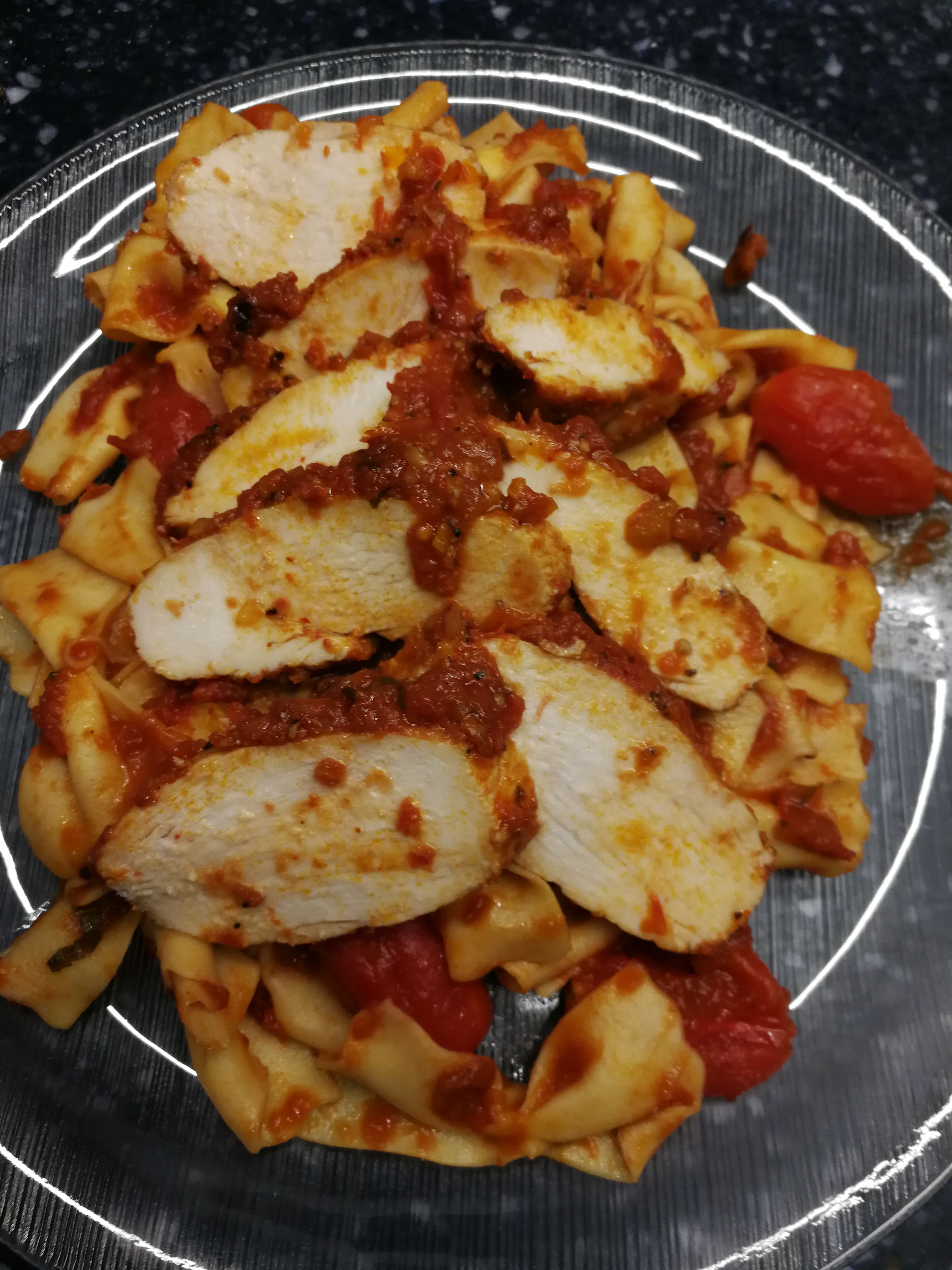 Chicken arrabbiata is simple to make and consists of chicken breast marinated in olive oil and paprika or hot paprika, grilled, sliced then finished either in the pan tossed in the Arrabbiata sauce or, for a more controlled product, finished in the oven, left to sit for five minutes before slicing and then being tossed in the sauce. I usually serve it on a bed of farfalle pasta.