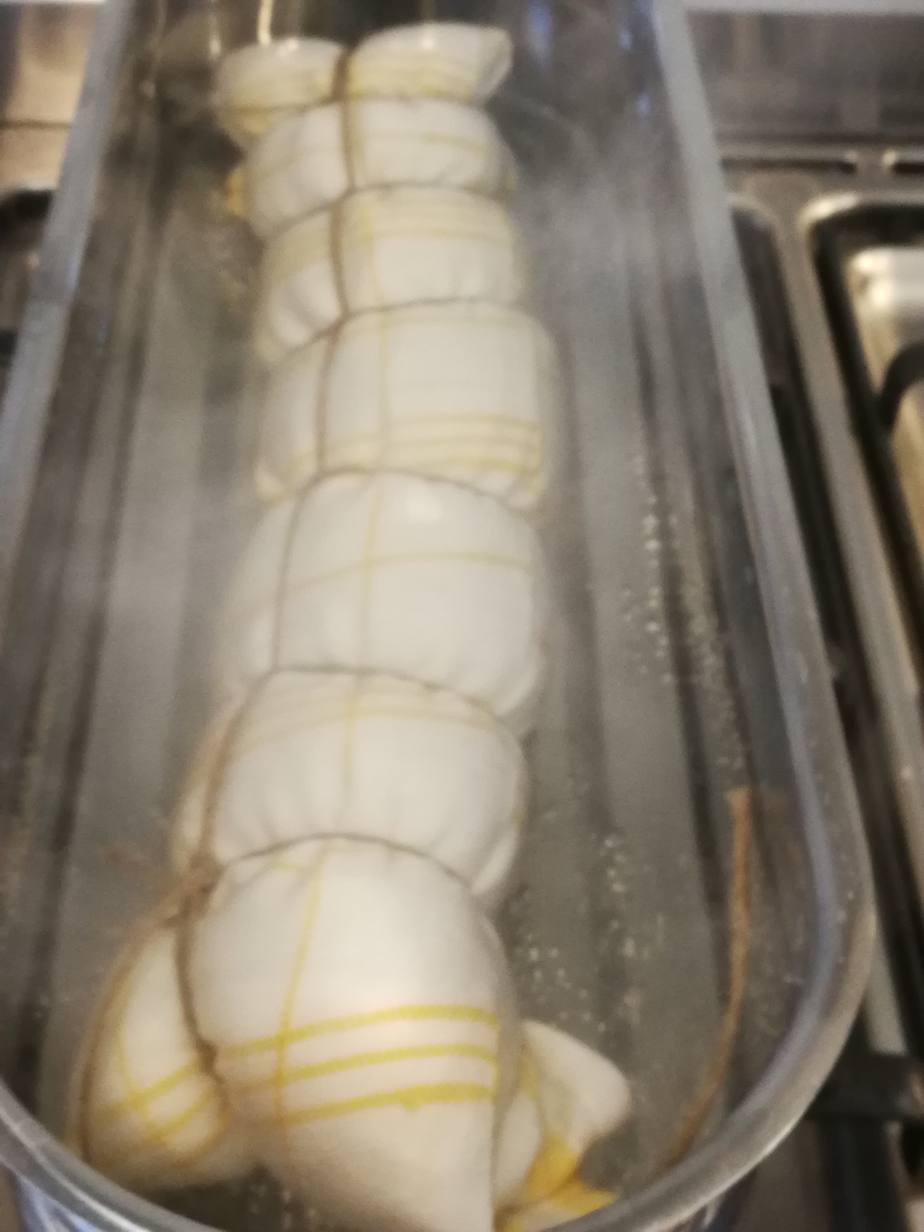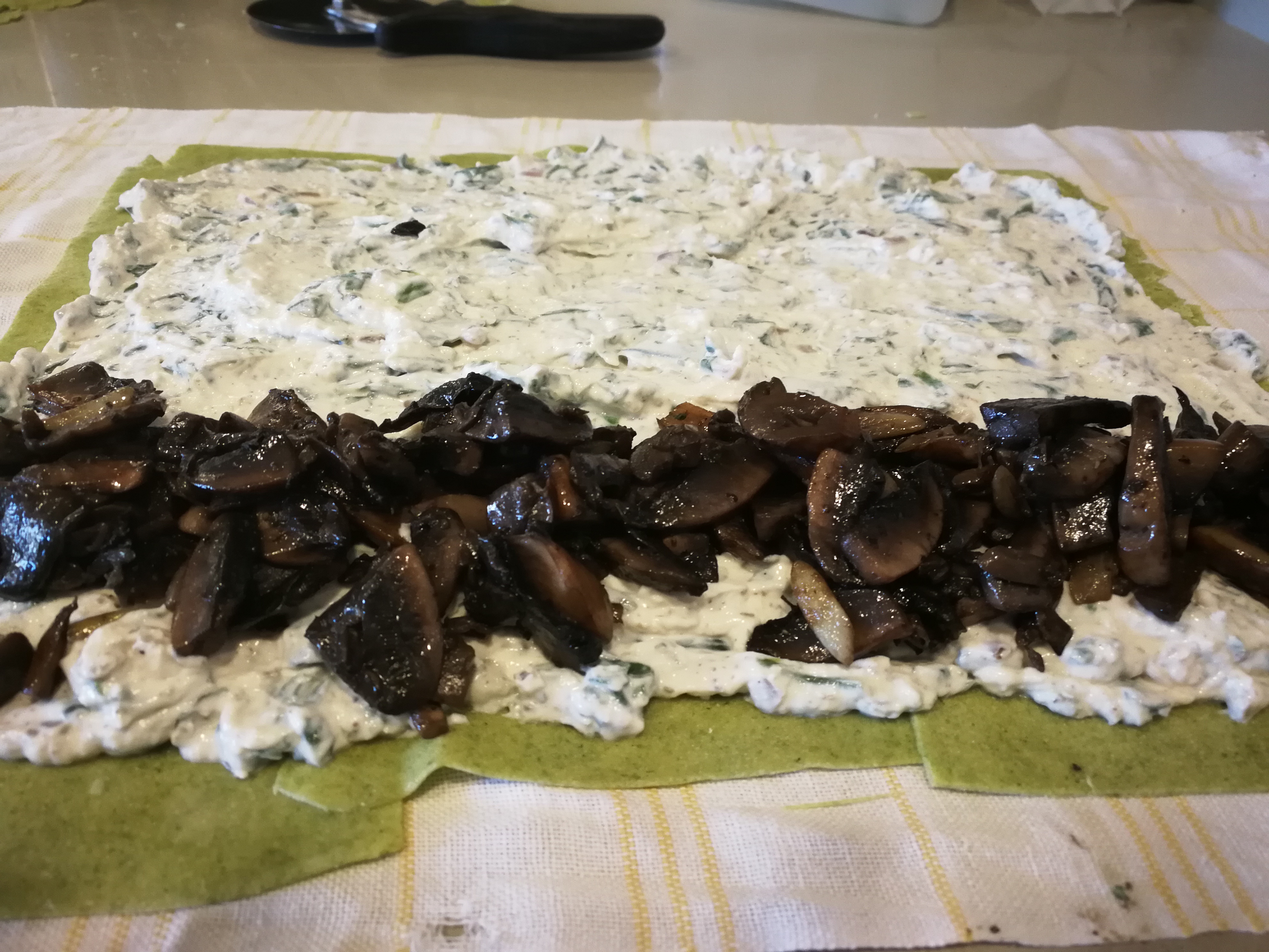 Rotolo is essentially thin sheet pasta, spread with a thick mixture of ricotta, spinach, and a line of fried mushrooms and garlic, rolled tightly in a tea towel, tied up with string like a big sausage and poached for twenty minutes in simmering water, sliced attractively then served with a sauce. It is tastiest with a simple sauce made from butter and sautéed sage leaves. There are baked varieties out there as well, where the rotolo is made, cut into individual portions and then baked in a tomato based sauce in the oven: Al forno.
