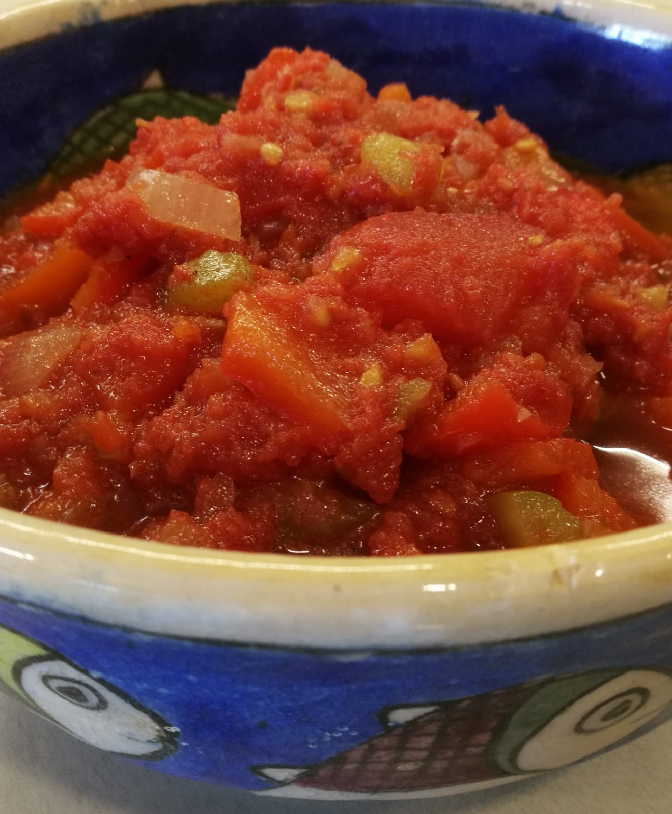 Red peppers and Hot pepper on a tray on oven paper in the oven. Temp.180 C until skin darkens and starts to separate from the flesh. Take out of oven and place in supermarket plastic bag (if you still have them) and tie tightly closed. This makes for easy peeling of the peppers. While the peppers are in the oven chop the onion into large Brunoise cubes, spot of oil in a small pot, on a low heat fry gently for a minute or two until they start to clarify. Set aside. Put whole tomatoes in boiling water, peel cube roughly, set aside. Peel peppers and cube flesh. Hot pepper peel and chop finely (add as much as you want depending on how hot you want it, I would start off with half and taste before adding more).