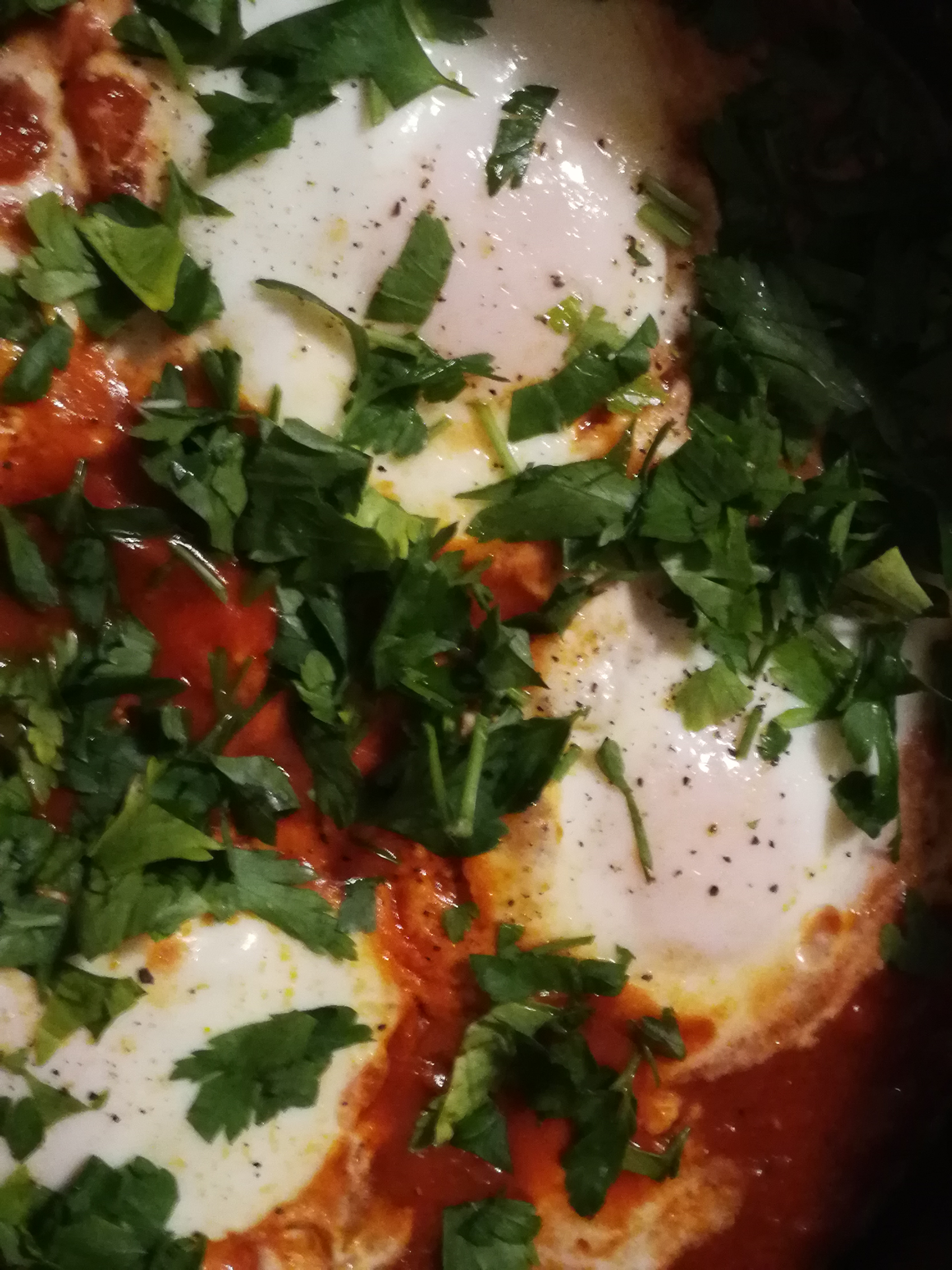 When eggs are done to your preferred readiness remove the lid and place the pan on a board in the centre of the table. Sprinkle parsley over the shakshuka and serve.