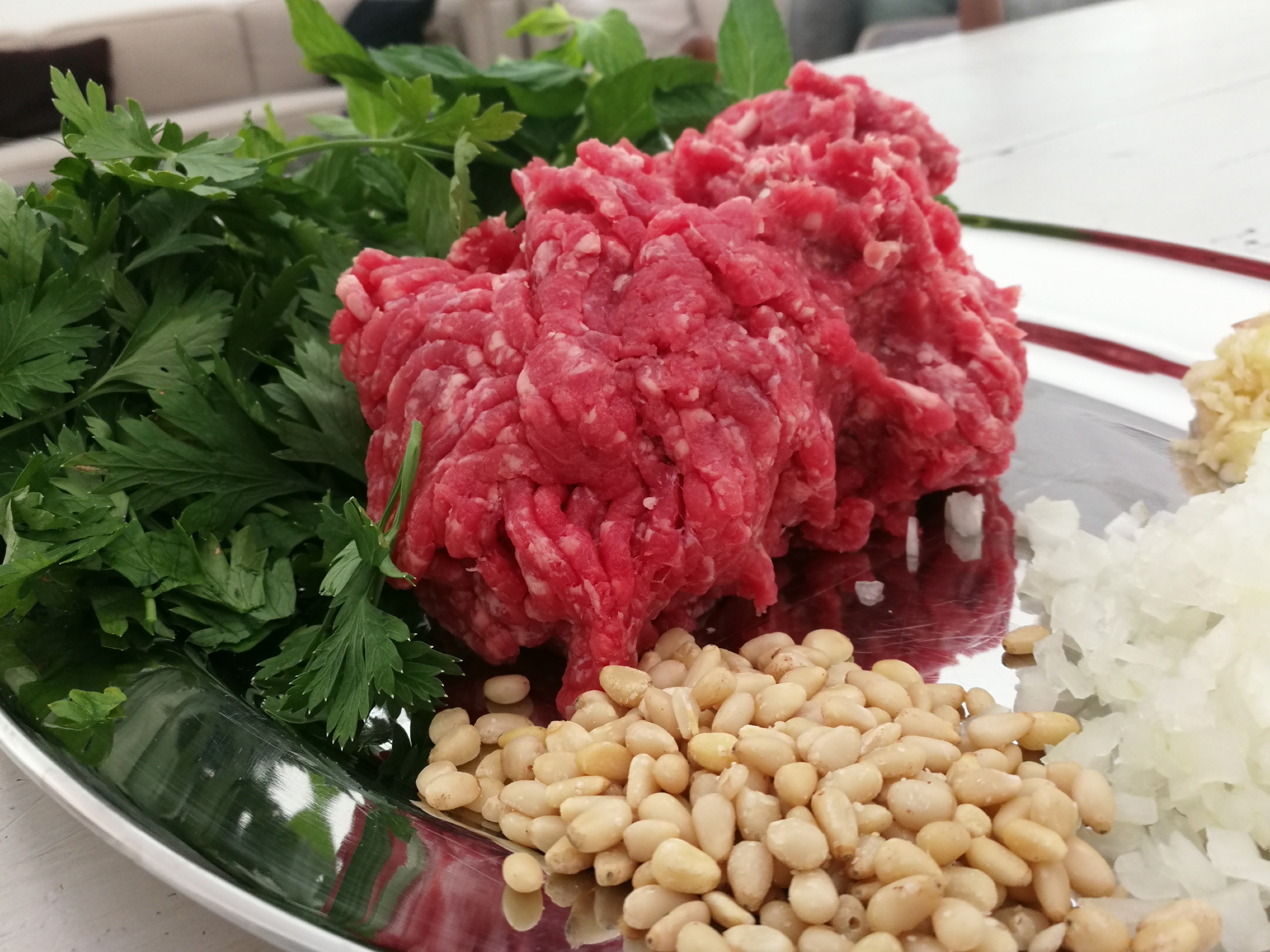 Sheesh Kebab or ground beef (mince) on a metal skewer is a mainstay of the Mid. East. It conjures up images of sleazy, smokey eateries in the noisy dirty Shuks and Bazaars of big cities around the Levant. Umm Kulthum pumping out of the alleyways, Hustle, Bustle, mindless tour groups going everywhere and nowhere, uncertain hygiene (you never know if you’re being ripped off).