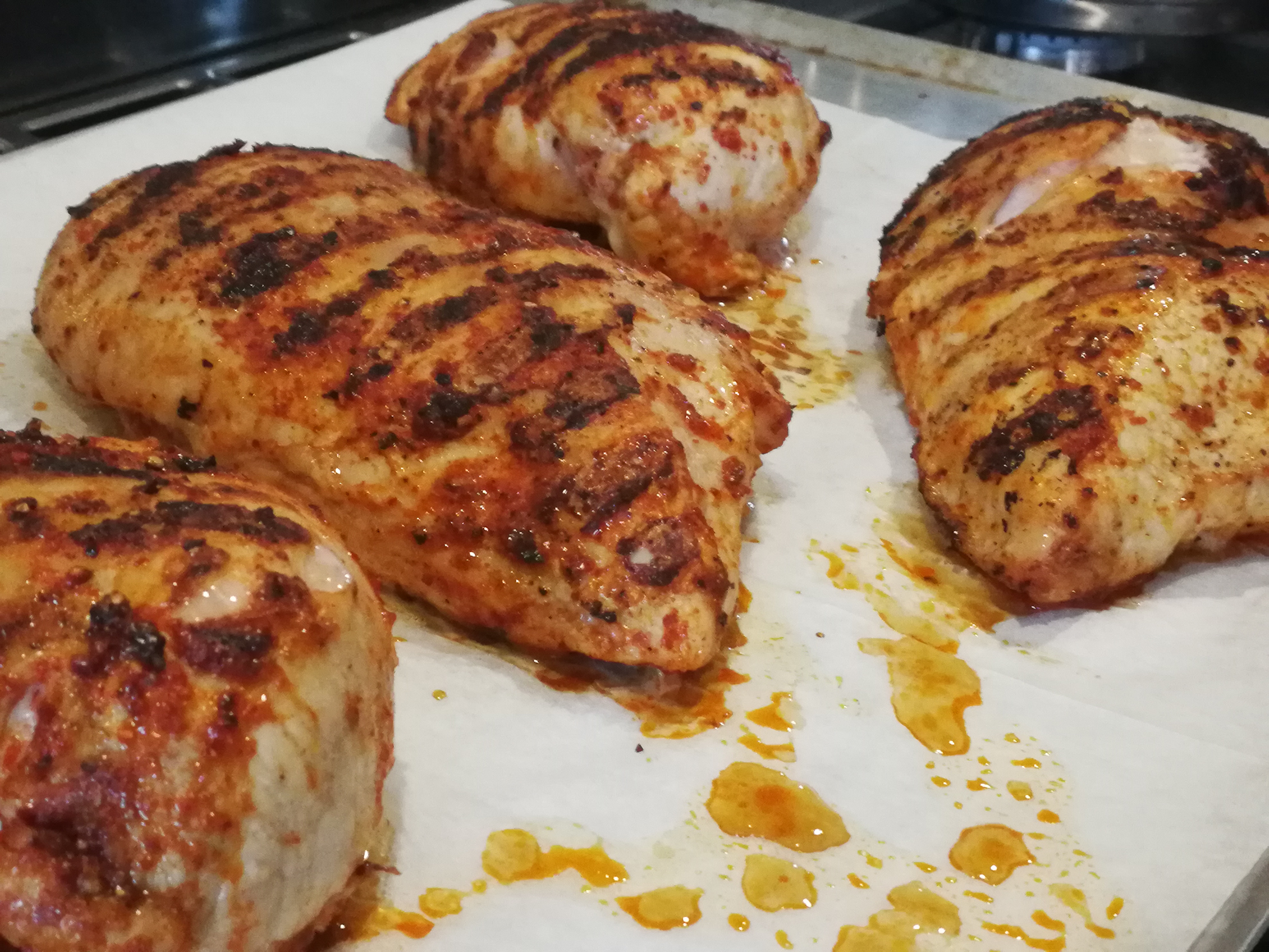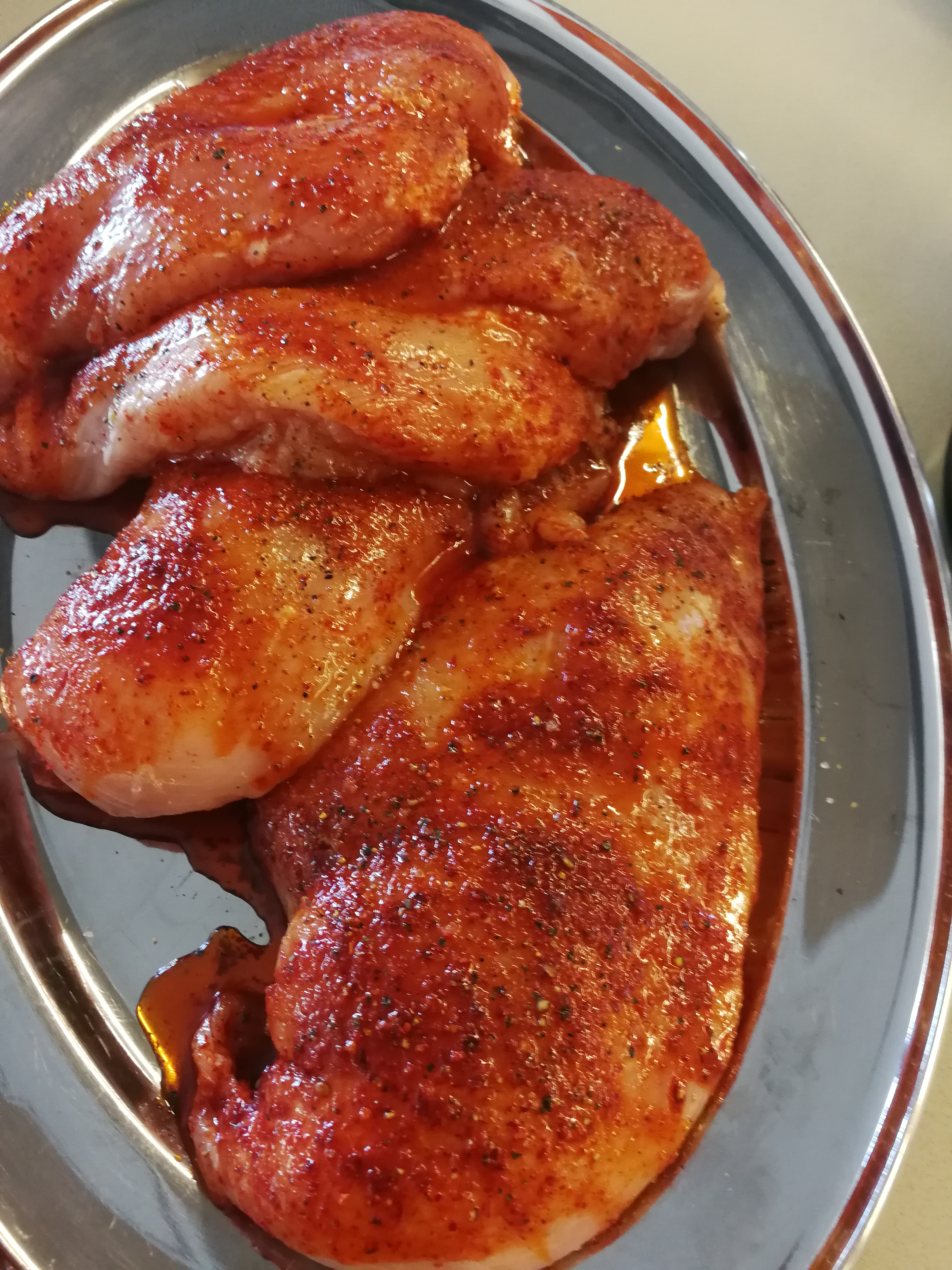Put oil, salt, pepper and paprika into a bowl, mix well using a fork. Add the chilli flakes if you like a bit of heat (optional). Make sure the chicken breasts are clean of any bones, gristle and excess fat. Add the chicken breasts and ensure they are well coated with the marinade mixture. Cover with Glad wrap and return to the fridge for at least an hour.