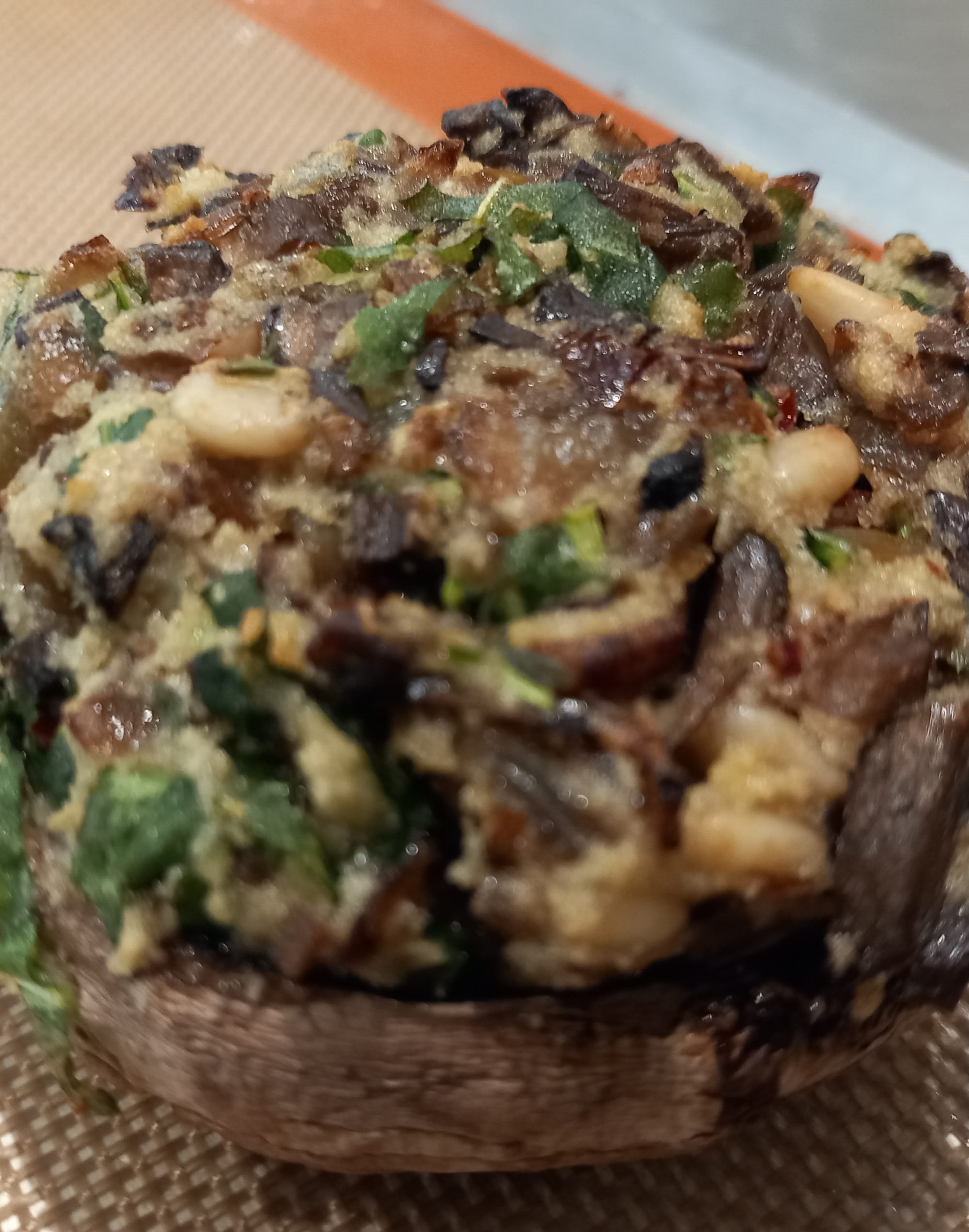 If you want to be clinical, peel the skin off the Portobello mushrooms. I generally leave them. Spoon an equal portion into each mushroom and push into the cavity of the mushroom.