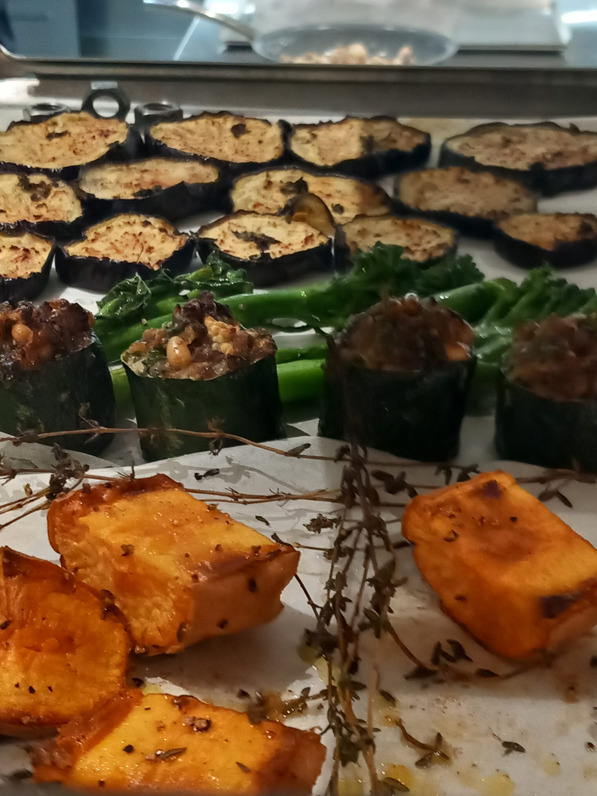 Spoon the filling evenly back into the zucchini shells and lightly press down with a teaspoon. Pre-heat the oven to 200°C (without fan). Place the stuffed zucchini on a baking tray and bake until ready, about 15–20 minutes.
