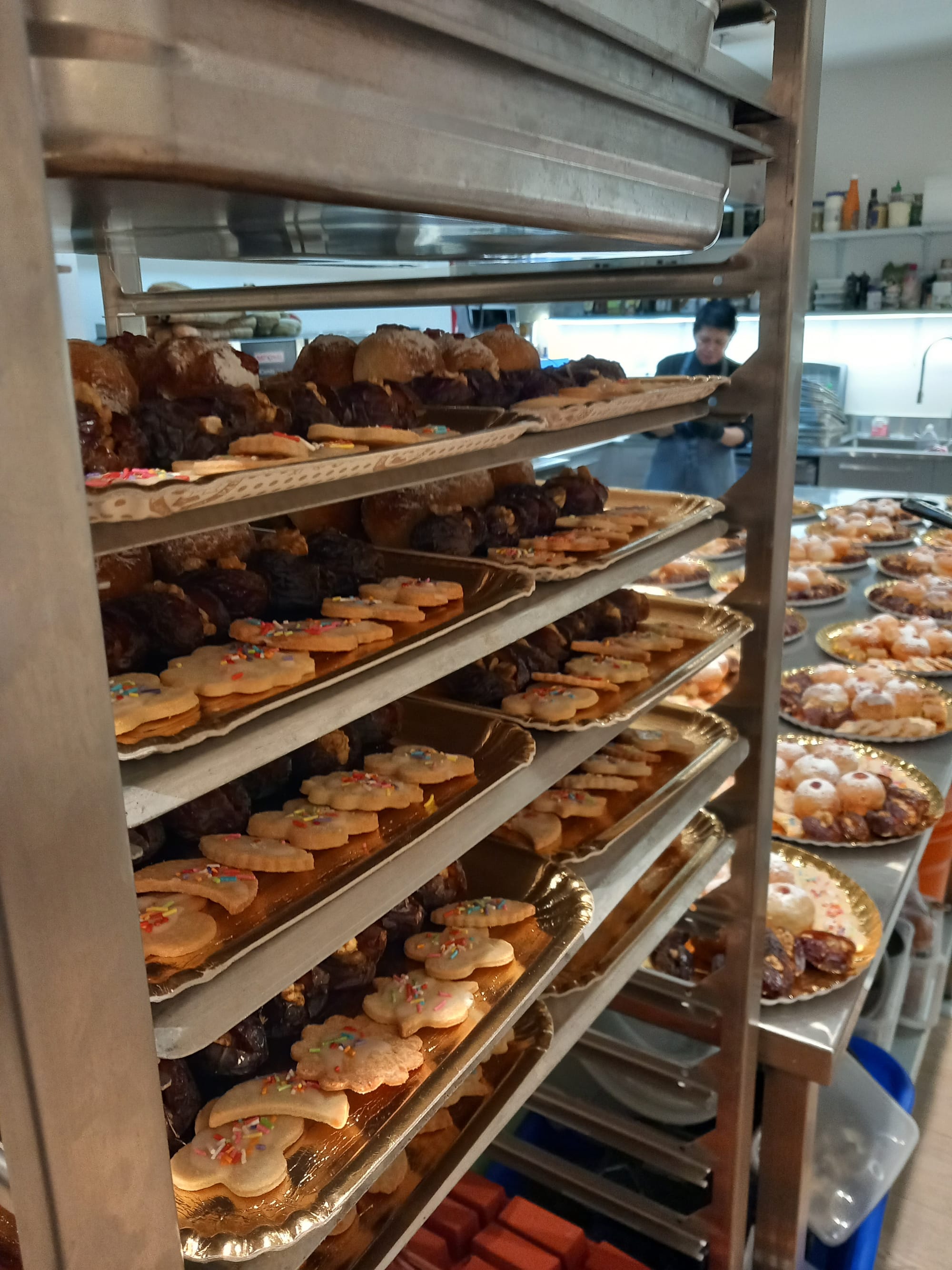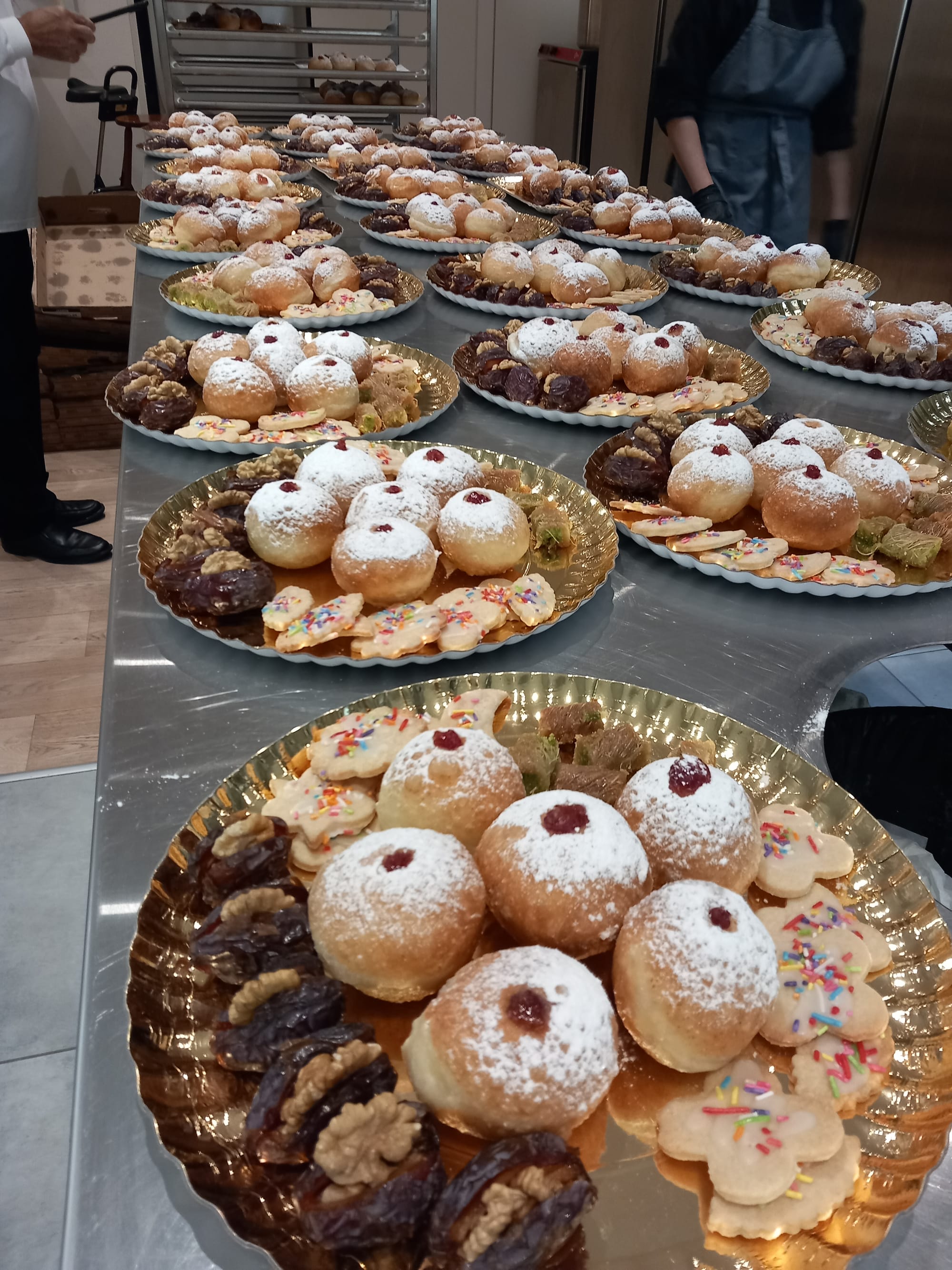 Israel becomes the land of deep-fried foods during Chanukah: latkes (a grated potato, carrot and onion patty) are the symbolic savory food and sufganiyah, a deep fried doughnut filled with jam and dusted with icing sugar, is the symbolic sweet.