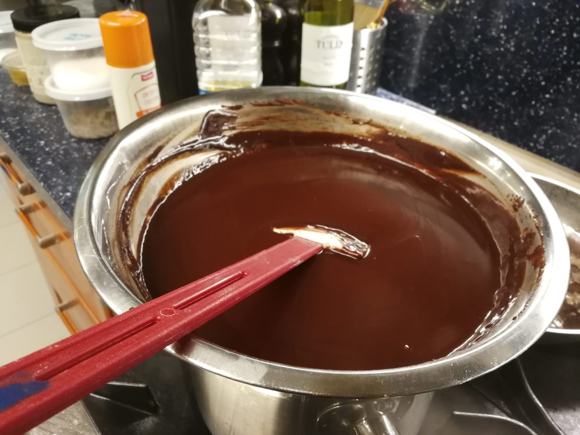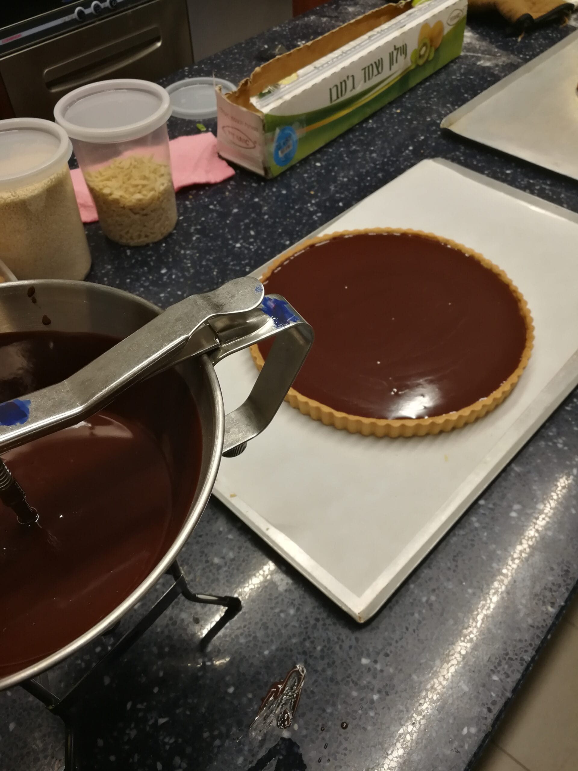 Stir occasionally. When the chocolate and cream have completely combined and the mixture has gone dark in colour and become a smooth and silky liquid, pour using a jug into prebaked short crust pastry shell.