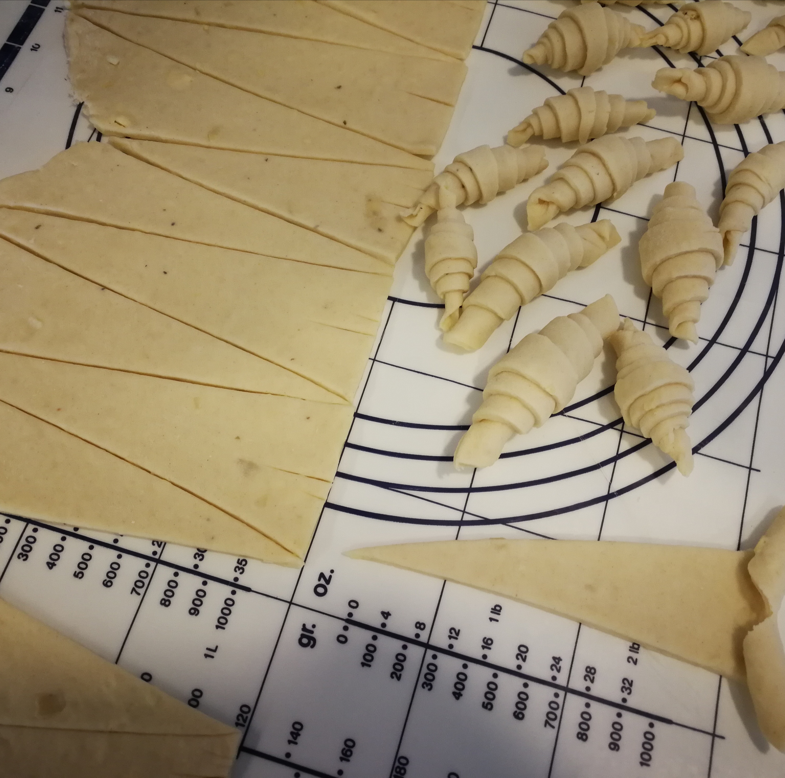 Cheese mini croissants are made using a mixture of regular flour, butter, white cheeses, hard cheeses and baking powder as the rising agent. They are rolled out, cut and rolled up exactly as you would when making a regular fancy French croissant, hence the name.