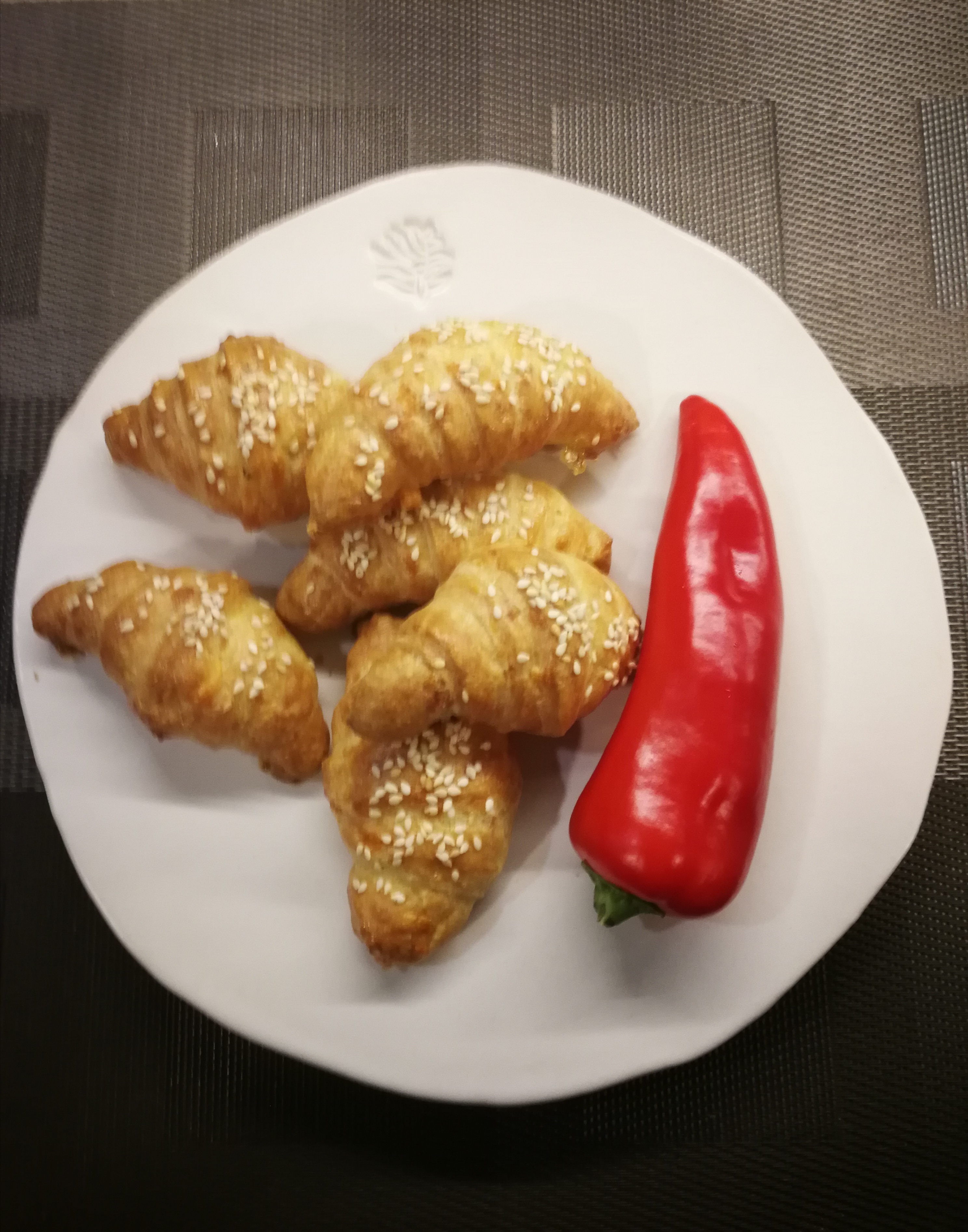 Place the mini croissants on baking paper on an oven tray, with a bit of distance between them as they will rise; brush with egg wash. If you want to sprinkle something such as sesame seeds or chilli flakes, this is the time.