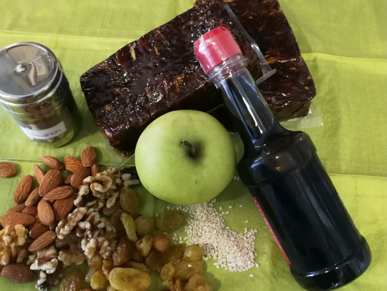 In the Middle East, charoset is made from dates, apples, raisins, nuts and pomegranate juice. All ground together it makes a sweet, sticky and tasty spread to enjoy your matzah with. It is symbolic of the mortar and bricks that were used by the Hebrew slaves to construct the giant edifices built during their time in bondage in pharaonic Egypt.