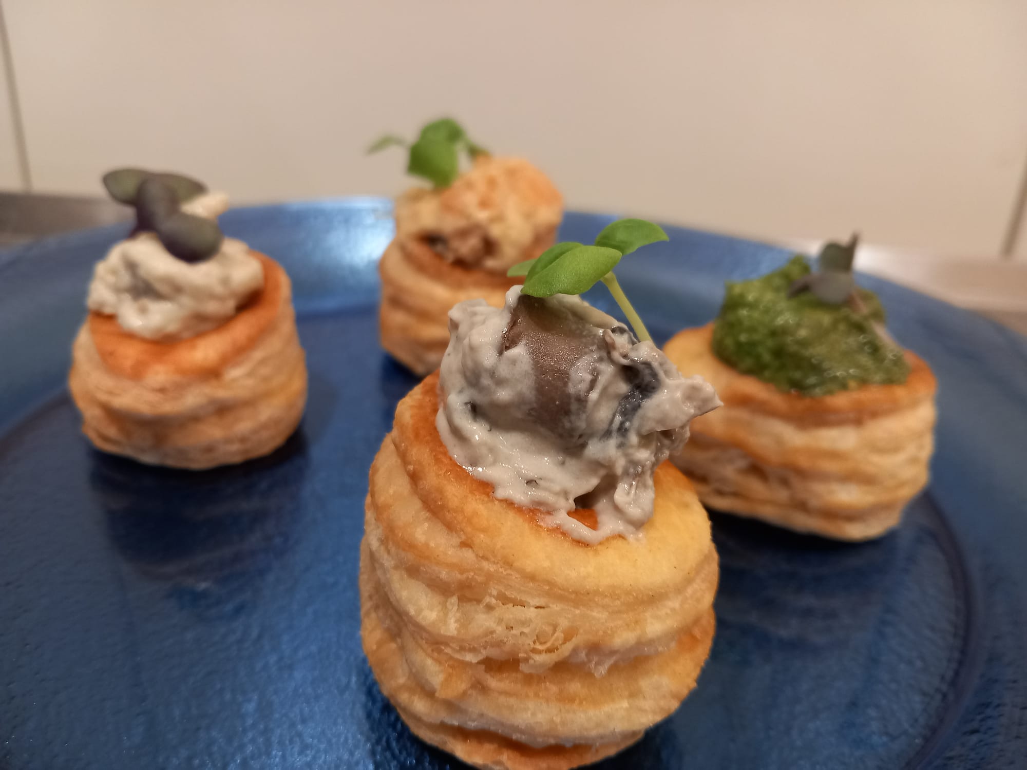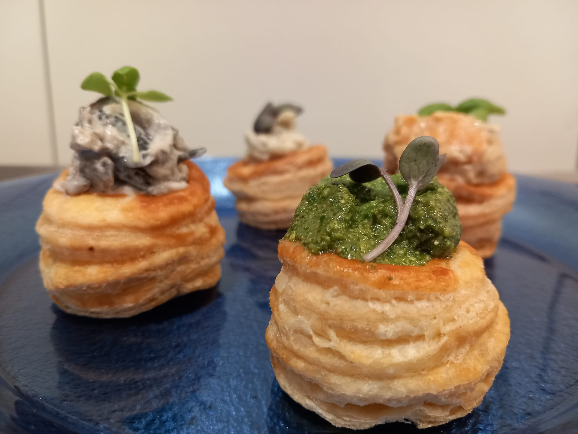These can be filled with pesto, gravlax or baba ganoush, or you can make a mushroom or batata and cream sauce for hot fillings. Pop in half a cherry tomato with a basil leaf or a slice of smoked chicken with cherry tomato chutney. The vol-au-vent is your vessel, the filling is your imagination.