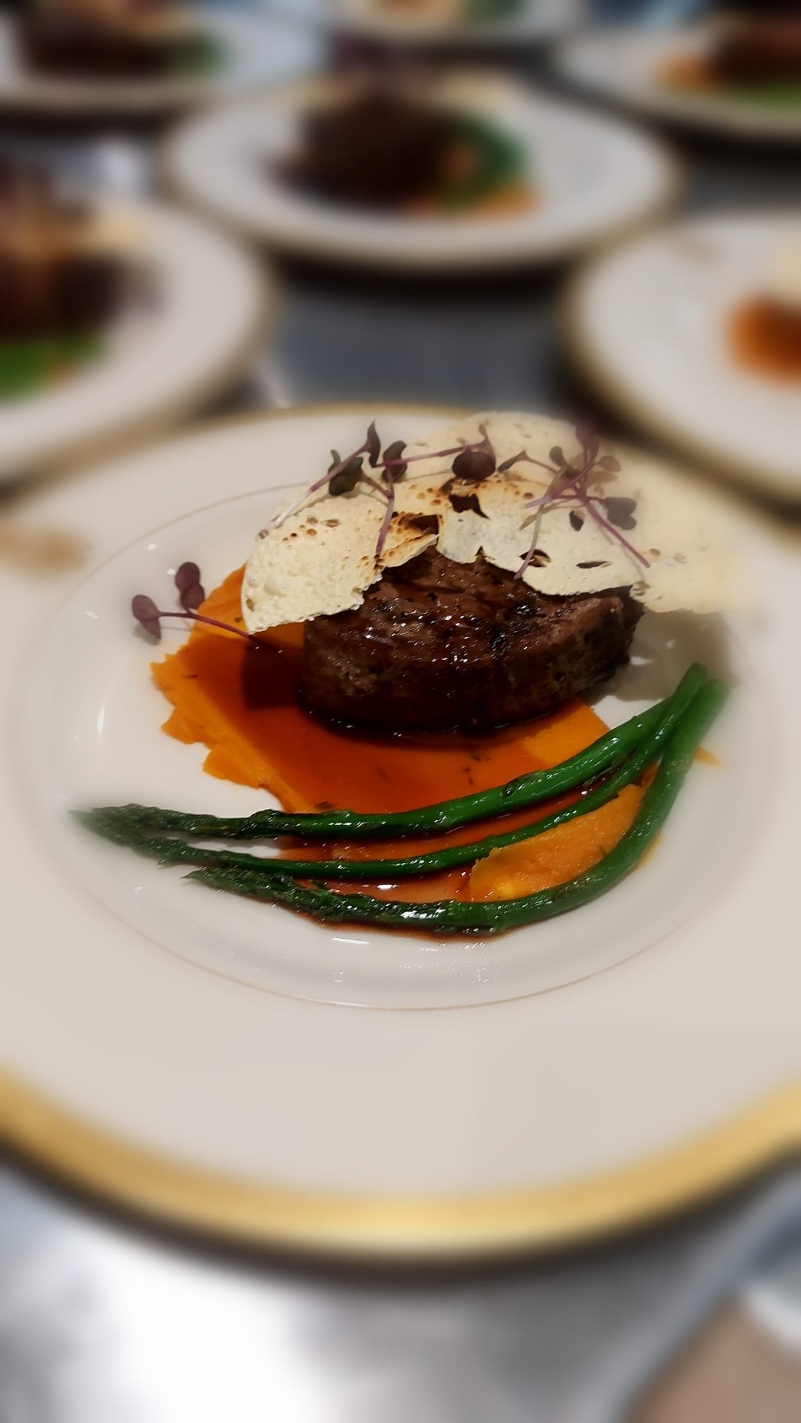 Filet mignon topped with papad [poppadum], red wine and pomegranate sauce on sweet potato cream with asparagus spears.