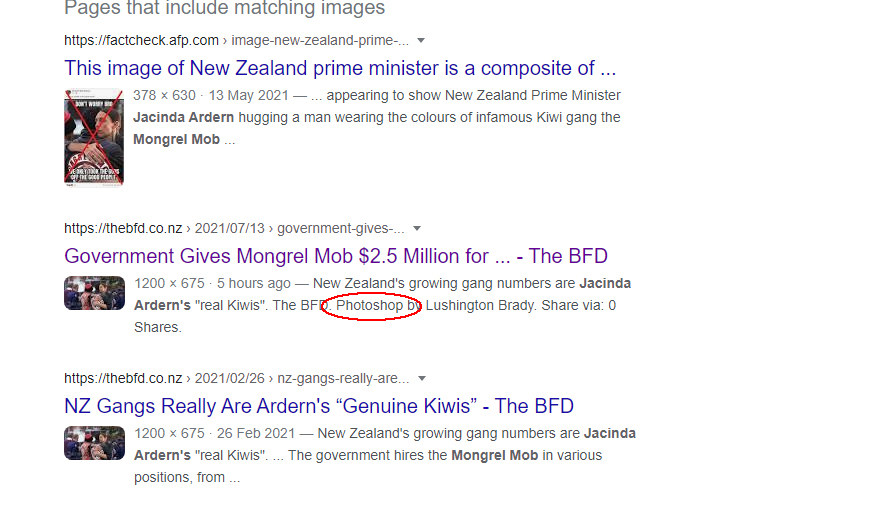 Dropping the image of Ardern hugging the gang member immediately brings up results – which should have tipped off the AFP journalists.