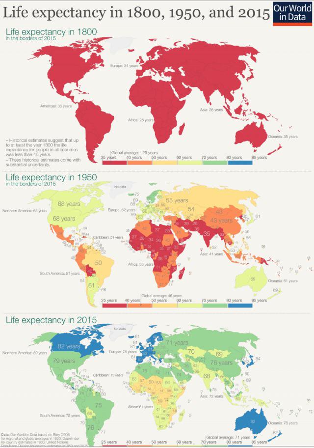 The BFD Map of the Day: Life expectancy in 1800, 1950 & 2015
