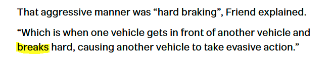 The term is actually “brake checking” (a deliberate act to force the vehicle following to brake hard and maybe take evasive action)